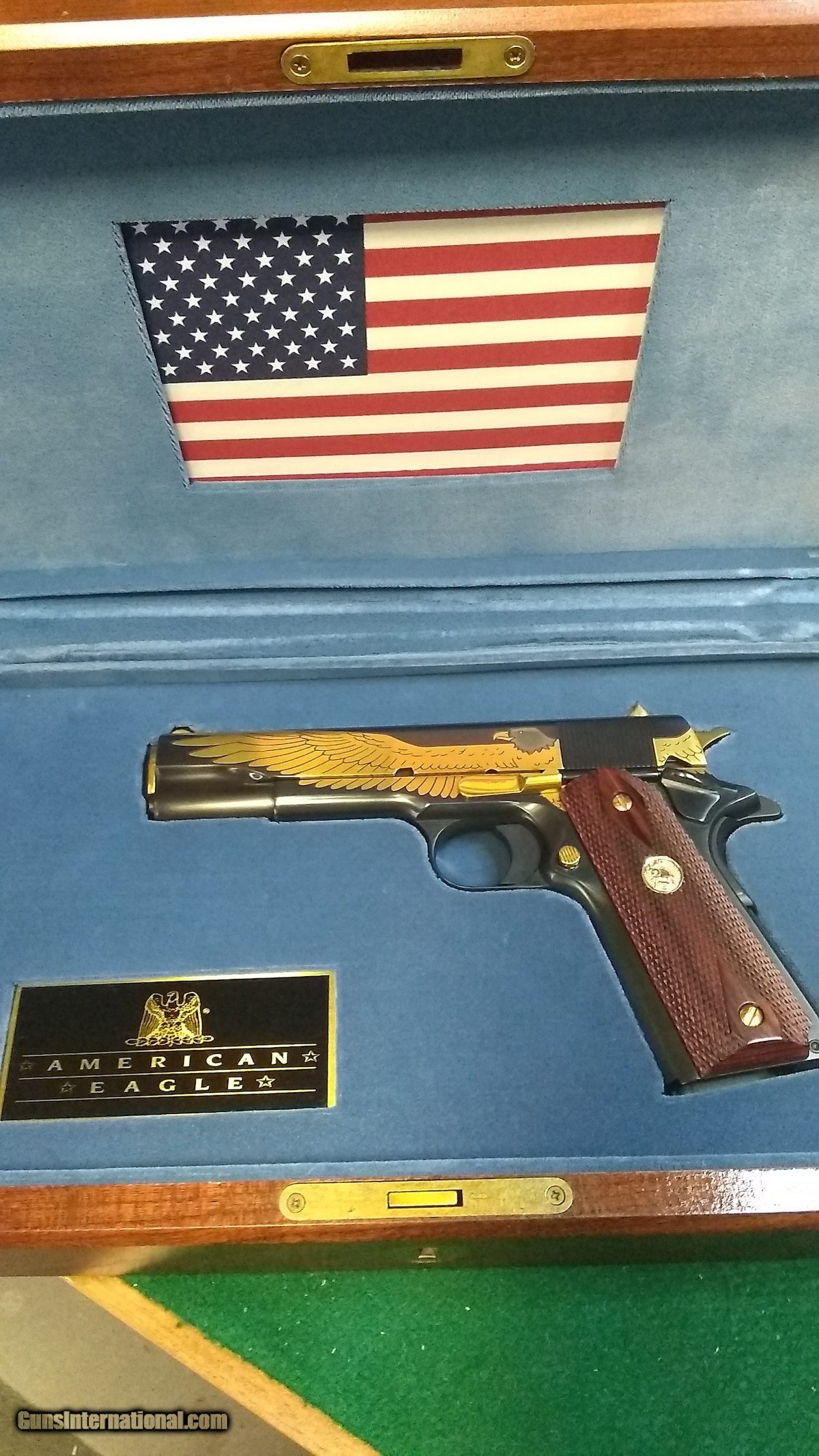 Description: Guns Listing ID: 582769 This gorgeous Colt made 1911 A1 is an American Eagle commemorative gun. It is chambered in .45ACP with a 5\" barrel. This particular gun is number 987 of the 2500 that were ever made. Comes with a wooden display case as well as the original Colt box and a certificate of authenticity from America Remembers. Gun is in excellent condition. SOLD Manufacturer: COLT Model: 1911 A1 American Eagle Caliber Info: .45 ACP Condition: Used - Non-Certified Barrels: 5 BARREL Finish: BLUE STEEL |