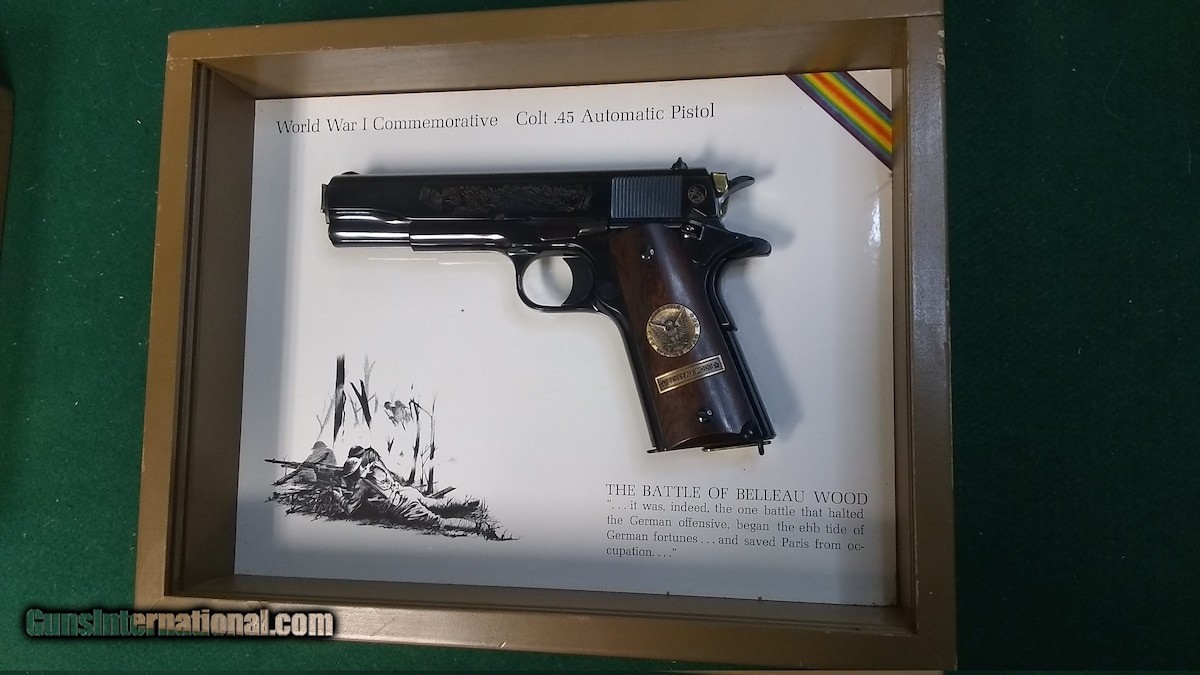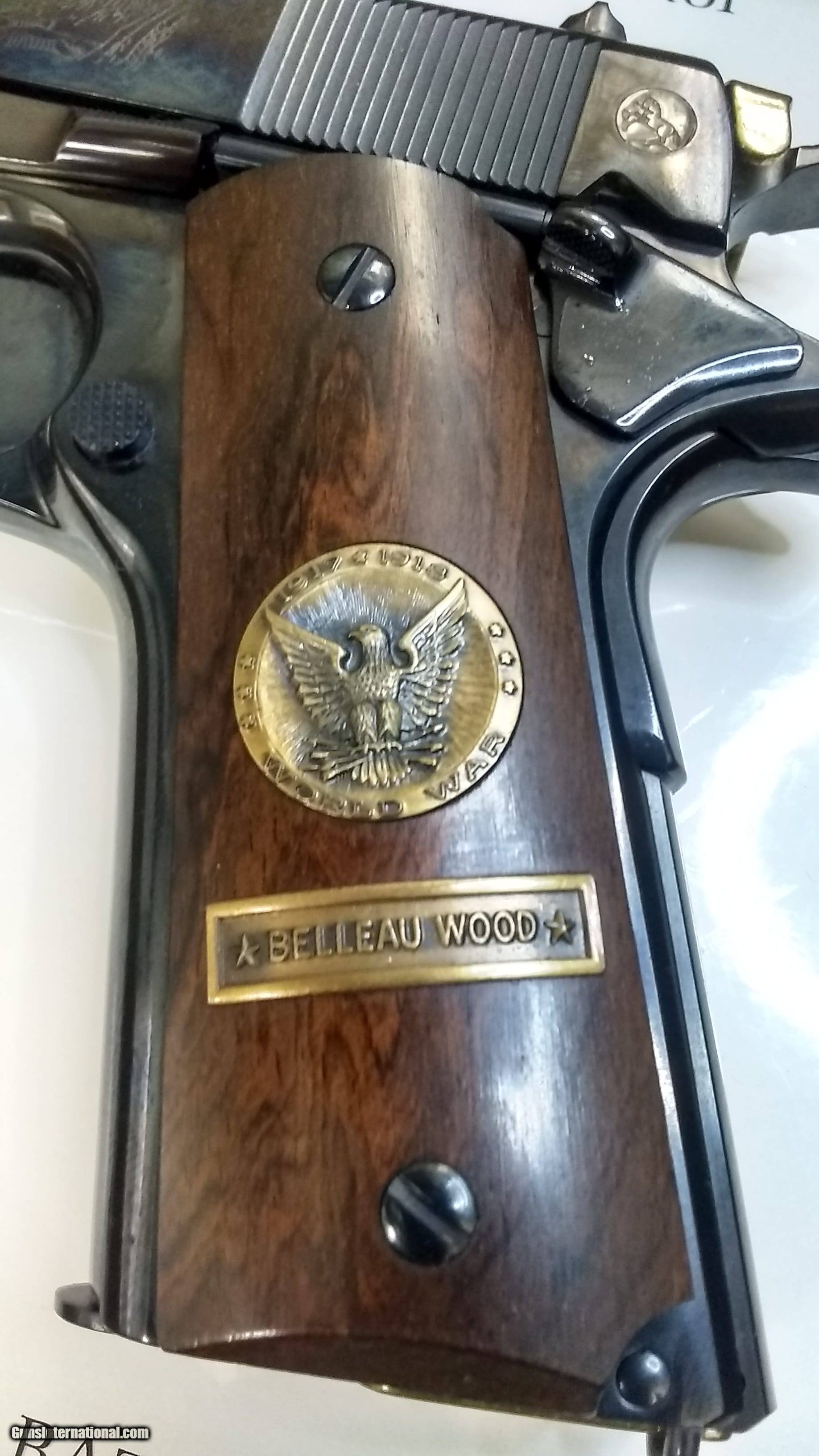 Description: Guns Listing ID: 395836 This Colt 1911 is dedicated to the Battle of Belleau Wood. It has a blued finish, 5" barrel, mil spec sights. The slide is engraved and there are medallions in the walnut grip panels. Shipped with display case. Gun is in perfect condition. SOLD Manufacturer: COLT Model: 1911 Battle Of Belleau Wood Caliber Info: .45 ACP Condition: Used - Non-Certified Barrels: 5 BARREL Finish: BLUE STEEL |