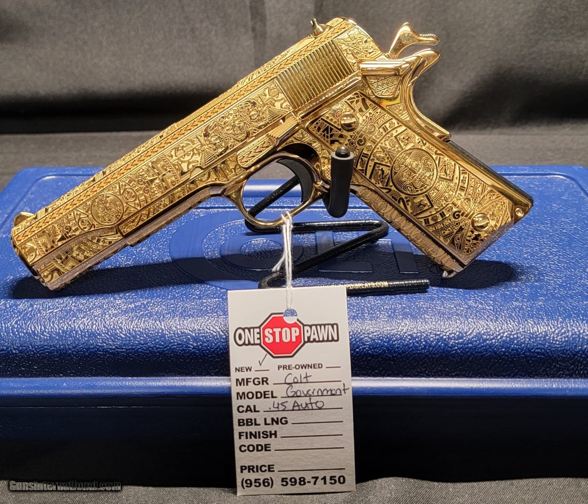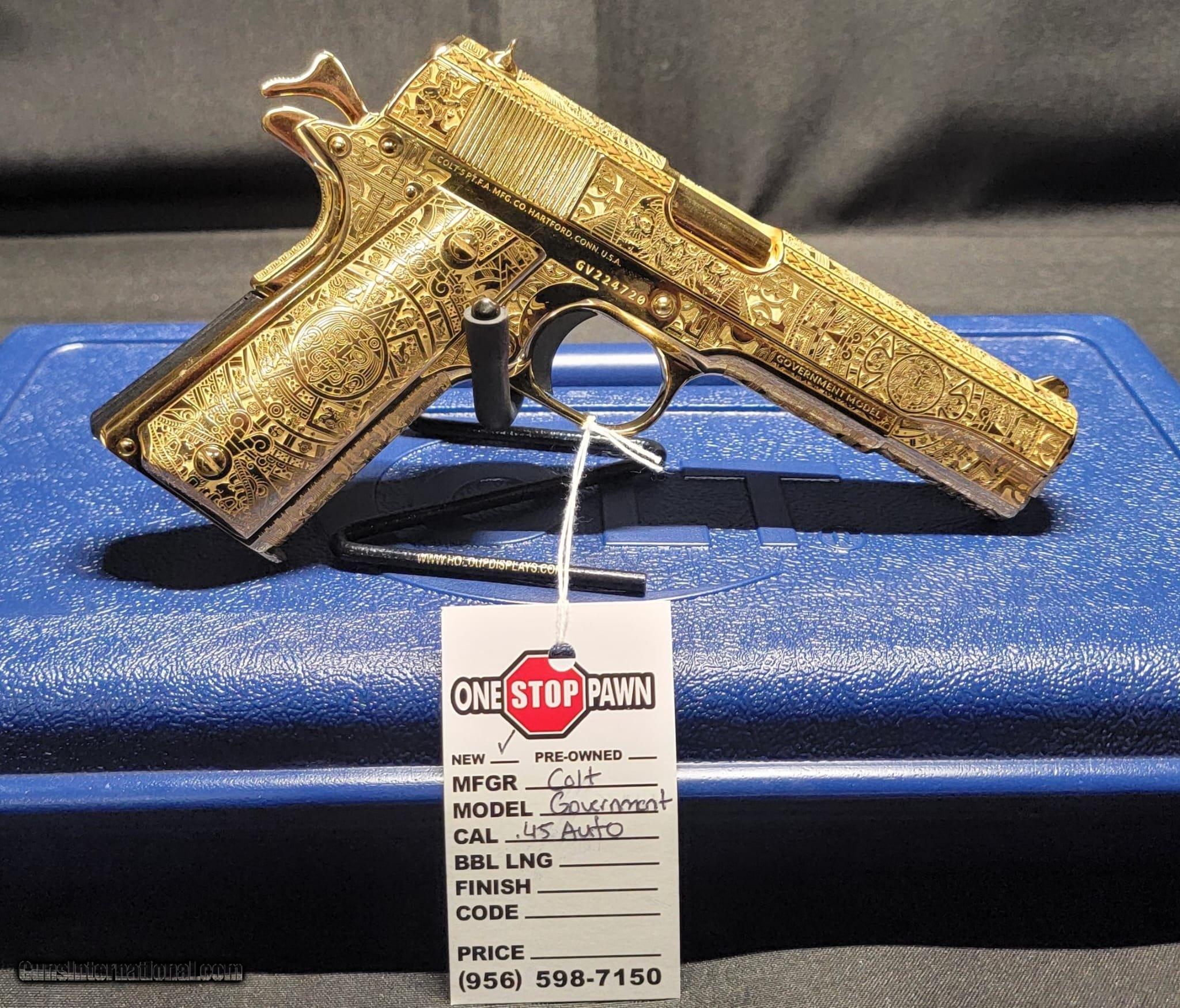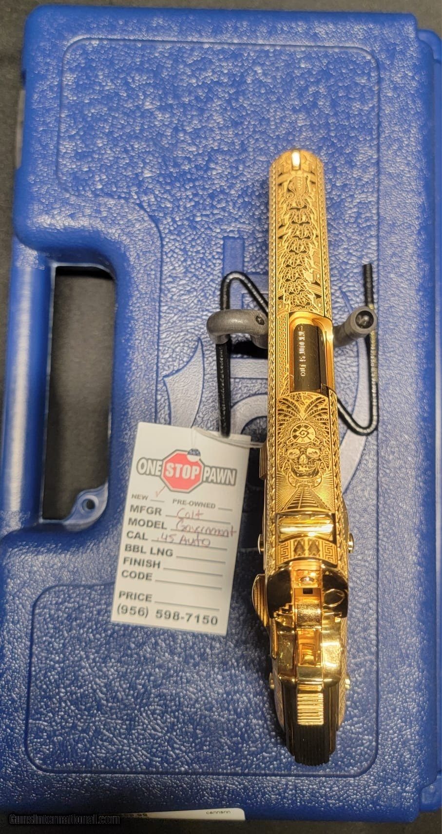 Description: Guns Listing ID: 375853 NEW!!! IN ORIGINAL BOX 1 MAG 24K PLATED ENGRAVED SOLD Manufacturer: COLT Model: 1911 COLT GOVERNMENT MODEL Caliber Info: .45 ACP Condition: Used - Non-Certified Barrels: 4.5 BARREL Action: SEMI AUTOMATIC Finish: GOLD PLATED Weight: not specified |