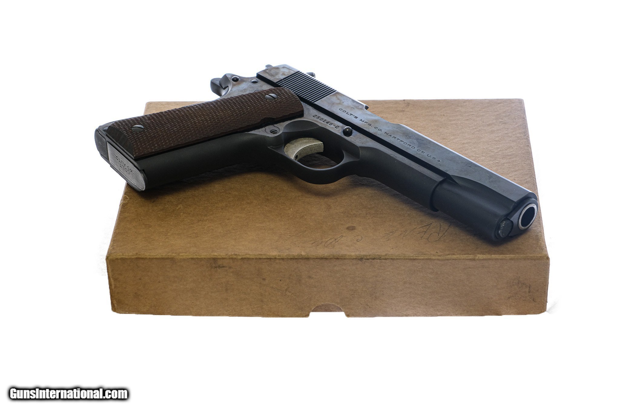 Description: Colt - 1911 Commercial Government Model, Blued Finish, .45 ACP. 5" Barrel. Wood grips, 1951 manufacture, 98% condition, super clean and near perfect, includes factory Colt magazine, carboard box with label, wax paper wrap, cleaning rod, and instruction sheet. Inv: 80813 $1,999.00 SOLD |