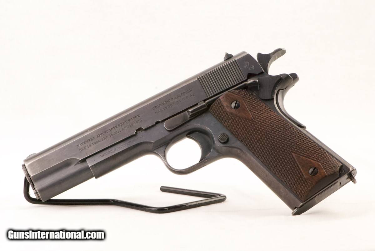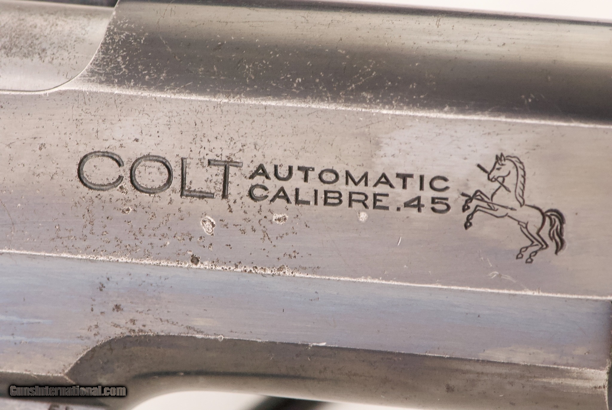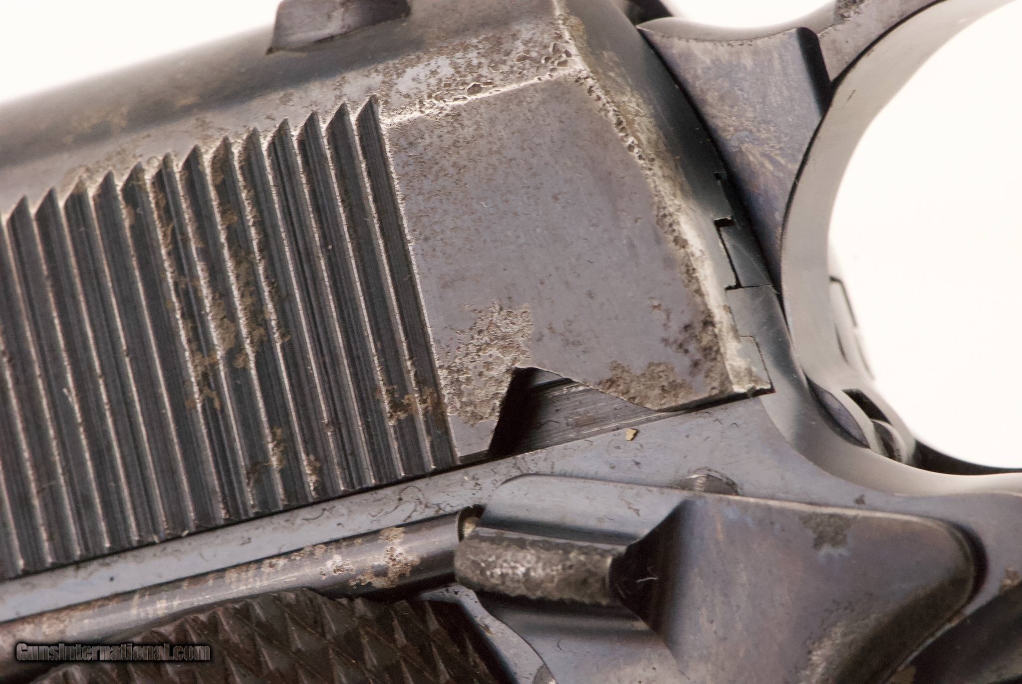 Description: Guns Listing ID: 38333 This 1911 Government Model from Colt is a 1927 production handgun made for the commercial market. This is shown by the lack of military inspection marks and the location (forward of the ejection port) and type (iteration 7) of Colt Emblem used. This combined with the ordnance acceptance mark "S" on the barrel prove its 1927 date on manufacture and its commercial lineage. Bore is very good with strong rifling and the finish is fair with pitting on the left rear of the slide and wear marks around the ejection port. SOLD Manufacturer: COLT Model: 1911-Dated 1927 Caliber Info: 45 ACP Condition: Used - Non-Certified Barrels: 5 BARREL Finish: BLUED |