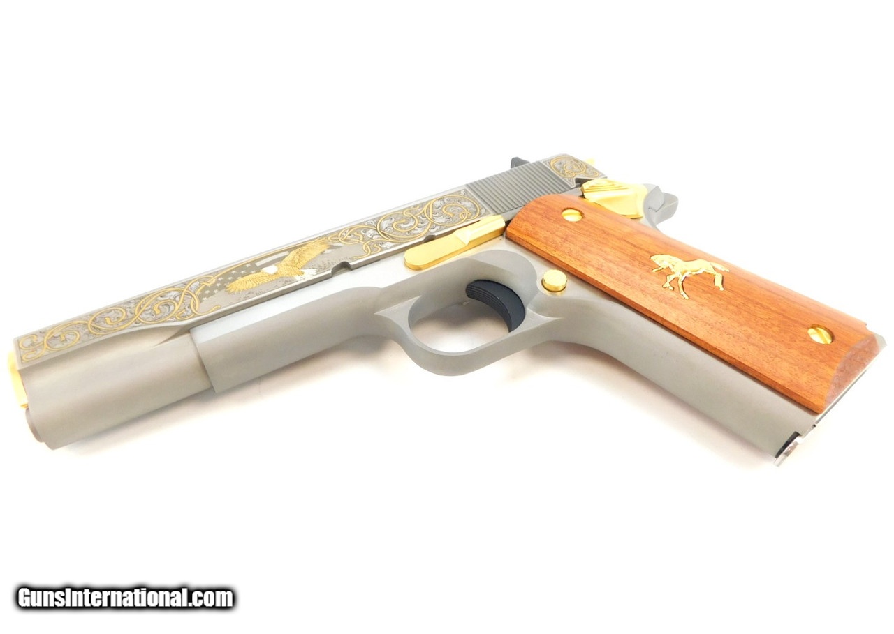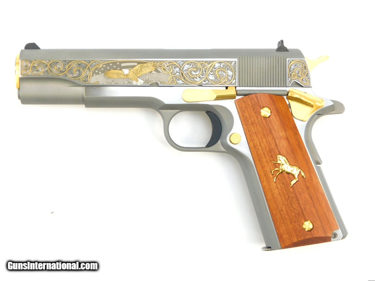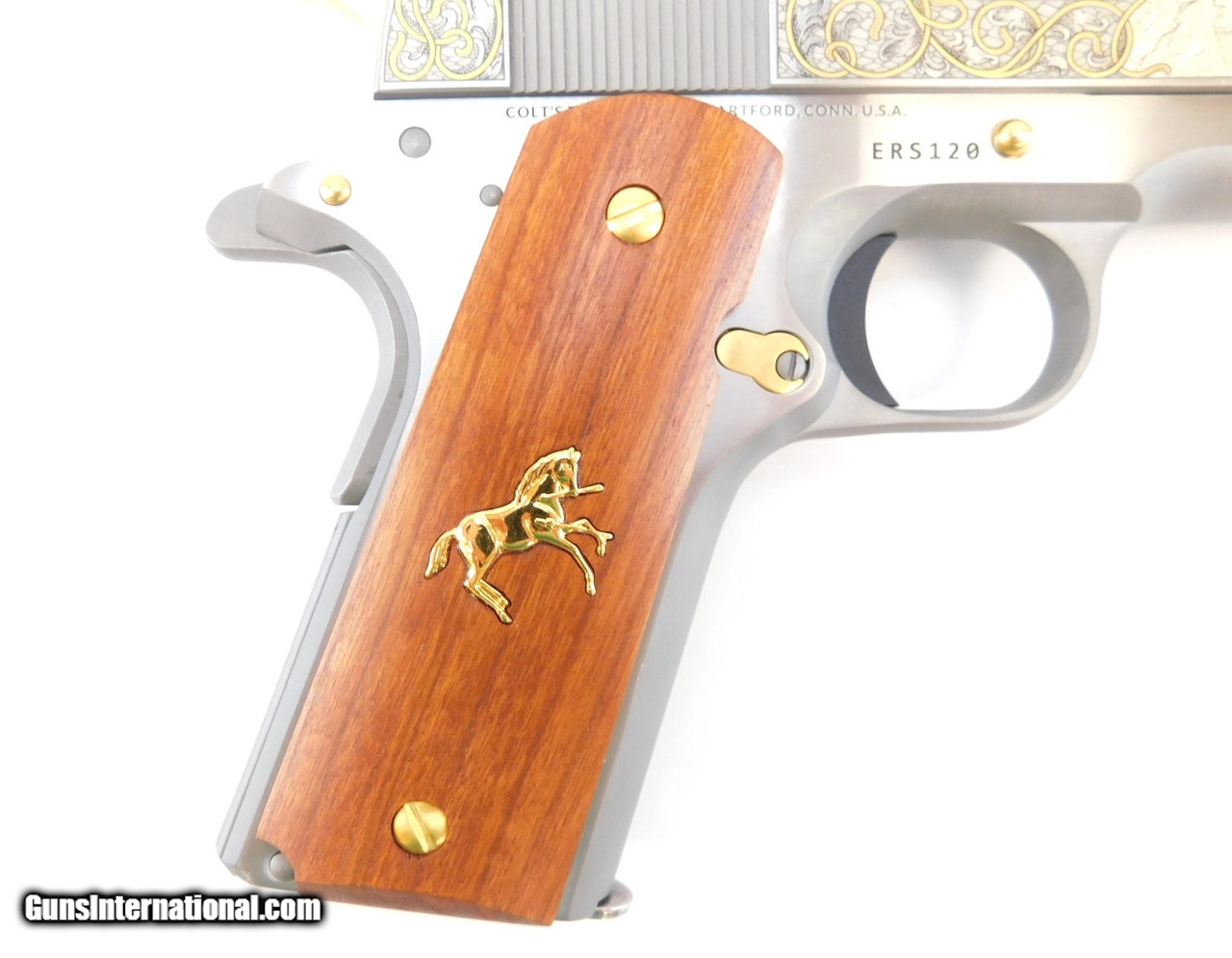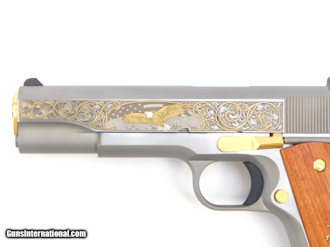 Description: Manufacturer: Colt's Manufacturing LLC Model: 1911 ERS Stainless Spirit of America Edition - TALO The Spirit of America Edition is a one-of-500 limited edition with an ERS serial prefix denoting the eagle, Rushmore, and the stainless finish. SKU: O1911C-SS-ERS Caliber: .45 ACP / AUTO Capacity: 7 Rounds Barrel Length: 5" Frame & Slide: Brushed Stainless Steel, Engraved Overall Length: 8.5" Sights: Fixed Grips: Cherry Wood Weight: 35 oz The left side of the pistol features an American Bald Eagle soaring gracefully above the Rocky Mountains with Old Glory waving subtly above the horizon. The right side of the slide is engraved with an artist’s rendering of the Mount Rushmore National Memorial with an American Flag waving proudly in the sky. The scenes also feature 24kt gold and pure silver accents to bring out the brilliance of the art. Both sides of the slide are adorned with a flowing vine scroll that is highlighted with 24kt gold. The background of the scroll features a lightly engraved snake skin, a gentle reminder, “Don’t Tread on Me.” All items are factory new in box unless otherwise stated. Based on the information available to us, the above specifications describe this item to the best of our knowledge. For further information, please contact or visit the manufacturer's . SOLD |