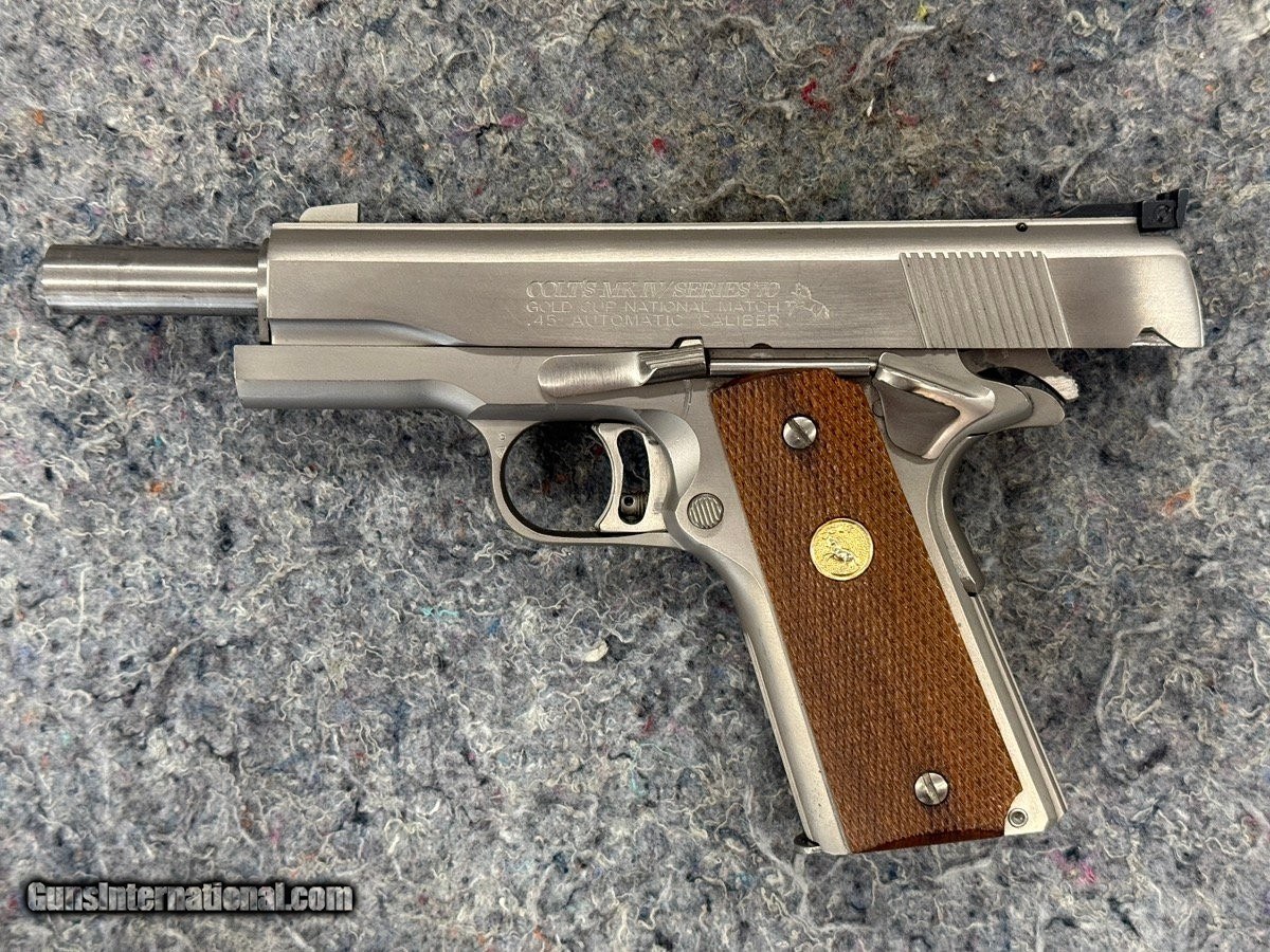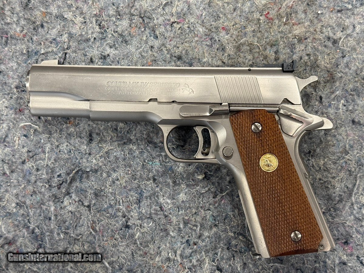 Description: Guns Listing ID: 586559 COLT 1911 GOLD CUP MK IV SERIES 70 (1982) .45 ACP, ELECTROLESS NICKEL FINISH, 1 MAG. VERY GOOD — CRISP SINGLE-ACTION TRIGGER, MATCH-GRADE BARREL, ADJUSTABLE SIGHTS, BEAVERTAIL GRIP SAFETY, EXCELLENT ACCURACY, COLLECTIBLE, CLEAN BORE Manufacturer: COLT Model: 1911 GOLD CUP (5170306) Caliber Info: 45 ACP (45 Auto) Condition: Used - Non-Certified Barrels: ." BARREL Action: SEMI AUTOMATIC Finish: Stainless Price: $2,859.99 Contact Seller |