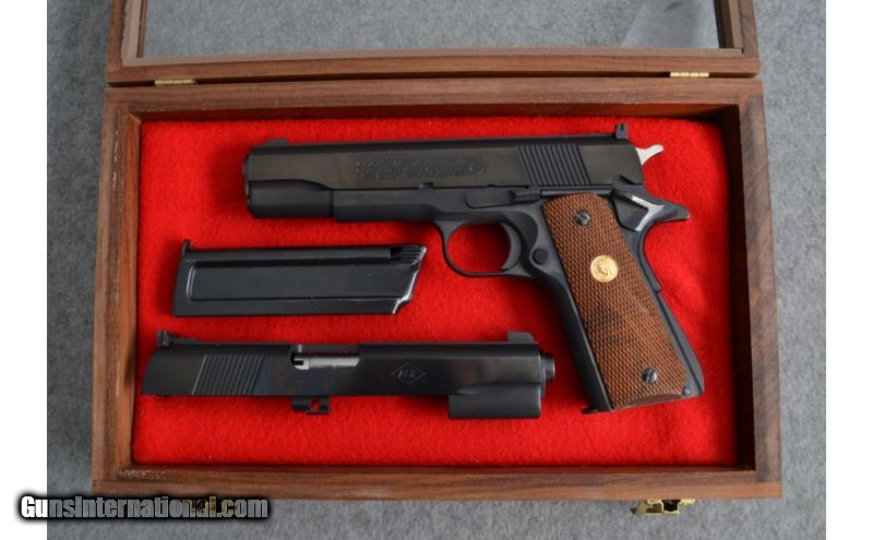 Description: Beautiful Colt Gold Cup with extra ACE conversion slide also. 2 mags included. Comes with nice presentation case. Pistol is in Like new condition. SOLD Manufacturer: S/N SM40XXX Caliber Info: .45 ACP and .22 Long Rifle Chambers: Single action pistol with 7 round capacity Metal Condition: Excellent Wood Condition: Excellent Bore Condition: Excellent Barrels: 5 Inches Stock: Colt checkered wood grips. Weight: 2 Lbs 6 Oz with .45 Slide. Sights: Adjustable rear sight / Blade front sight Extras: With wooden display case and 2 original Colt magazines - 1 Colt .45 ACP mag and 1 Colt .22 LR mag. Item Location: Lone Tree, CO |