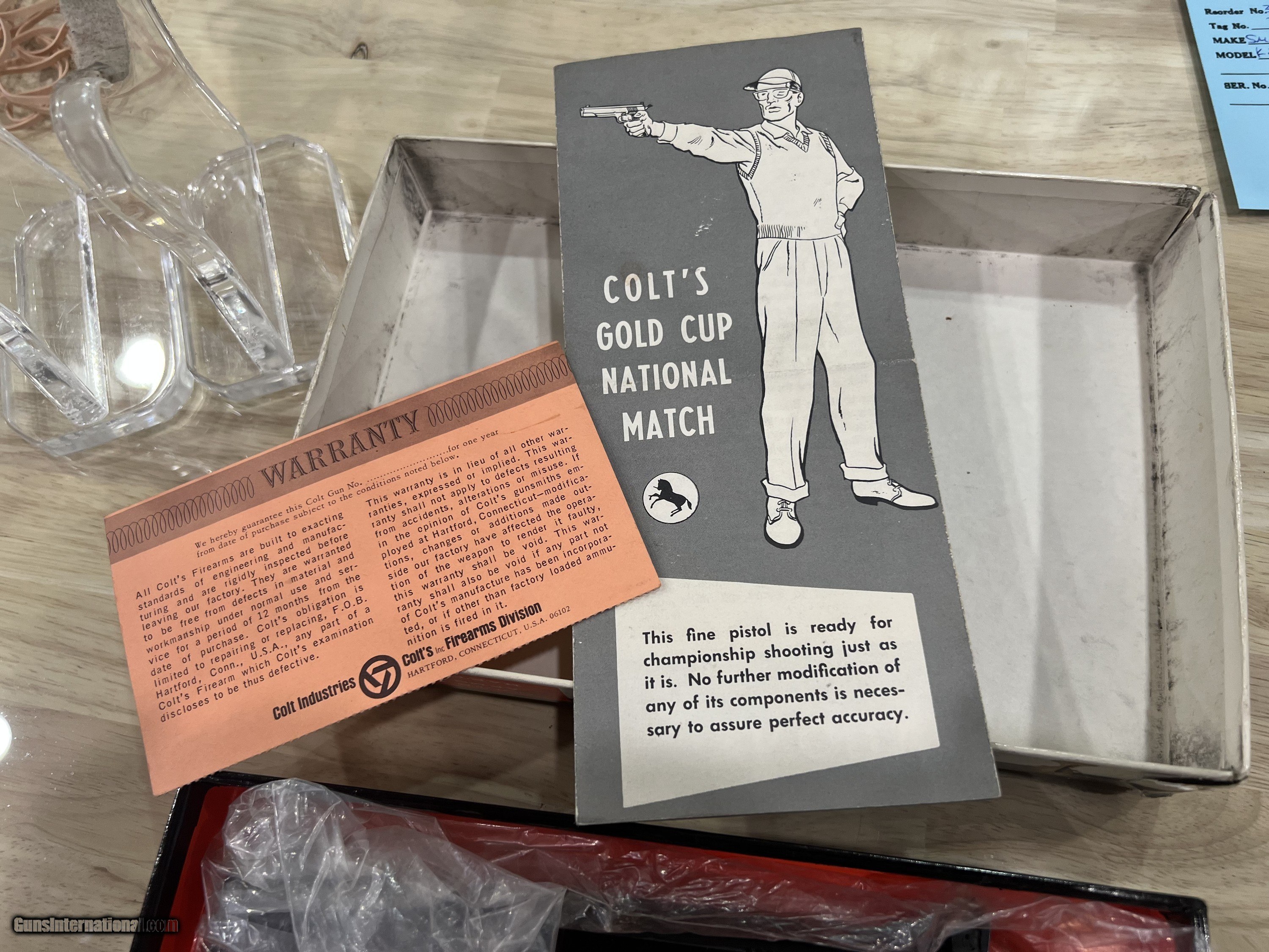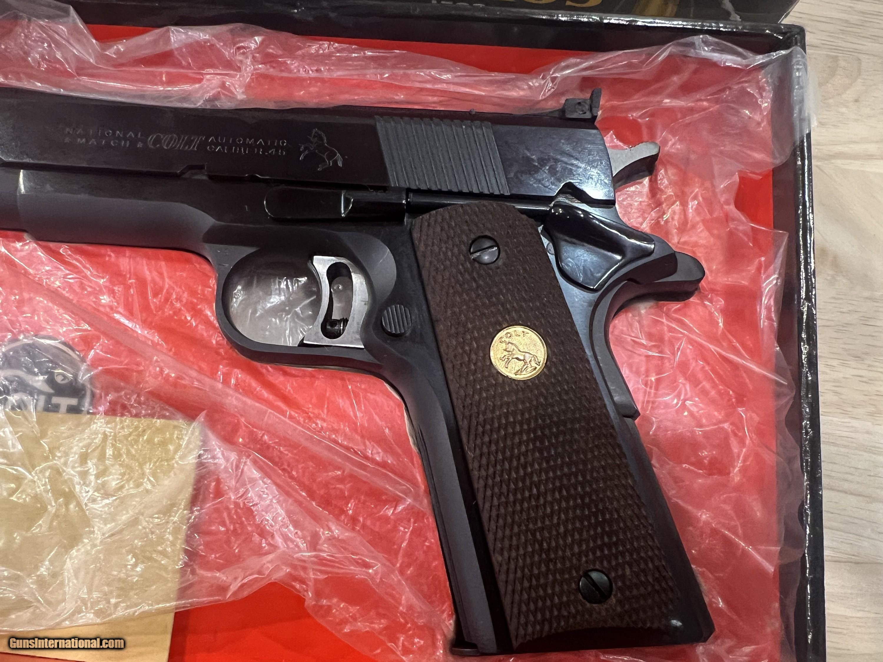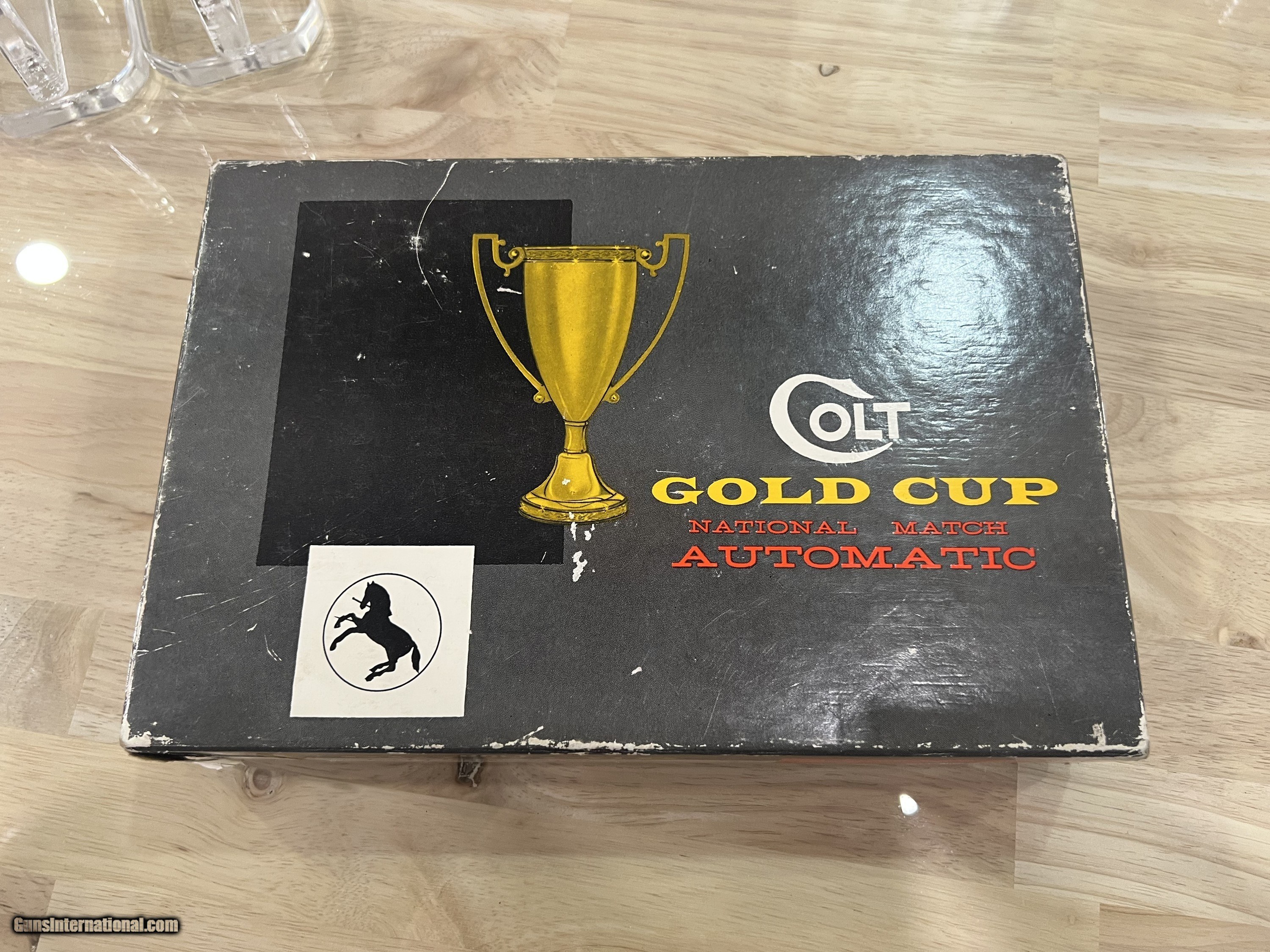 Here's a new in it's original box Colt 1911 Gold Cup National Match 45 auto, 5" barrel, adjustable rear sight, checkered wood grips, still has grease on it, the box shows a corner tear as pictured. 75.00 UPS shipping 2.99% credit card fee PA residents add 6% sales tax.
