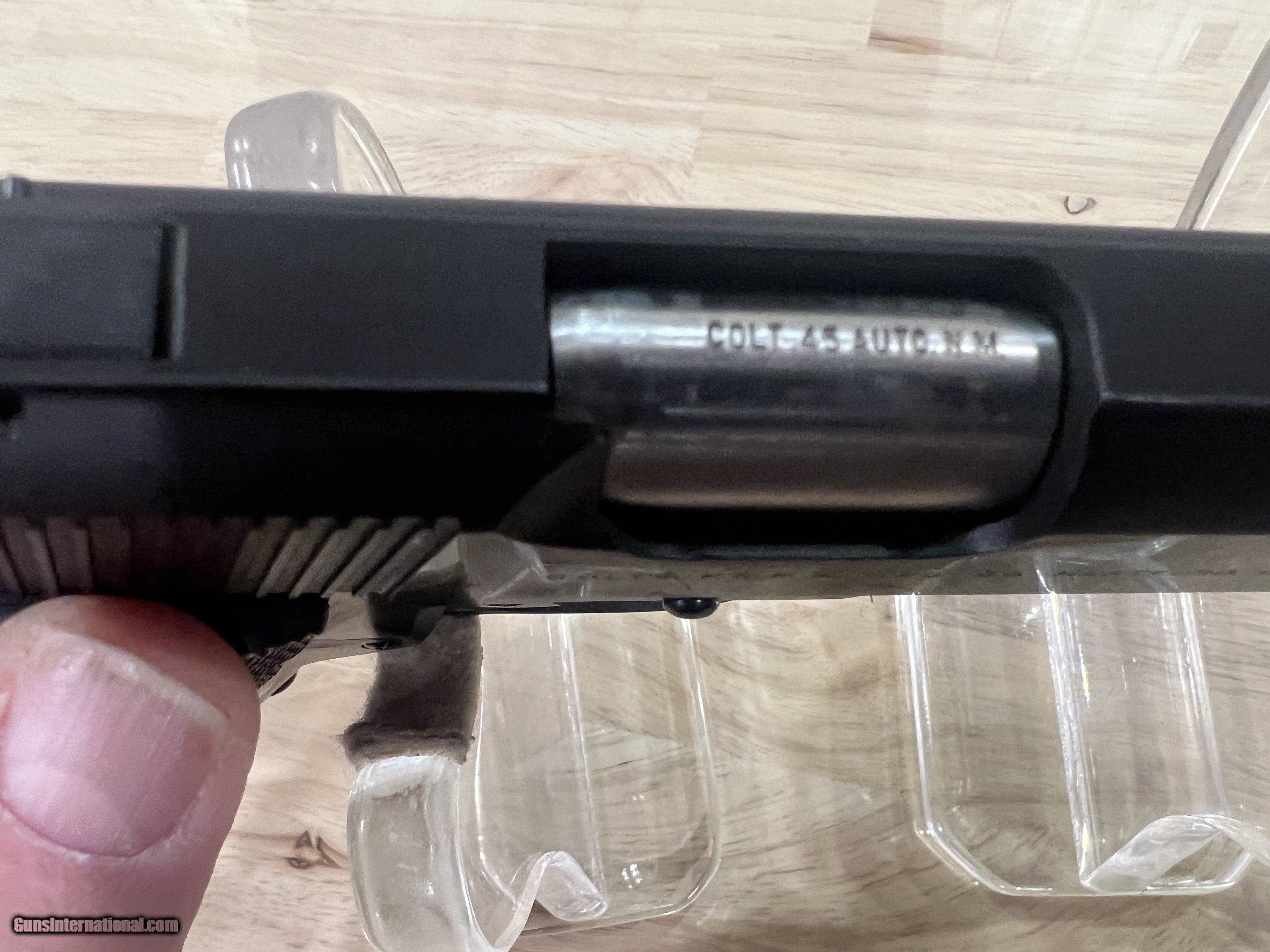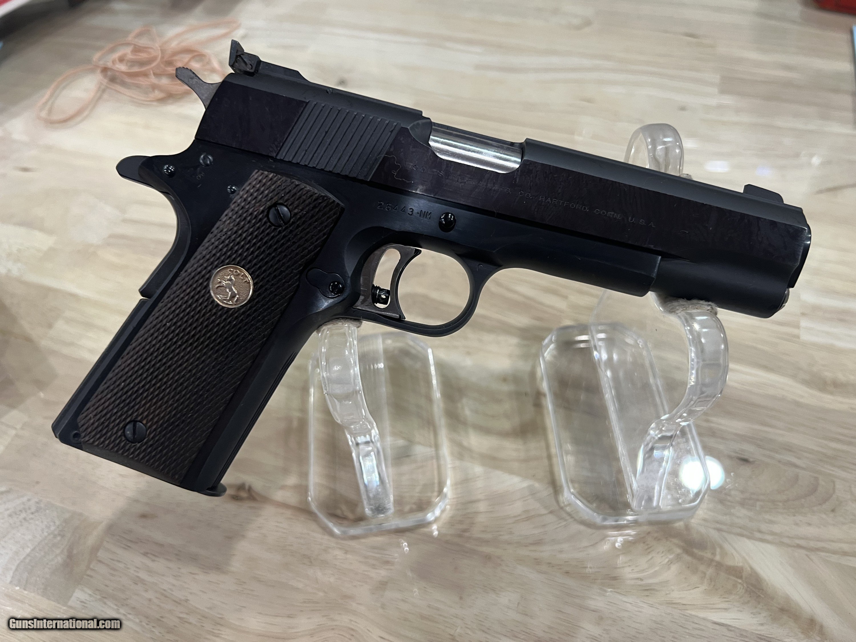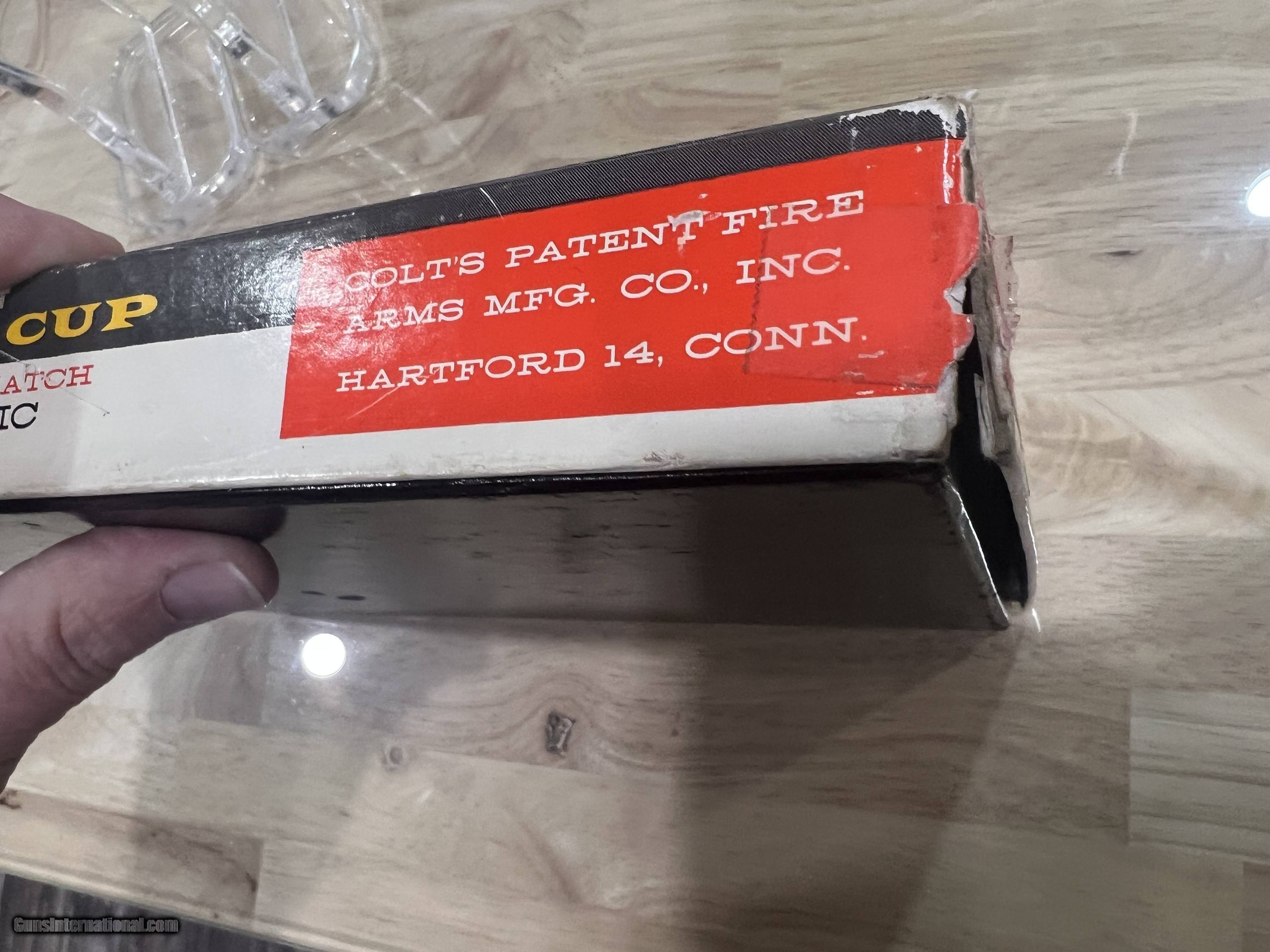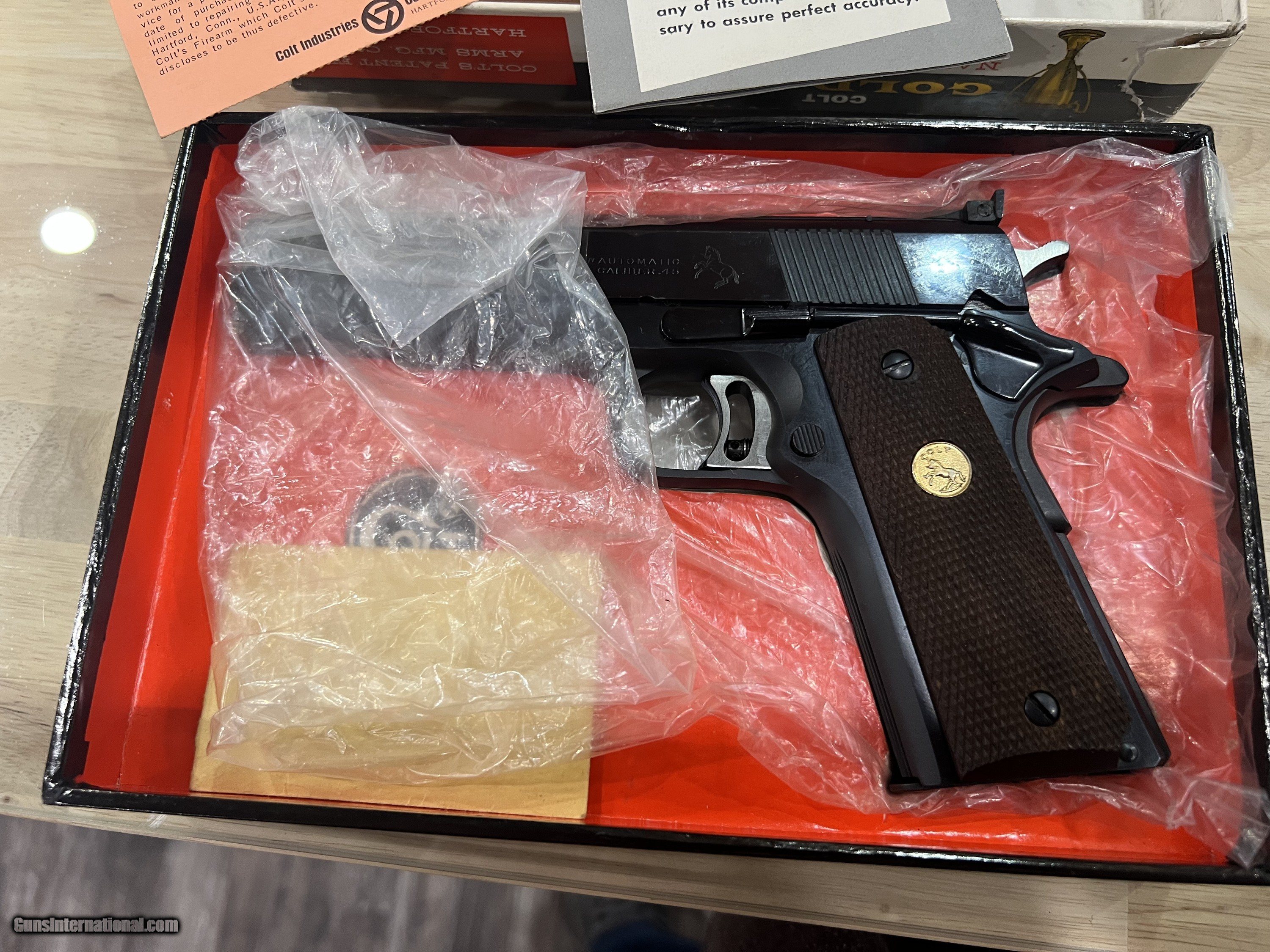 Here's a new in it's original box Colt 1911 Gold Cup National Match 45 auto, 5" barrel, adjustable rear sight, checkered wood grips, still has grease on it, the box shows a corner tear as pictured. 75.00 UPS shipping 2.99% credit card fee PA residents add 6% sales tax.