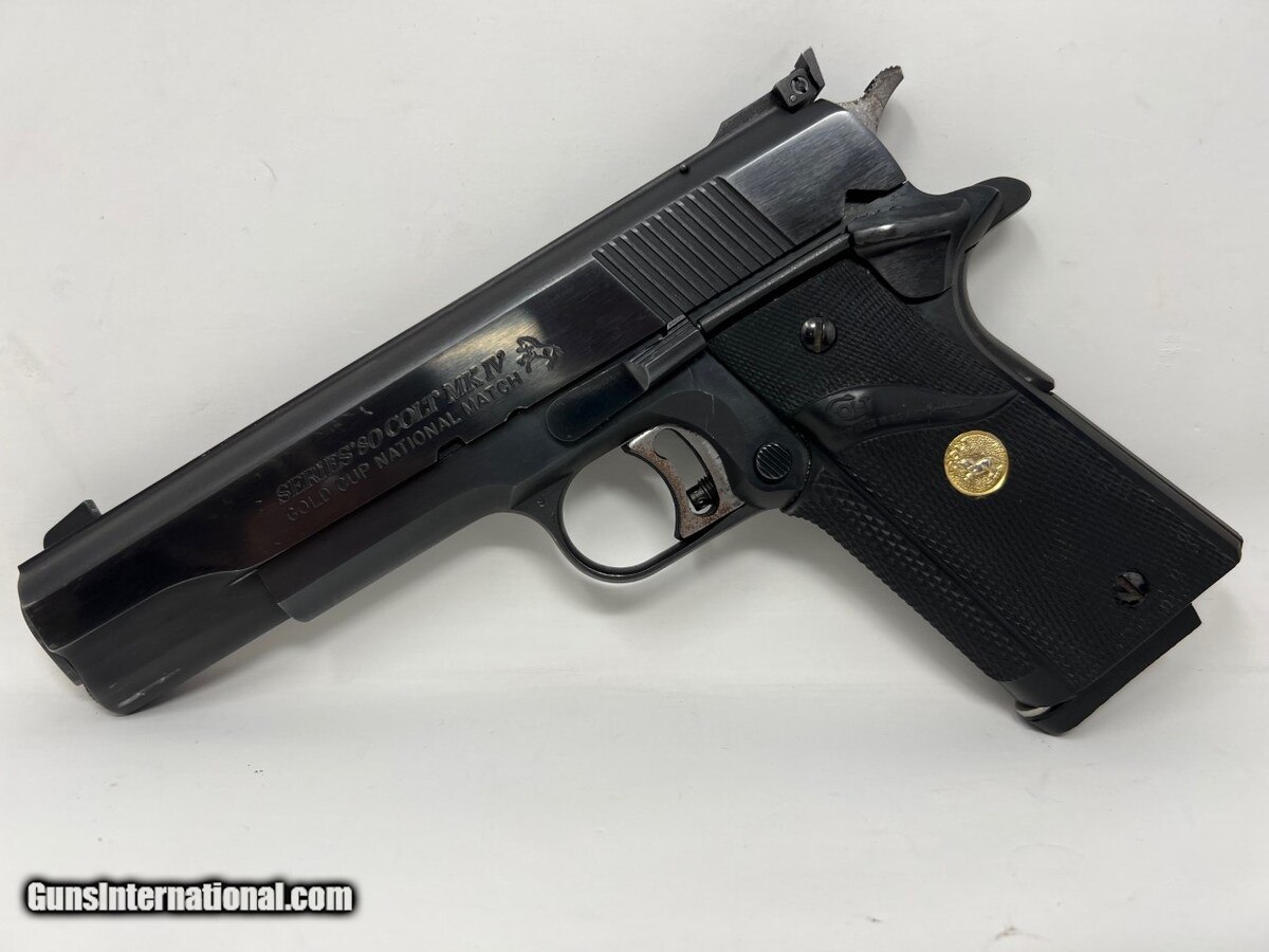 Description: Guns Listing ID: 611513 Up for sale today is this Colt 1911 series 80 MK IV Gold Cup National Match semi auto pistol. This 1911 is in very good condition with some minor surface level rust on the barrel, trigger, and hammer. It will include one mag. Please refer to photos for additional details. SOLD Manufacturer: COLT Model: 1911 Gold Cup National Match Caliber Info: .45 ACP Condition: Used - Non-Certified Barrels: 5 BARREL Finish: BLUE STEEL |