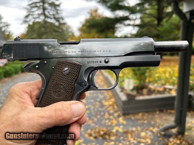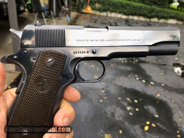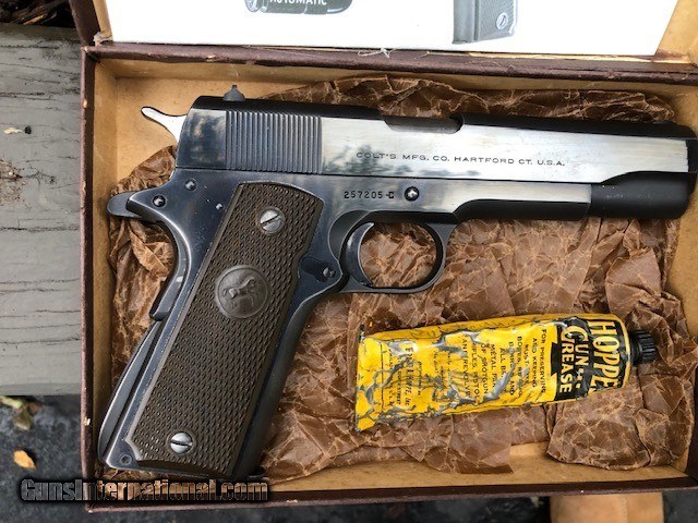 Description: Up for your consideration is a very nice Colt 1911 Government Model, .45acp. 5in Barrel ,Slide and Frame are all steel . Serial # 257205-C . This Colt dates back to 1952 . This Colt comes with a hinged Colt box with owners manual , vapor paper , and a old tube of Hoppes gun grease . The condition of the entire pistol is excellant +. The bluing is excellant +. Thr grip panels are excellant + with no cracks or chips and do not have any signs of grip shrinkage. There is a very small take down mark . I see no rust or pitting on the entire pistol . . .This Colt comes with the original Colt .45 Auto. magazine . The bore looks excellant , bright. I owned this Colt for many , many years . This will ship from my FFL to your FFL only . Know your State laws . No sales to california .These Old Colts are extremly hard to obtain in this condition . You will not be dissappointed . Just ask for more pictures if needed . Asking price will be $ 2750.00. Shipping and insurance is included . Dont let this one get away . Thank You for looking , SemperFi, JJ SOLD SOLD SOLD SOLD SOLD |