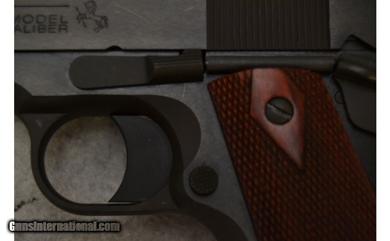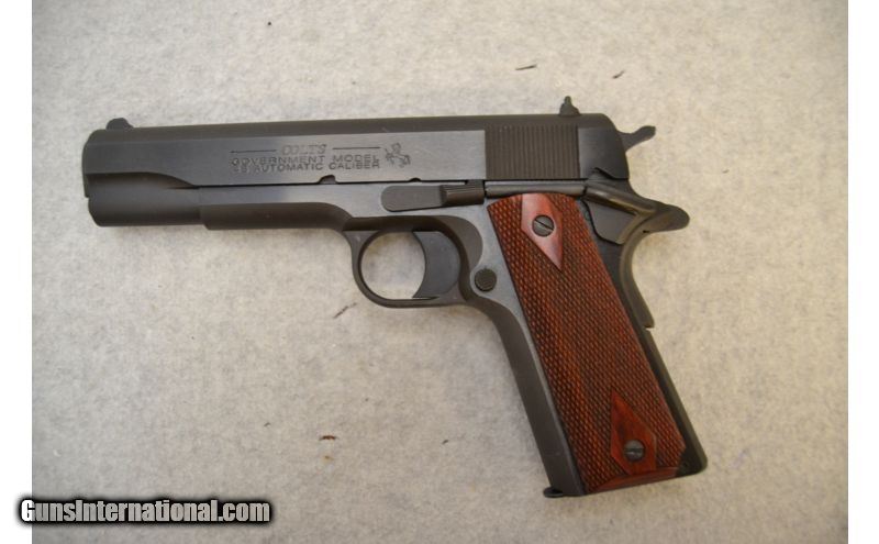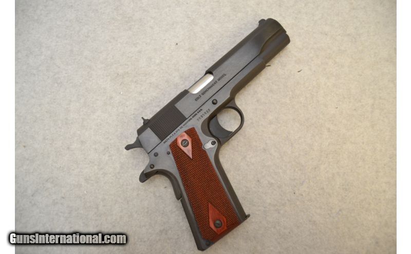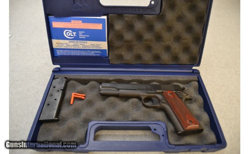Description: Tis nice example of Colt's 1911 is in great condition overall. The metal is in excellent shape with some handling marks that rubbed the matte part of the finish. It also bears a line from the slide stop from either dissassembly or reassembly. The grips are in excellent condition with no apparent damage. SOLD Caliber Info: .45 ACP Metal Condition: Very good to excellent Wood Condition: Excellent Bore Condition: Excellent Barrels: 5 Triggers: Matte black metal with grooved surface Stock: Wood double diamond checkered grips Weight: 2 1/2lbs Sights: Fixed white 3-dot sights Extras: Comes with the factory case and two magazines total Item Location: Green Bay, WI |