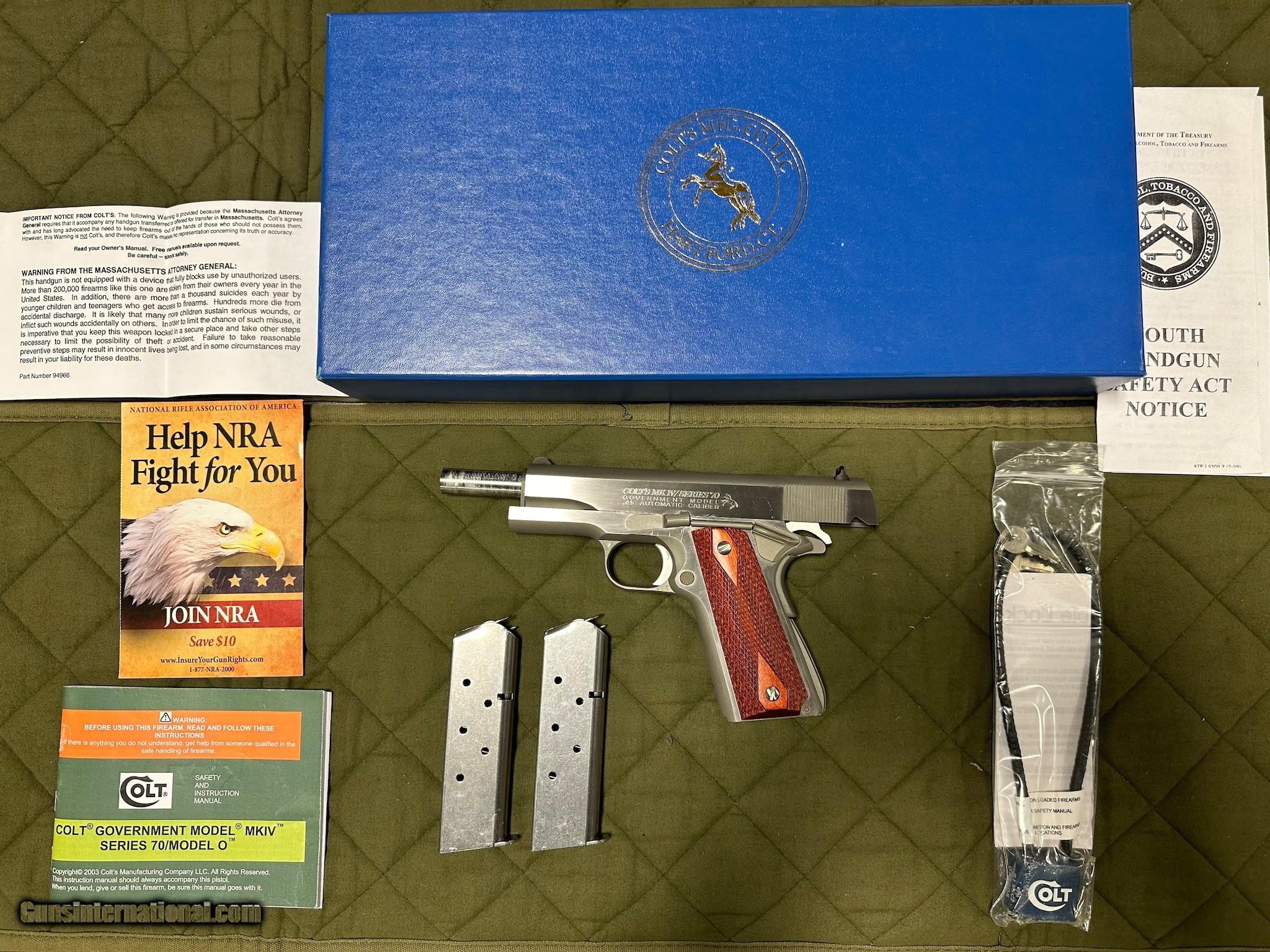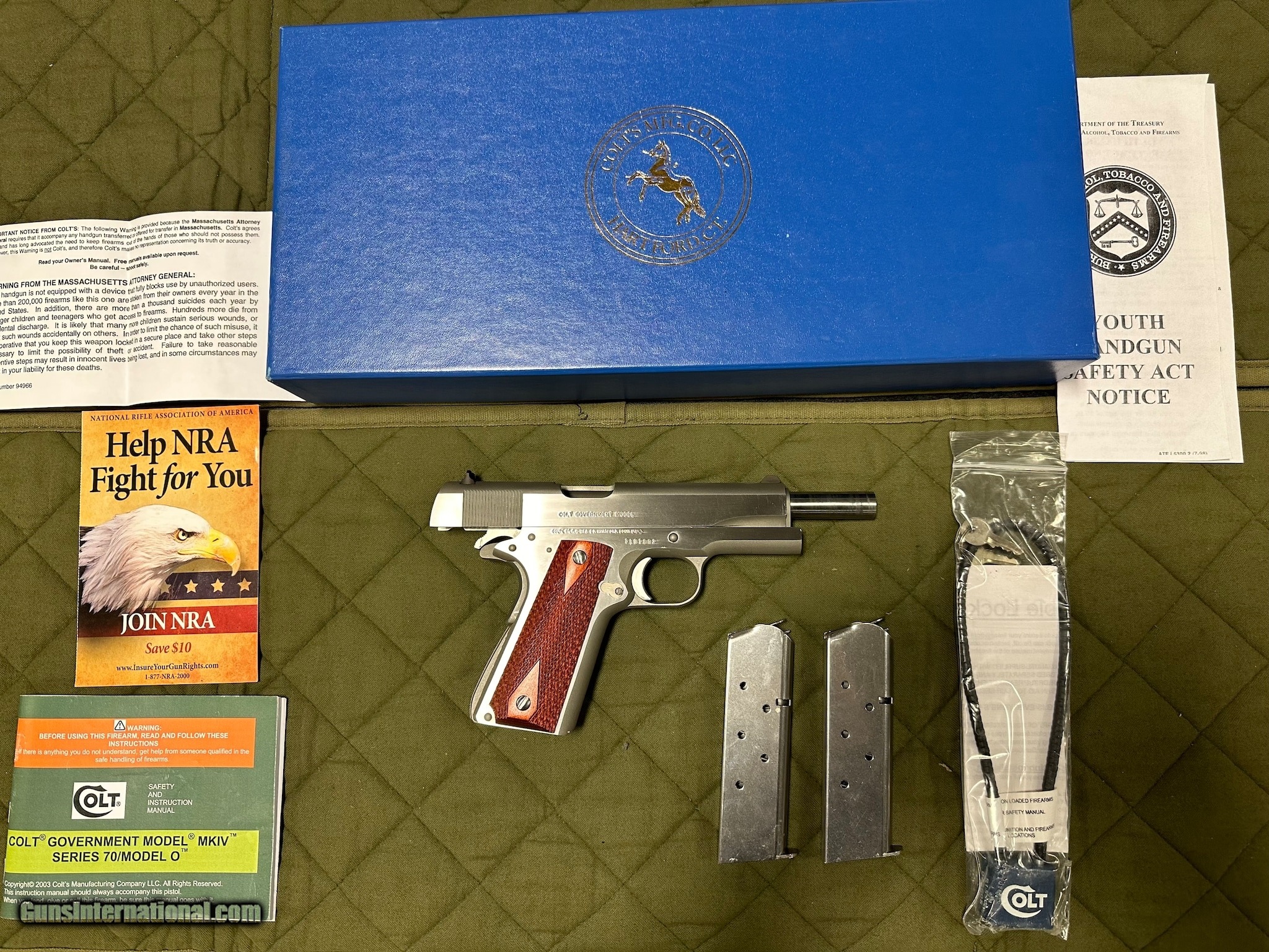 Description: Guns Listing ID: 1226046 This Colt is in good condition with the original box , see pictures for minor scratches. SOLD Manufacturer: COLT Model: 1911 GOVERNMENT Caliber Info: .45 ACP Condition: Used - Non-Certified Barrels: 5 BARREL Finish: STAINLESS |