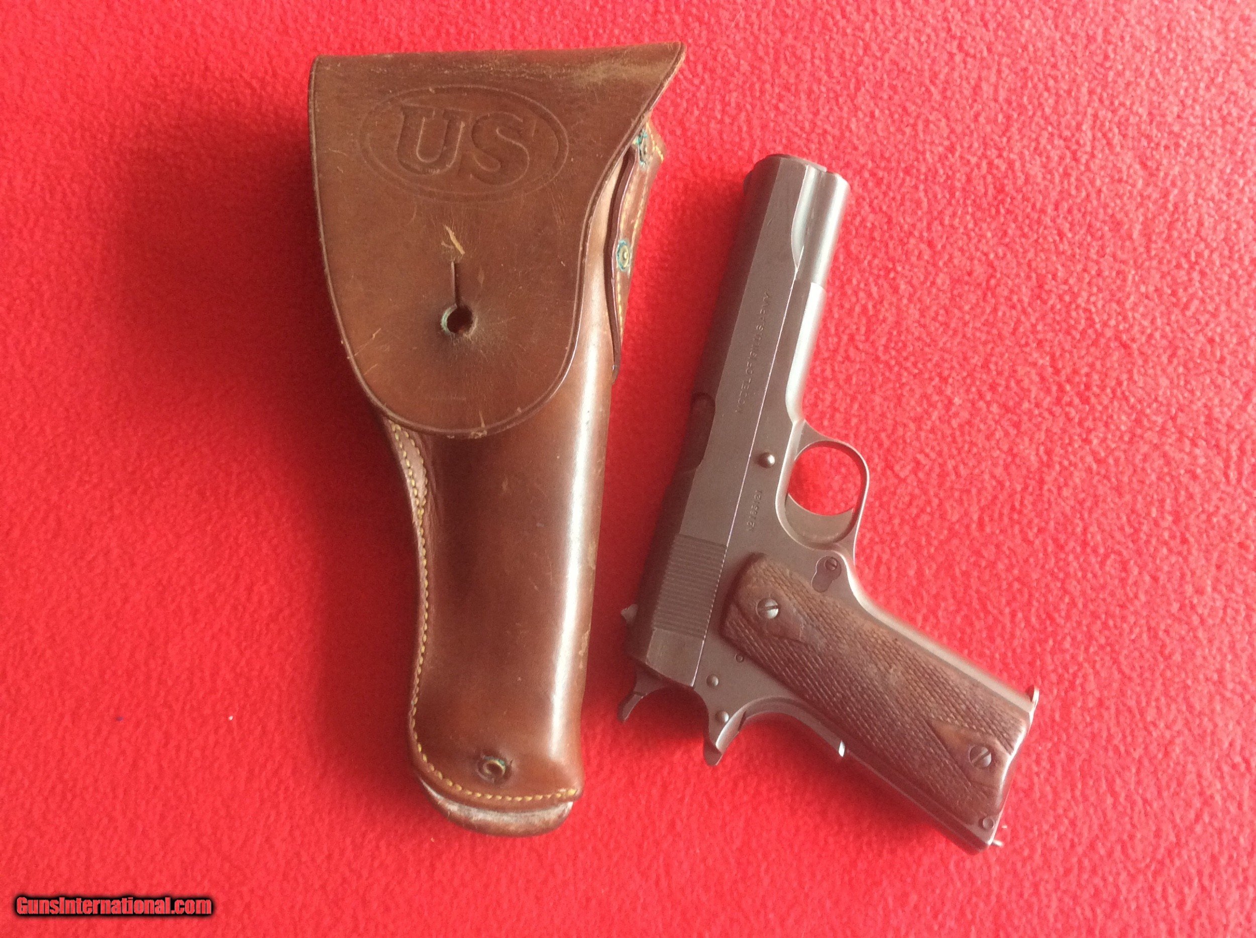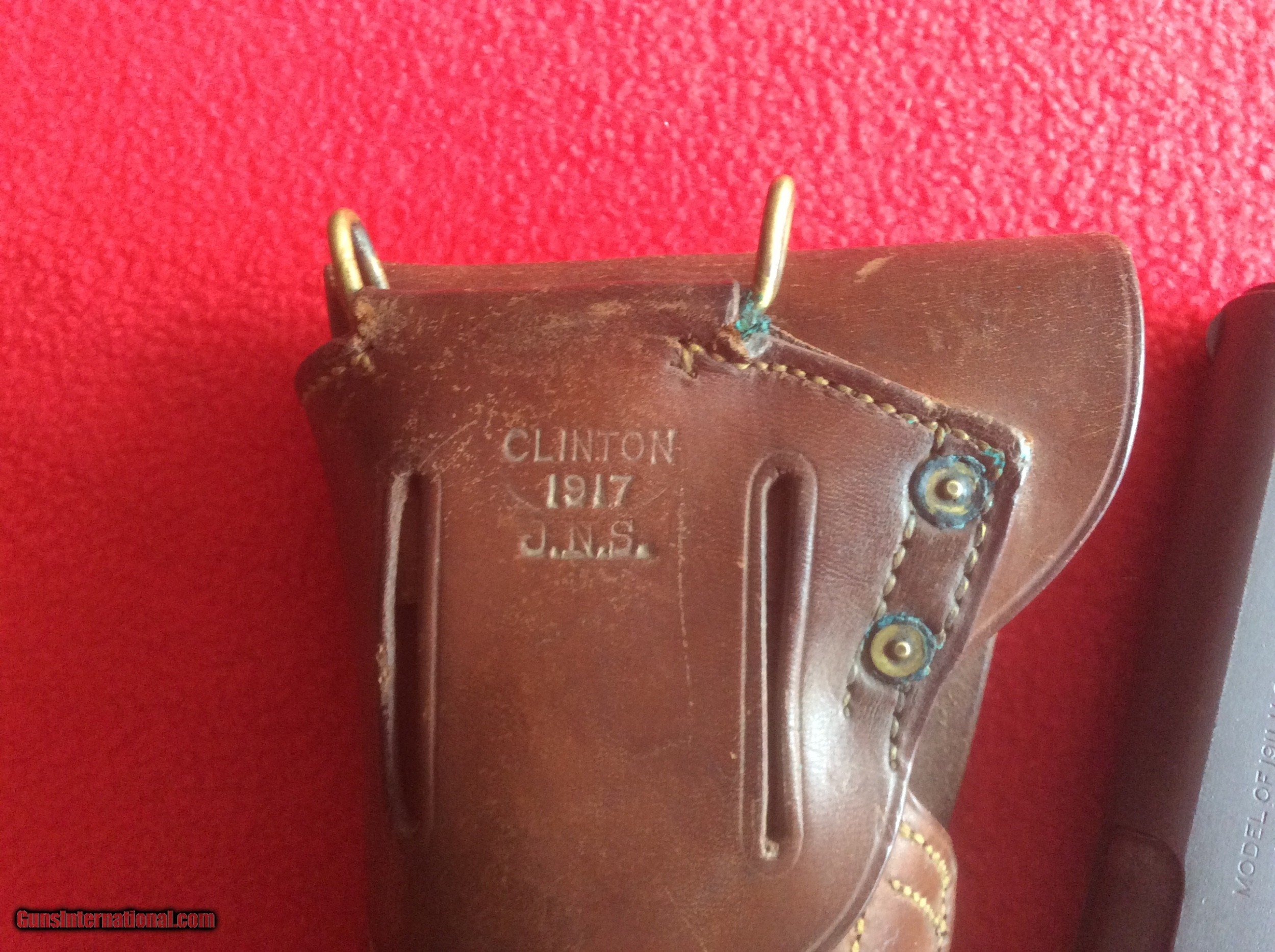 Description: For your viewing is a Colt 1911 45 ACP pistol original frame made in 1917. This pistol has been to the Agusta arsenal for parkerizing rebuild at some time in it’s life and is so stamped on the left side AA. the slide is a colt slide made after 1918. the barrel is stamped HS for Hi Standard. I believe the grips are original 1917 dbl. dimond. The US army holster is dated 1917 and is marked, Clinton J.N.S. By considering that the serial numbwr dates the Colt frame to 1917. The slide could be 1918 up to 1945. The barrel is definetly a period 1940's I think it can be assunmed that this pistol served in both WW 1 and WW 2 .This pistol is from a estate, and i am sure has not been used in decades. the pistol has been fired and functions fine. All safety features are fully functional . call or email for more info etc. Thanks for looking SOLD |