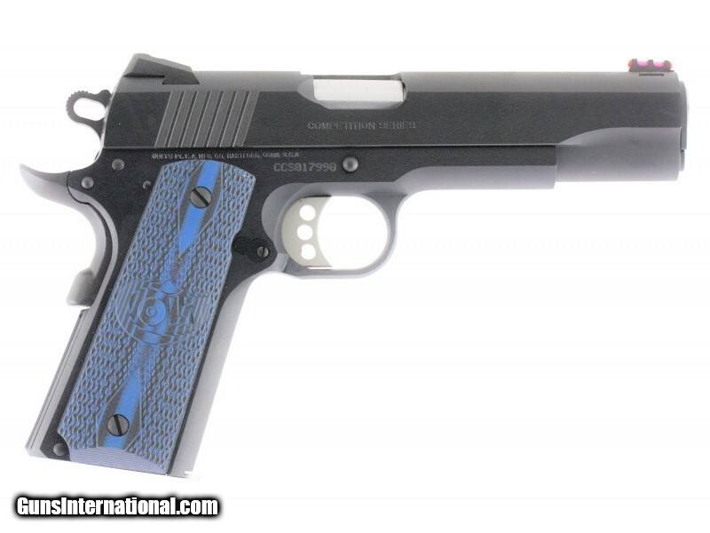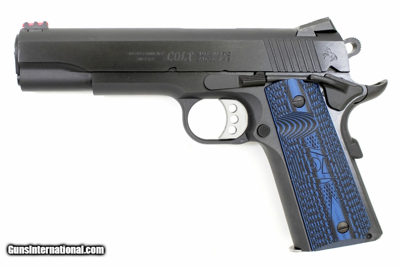 Description: Manufacturer: Colt's Manufacturing Co. Model: 1911 Series 70 Government Competition SKU: O1970CCS Caliber: .45 ACP Capacity: (2) 8 Round Magazines Barrel: 5" National Match Blue Overall Length: 8.5" Finish: Forged Carbon Steel - Blued Sights: Novak Adjustable Rear, Fiber Optic Front Grips: G10 Checkered Blue and Black Weight: 36 oz The Colt Competition Pistol™ is a race-ready full size Government Model® built with the competitor in mind. Featuring our Dual Spring Recoil System™, Novak's new adjustable rear sight and fiber optic front sight, acquiring and staying on target is easy. The pistol also features competition ergonomics including an undercut trigger guard and upswept beavertail, allowing shooters a higher grip for enhanced comfort and accuracy. Custom blue Colt G10 stocks and the legendary National Match® barrel complete the package. •Blued carbon steel •Government Model •Locked Breech Operating System •Dual Spring Recoil System™ •Single-Action (hammer fired) •Updated Series 70 Firing System, preferred by competitive shooters •3-Hole aluminum trigger (4.5-6.0 lb.) •Custom blue/black G10 grips •Upswept beavertail grip safety •Extended Thumb Safety •Undercut trigger guard •National Match® polished stainless steel barrel •Novak adjustable fiber optic sights •Includes (2) mags, cable lock, & spare sight fibers SOLD |
