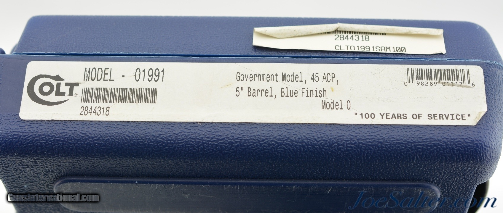 Description: Serial #2844318, .45 ACP, 5 inch barrel with a bright, excellent bore. This is the Lew Horton Exclusive (#01991SAM100) 100 Years of Service commemorative 1911 Government model manufactured in 2011. The series 80 semi-automatic pistol features a polished blue slide which is embellished with scroll engraving & gold outline with a gold Rampant Colt on top of slide and iconic Blue Onion Dome. Sam Colt's signature in gold is on one side of the slide and "100 YEARS OF SERVICE" on the other. It is enhanced by a gold plated spur hammer, slide release, thumb safety, magazine release and barrel bushing. It also features the Colt faux ivory grips with gold emblems and screws. In excellent, like new, condition the metal surfaces retain virtually all, 99% plus original finish and the faux ivory grips are likewise excellent plus. It comes in the original blue plastic case numbered to the gun with two Colt marked magazines, manual, and lock. A very limited production commemorative pistol in excellent, LNIB condition. FFL SOLD |