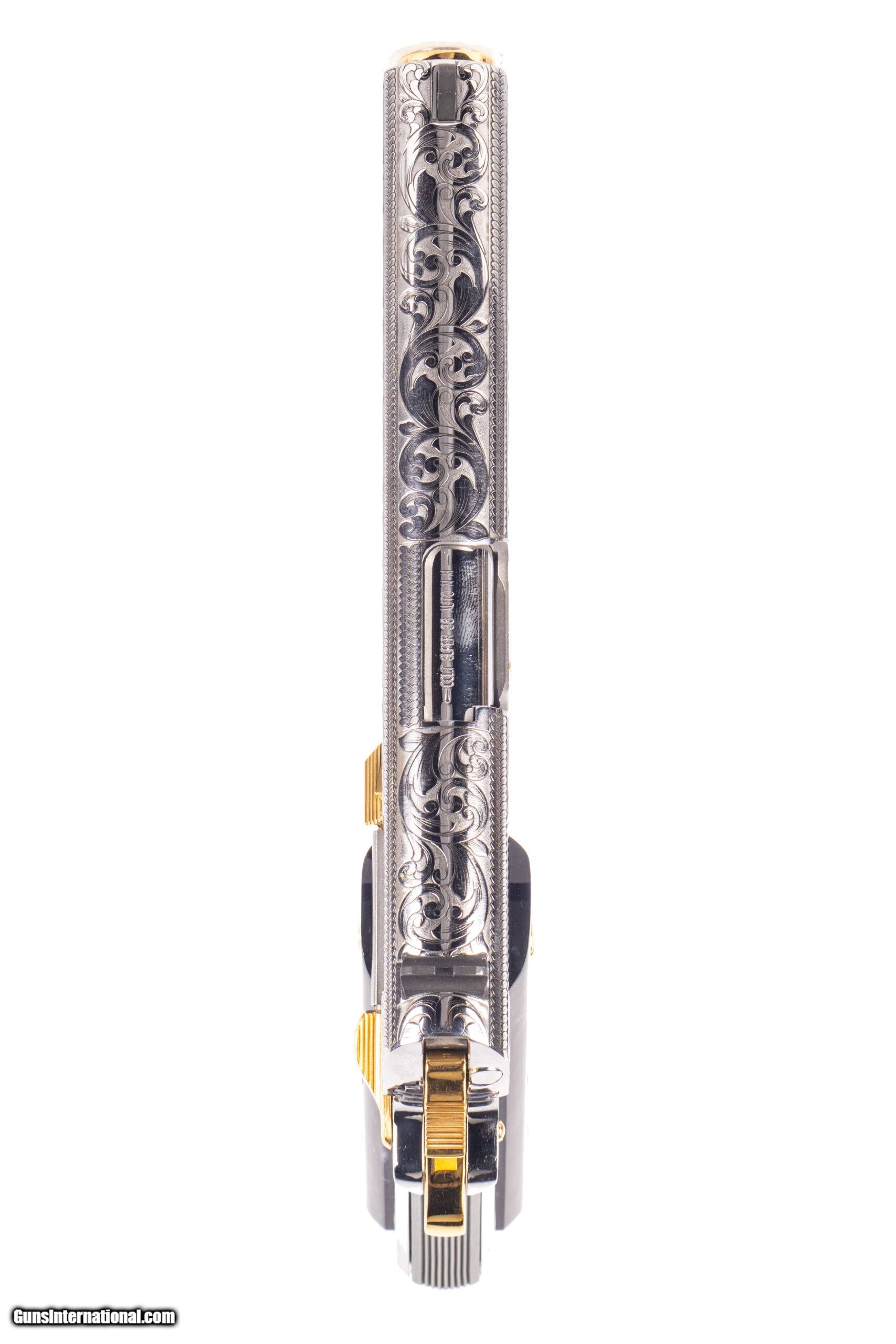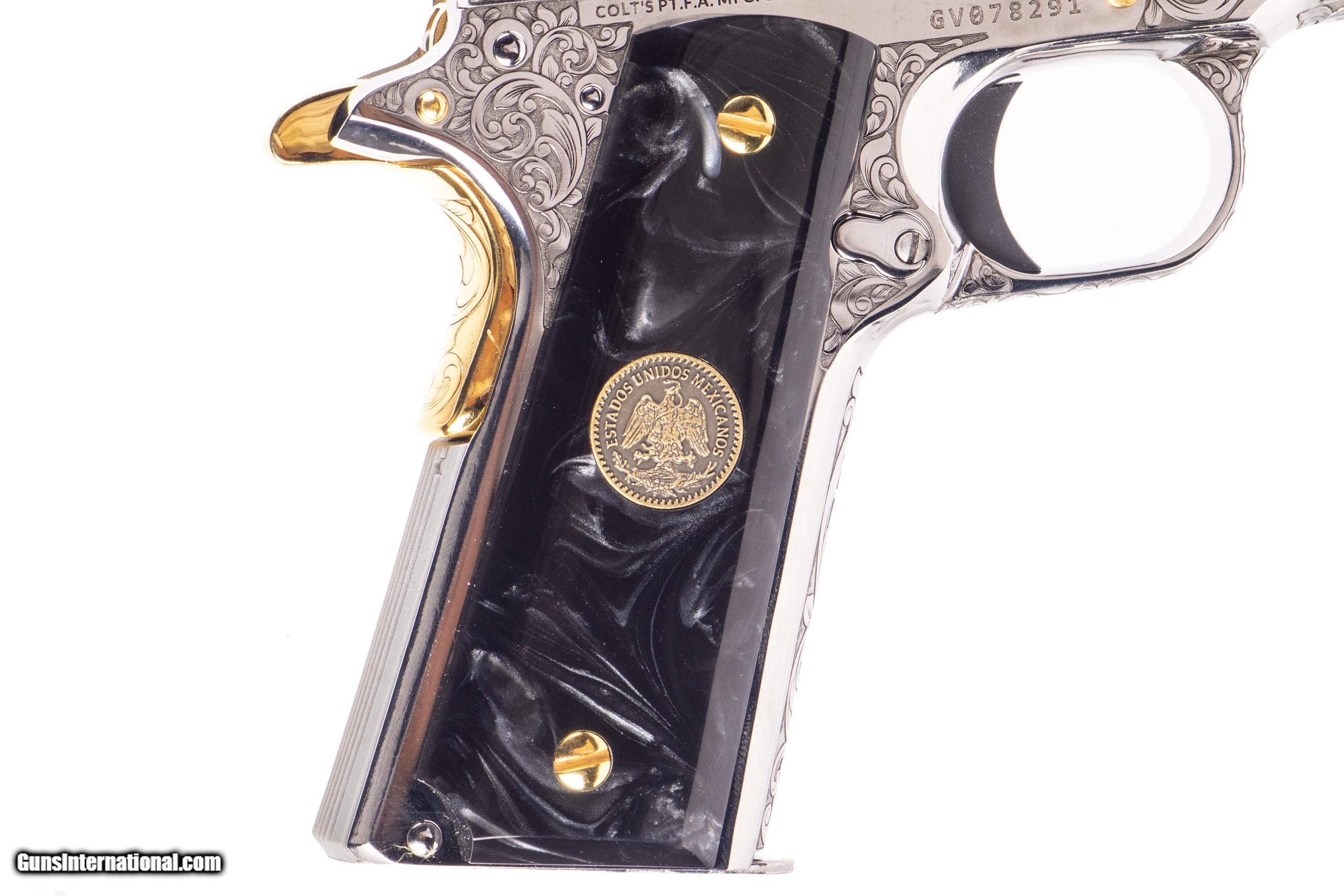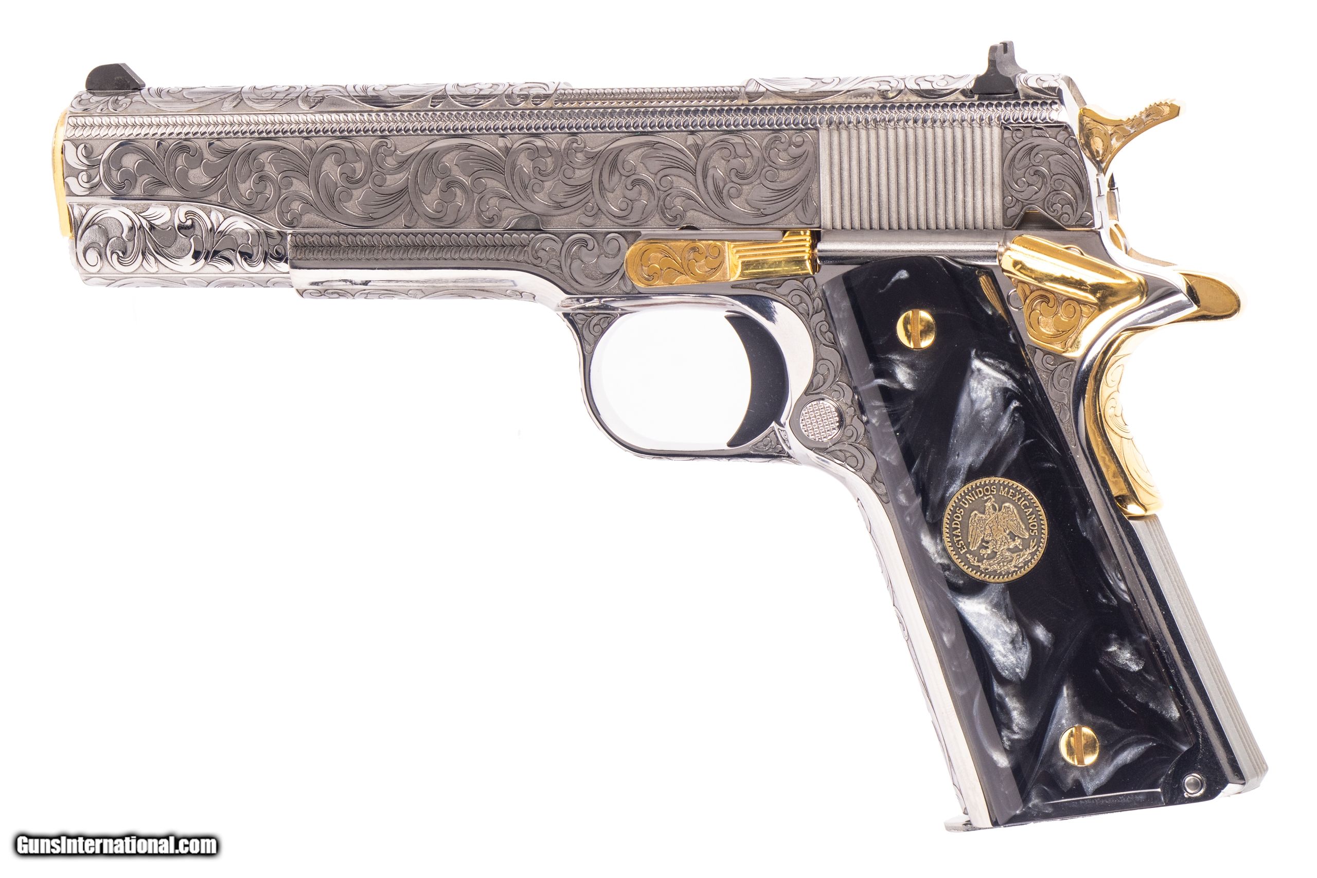 Description: Colt 1911 Government Model Series 70 chambered in 38 Super with a 5 inch barrel, pristine mirror-shine bore with pristine rifling as this pistol is unfired. This pistol features a custom polished finish ingulfed by a floral engraving accented with gold plated controls and safeties paired with a set of smoke black grips dawning the seal of a 50 peso coin. A case is included with this pistol. The NRA grading condition for this USED firearm is Perfect (Like New). We ship domestically in the United States. Additional shipping rates apply to Alaska and Hawaii. Dury's Lifetime Warranty: All firearms purchased from Dury’s Gun Shop, NEW or USED, are covered by a lifetime warranty. We will repair or replace, at our discretion, any firearm purchased from Dury’s Gun Shop, Inc. for as long as it is owned by the purchaser. This warranty is not transferable. WE BUY GUNS! NO COLLECTION TOO BIG OR SMALL FOR OUR GUNS INTERNATIONAL CUSTOMERS ALL OF OUR FIREARMS CAN BE PURCHASED DIRECTLY FROM OUR DURY'S GUNS SITE ! SOLD Manufacturer: Colt Model: 1911 Government Model Caliber Info: 38 Super Automatic Barrels: 5inches |