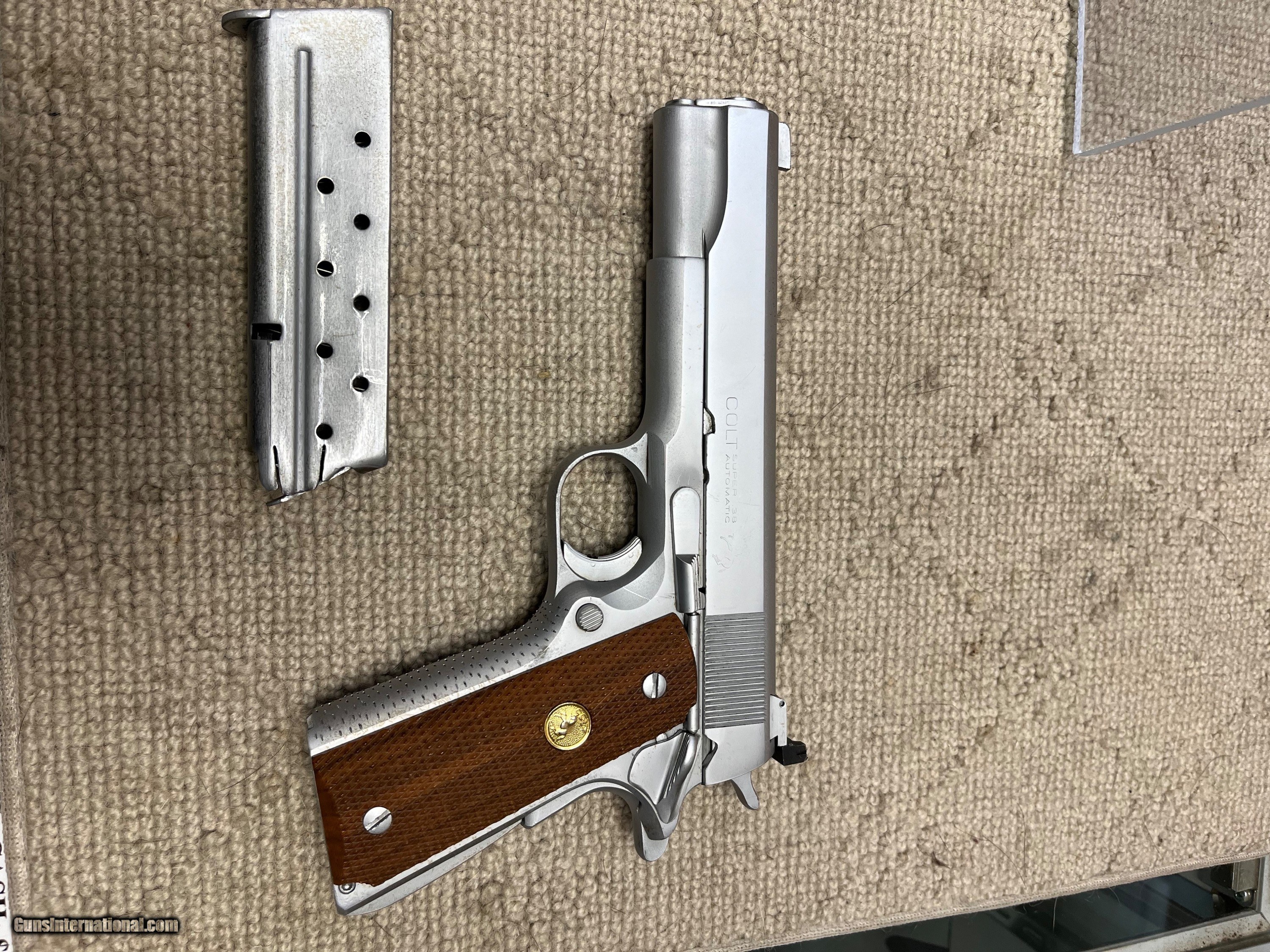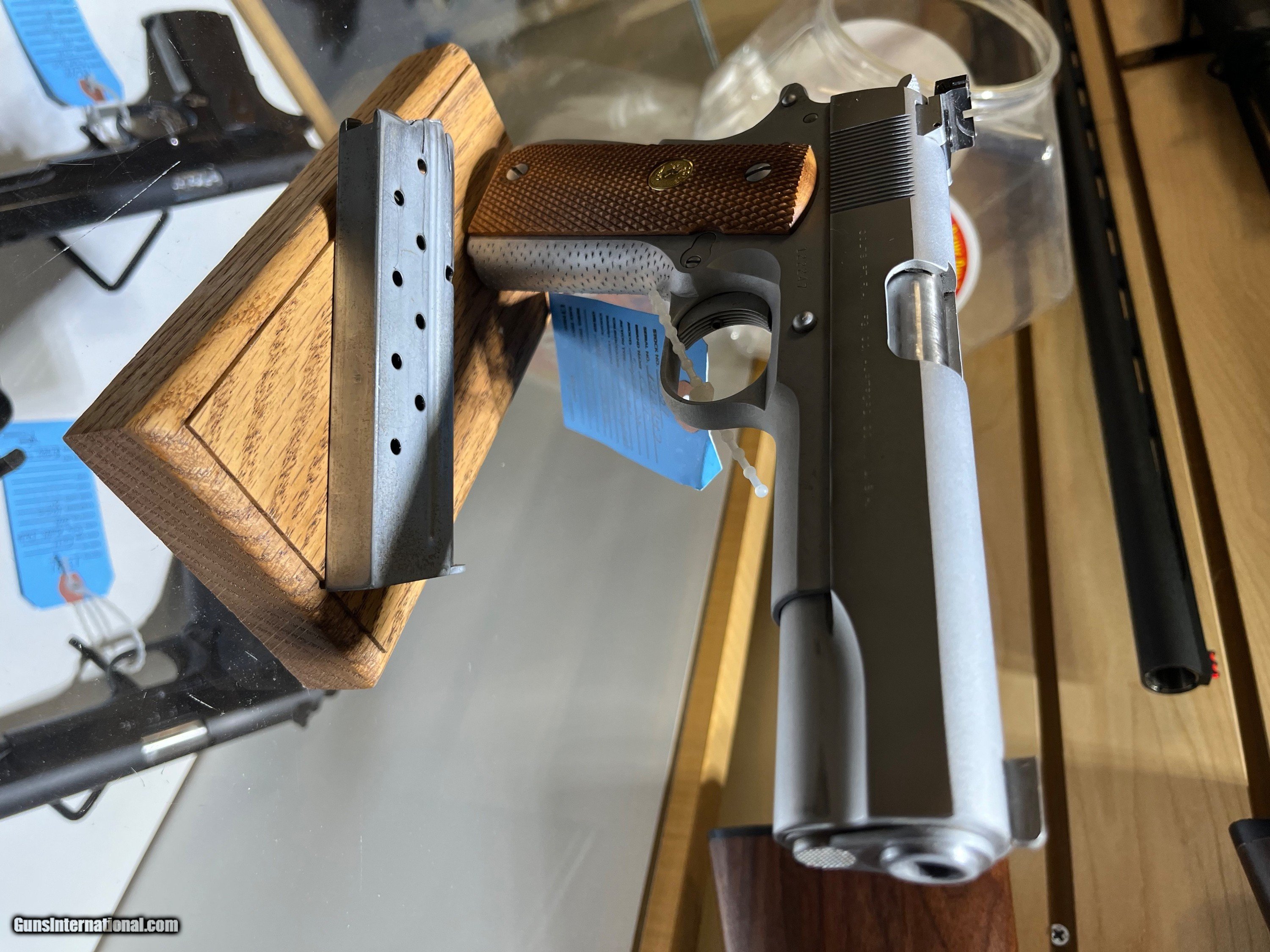 Description: Colt Government Model 1911 in .38 Super Auto. Unblemished nickel cadmium finish with excellent bore, checkered wood grips with Colt medallion and adjustable target rear sight. Shoots excellent for a 1957 gun. Comes with original magazine. Will ship from my FFL to FFL only. C&R OK. 40.00 shipping. Postal Money Order only. New pictures just added. Please note the light "idiot mark" common on 1911's when the slide release is less-than-carefully installed. 2,450.00 Price Reduced SOLD Curio/Relic: Yes |