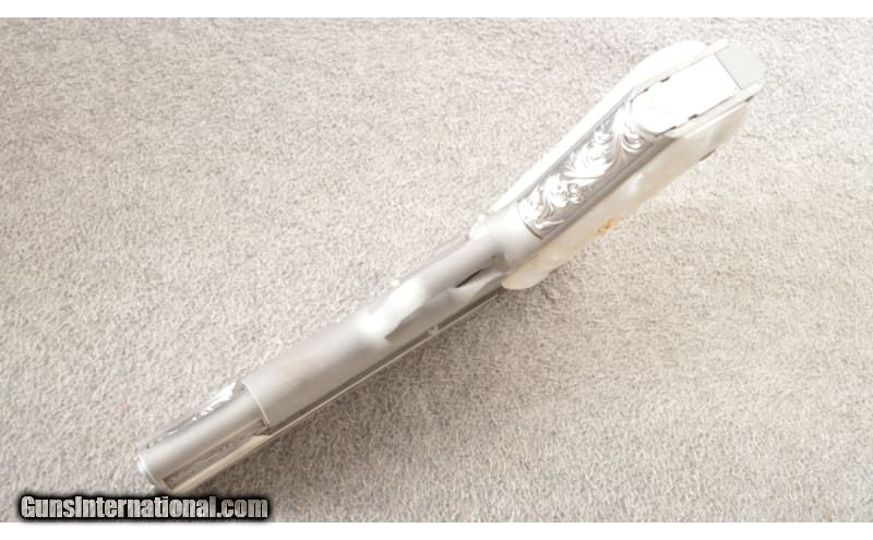 Description: Colt 1911 Custom engraved Regal by Altamont in .38 Super. This special edition Colt 1911 was designed and engraved by Merlin Enright. The engraving is grade AA coverage level with deep relief Regal scroll. The front grip strap, slide stop, safety lever are engraved with deep relief Regal scroll. The grips are a custom faux white pearl with a Colt Rampant Horse inlay, made by Altamont. Comes new in the factory hard case with the owners manual, paper work and cable lock. .38 Super SOLD Chambers: 9+1 semi auto. Metal Condition: New. Bore Condition: New. Triggers: Single action trigger. Weight: 2.25 lbs Sights: "Fixed front, drift adjustable dovetail rear. Item Location: Owatonna, MN |