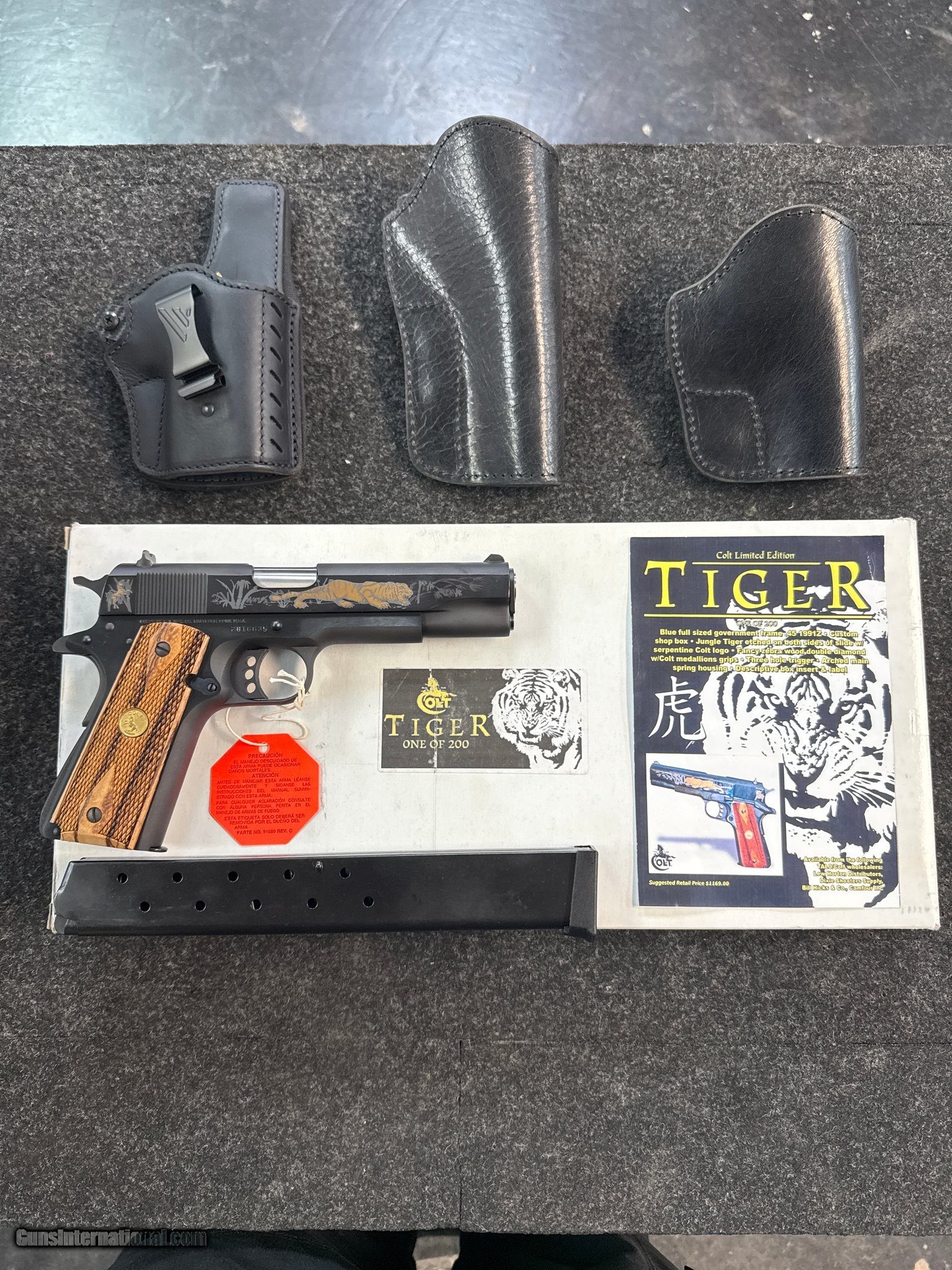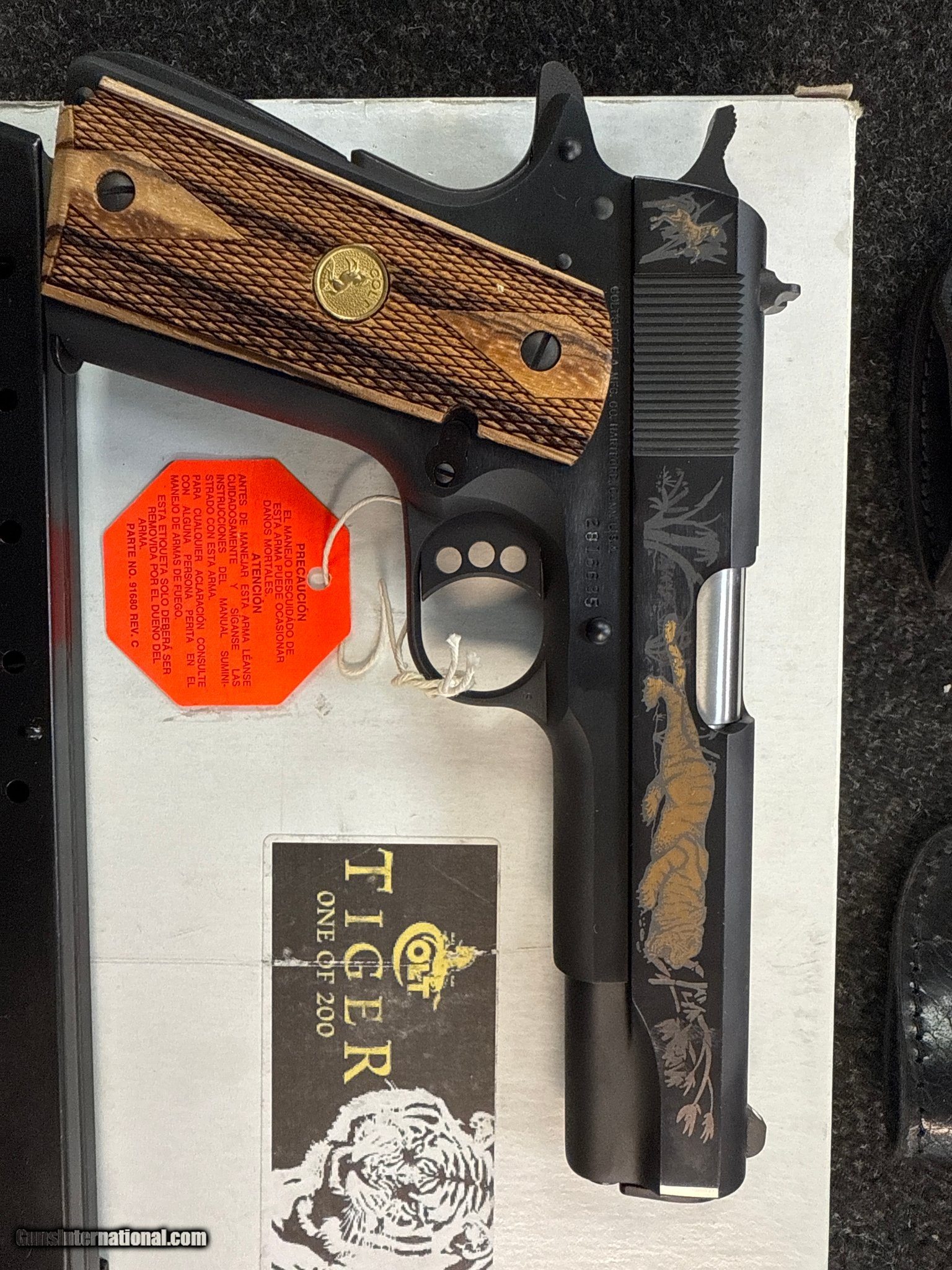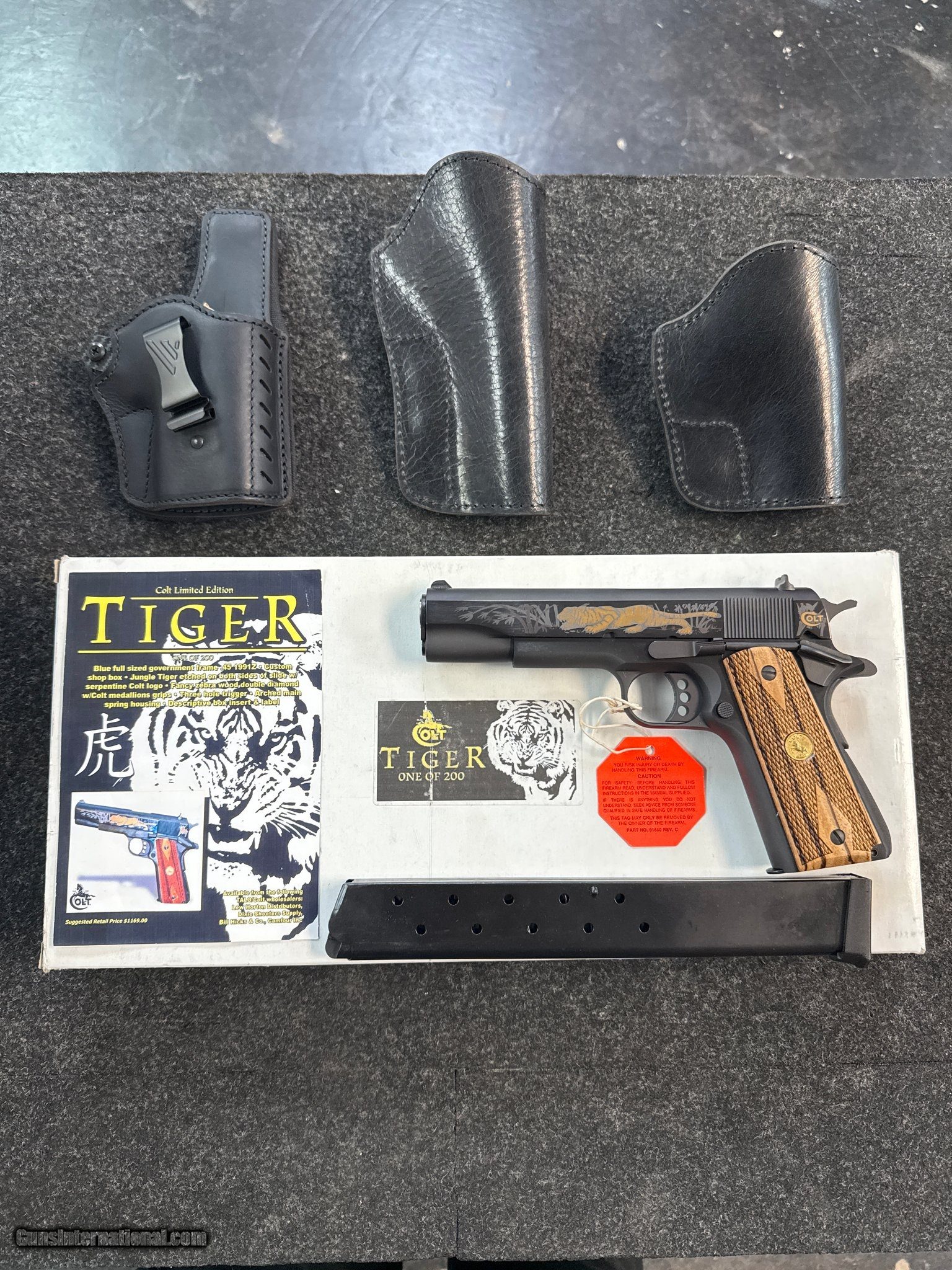 Description: Guns Listing ID: 479340 VERY RARE TALO COLT! HARD TO FIND! COMES WITH TWO 7 ROUND MAGAZINES ONE 15 ROUND EXTENDED MAGAZINE TWO OWB LEATHER HOLSTERS ONE IWB LEATHER HOLSTER INSTAGRAM: JRCUSTOMFIREARMZ serial #2816635, 45 ACP, 5" barrel with an excellent bore. In 2005 Colt produced a mere 200 of these lightly adorned pistol for Talo Distributors. This gun remains as new in-the-box with 99% plus original blue. The grips are special factory double diamond Tiger wood stocks featuring gold Rampant Colt medallions and rate excellent. This gun has high visibility three dot sights, three hole long trigger, arched mainspring housing, and appears to function mechanically. Both sides of the slide have an etched gold filled crouching tiger with non-filled etching in the background depicting a jungle scene, the left side has a gold filled etched serpentine Colt logo with the large stylized “C", while the right side has a simple gold filed etched Rampant Colt. This lovely pistol includes a Custom Shop two-piece cardboard box with shipping sleeve that is correctly end labeled and numbered to the gun, there is a surcharge on the shipping sleeve identifying it as the “tiger" edition and one of 200, a pair of factory seven-round magazines, unused Colt marked cable lock with a pair of keys, manual, and paperwork. With only 200 produced it is sure to command considerable interest. SOLD Manufacturer: COLT Model: 1911 GOVERNMENT TIGER Caliber Info: .45 ACP Condition: Used - Non-Certified Barrels: 5 BARREL Finish: blue |