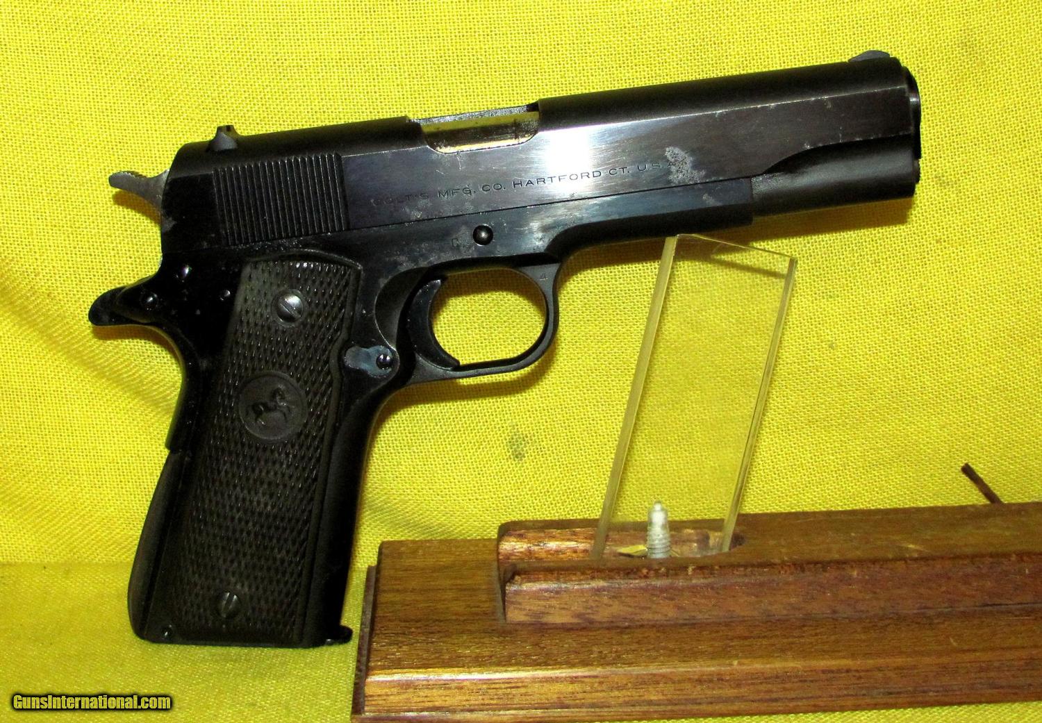 Description: COLT model 1911 GOVERNMENT in .45 ACP CAL., with 5" barrel. Color BLUE. COLT MODEL 1911 GOVERNMENT, BORE EXCELLENT, PITTING ON RIGHT AND LEFT SIDE OF SLIDE INCLUDING FRAME, GRIPS GOOD, 85% FACTORY FINISH, MECHANICALLY EXCELLENT, POOR STORAGE GREAT BARGAIN. OUR NEW STOCK # D31355 Condition 85%+. Serial number 251385-C. SOLD |