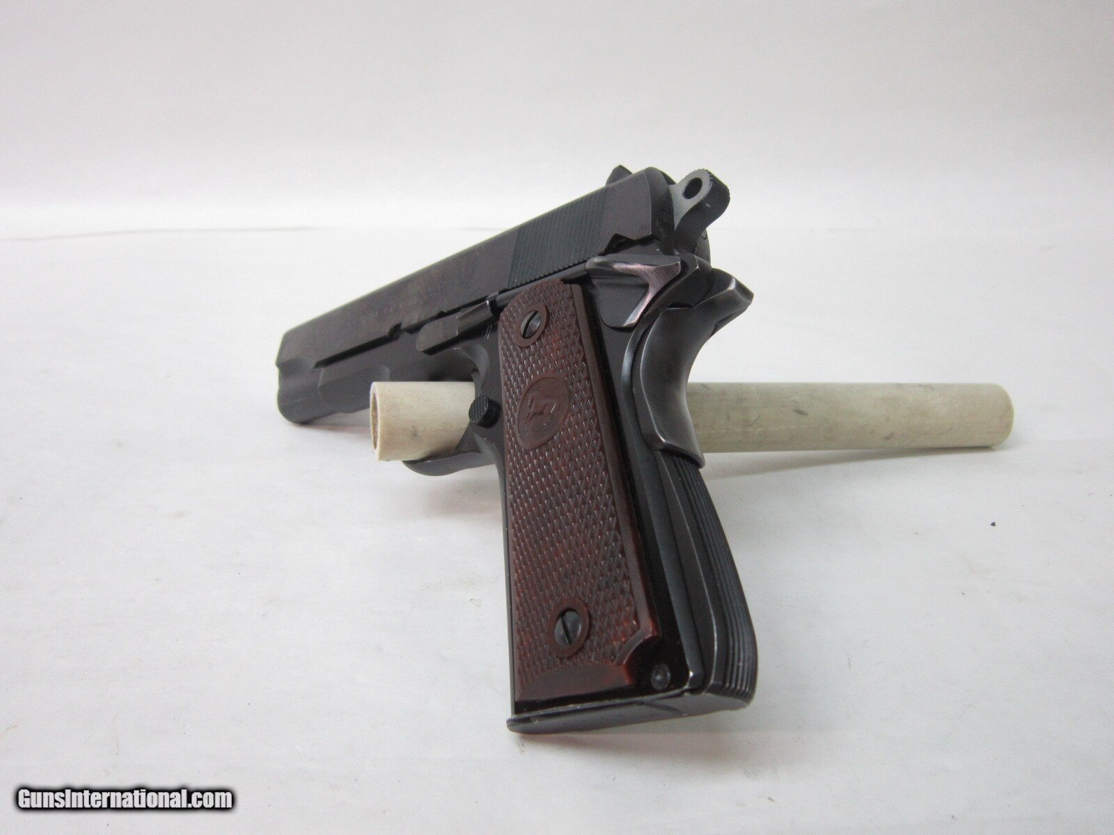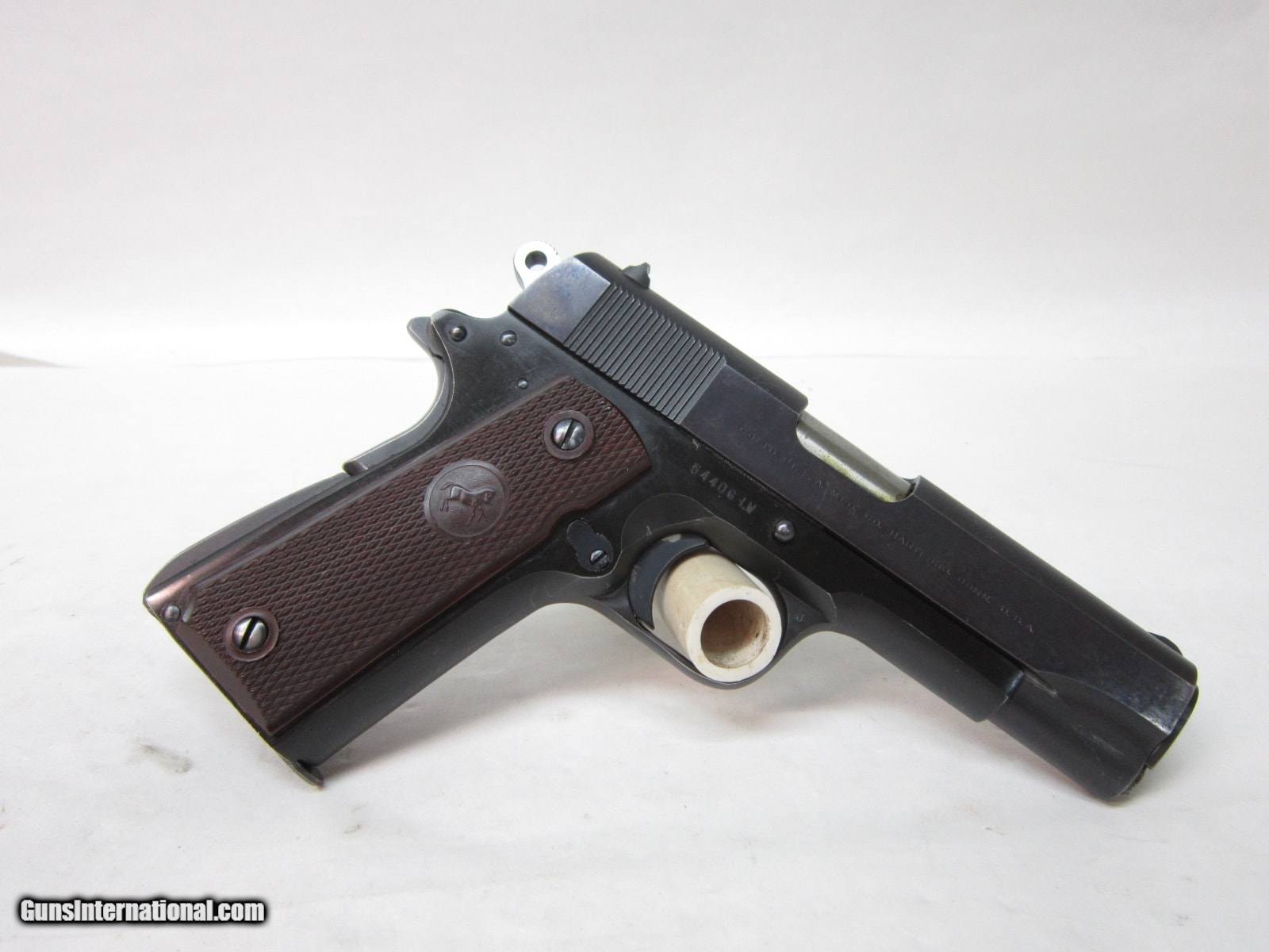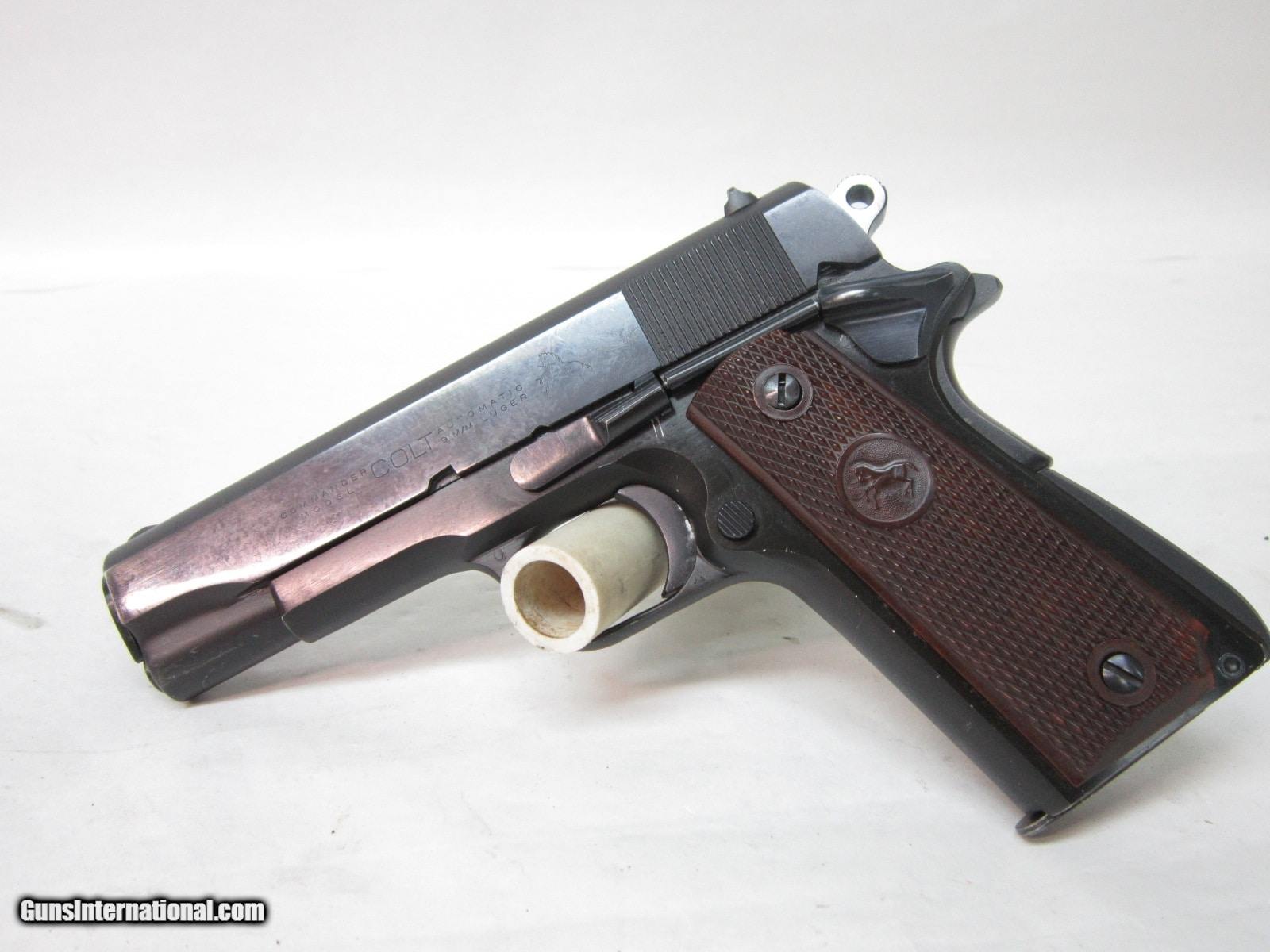 Description: Guns Listing ID: 926126 MAKE: Colt MODEL: 1911A1 Light Weight Commander ACTION: Semi CALIBER: 9mm Luger FINISH: Blued TYPE OF STOCK: N/A CONDITION: Good BARREL LENGTH: 4 1/4\" OVERALL LENGTH: 7 1/2\" PULL LENGHT: N/A SCOPE: N/A SIGHTS: Factory military style NUMBER OF MAGS: 1 CAPACITY: 9+1 CHOKE TYPE: N/A CASE: N/A ACCESSORIES: N/A SERIAL #: 54406LW ADDITIONAL DESC: A good condition, alloy framed, pistol. Our research indicates 1968 as the year of manufacture. The bore, chamber and muzzle crown are all in very good condition. There is a little bit of finish loss on the grip safety and some schmuck scratched the receiver with the slide stop. Please refer to the appropriate photos. The magazine is a nine shot, Colt marked blued magazine. The chamber entrance has not been opened, contoured or polished. The feed ramp is still black and has not been polished in the past. Sorry, but we do not have the factory box, paper work, holster, reloading dies, spent brass, cleaning kit, spare barrel, second magazine, or any other tools or accessories for the pistol. While the pistol has been cleaned, lubed and inspected by our gunsmith, it has not been test fired. SOLD Manufacturer: COLT Model: 1911 LIGHTWEIGHT COMMANDER 9MM 4.25 Caliber Info: 9MM LUGER (9X19 PARA) Condition: Used - Non-Certified Barrels: 4.25 BARREL Finish: BLUE |
