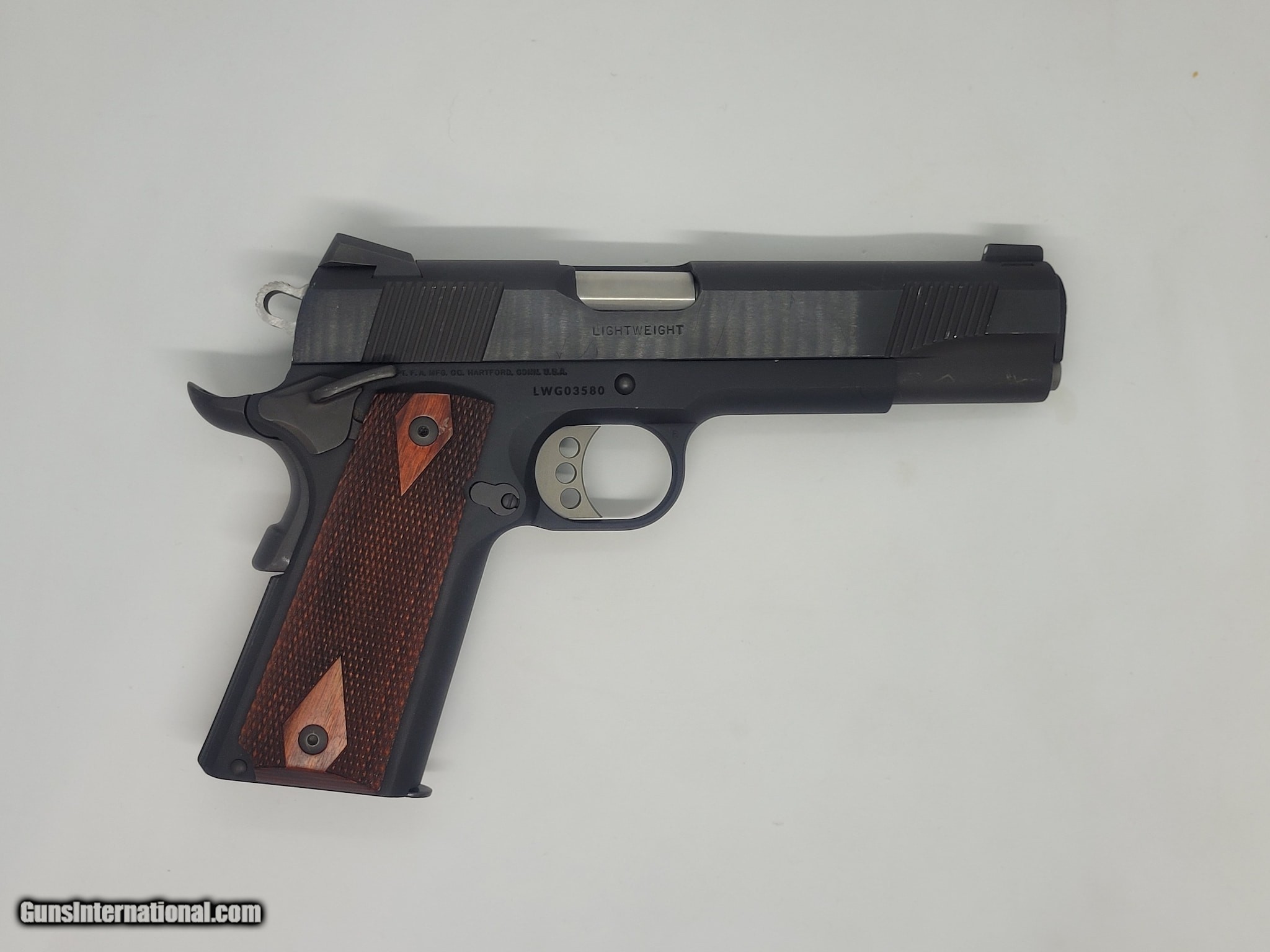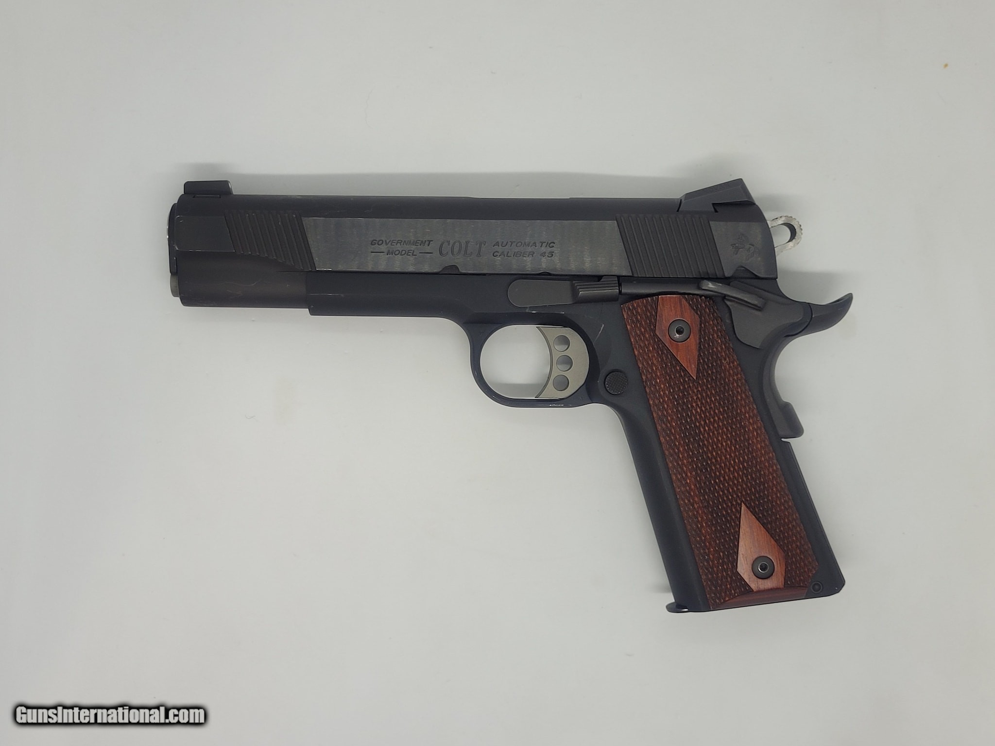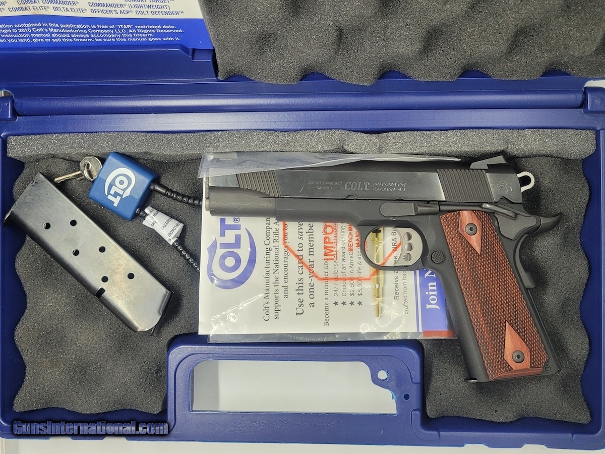 Description: Guns Listing ID: 913449 For sale is a good condition Colt 1911 Lightweight Government model 1911. It is chambered in 45acp, features a 5\" barrel, with a blued finish and wood grips, includes (2) 7 round magazines, owners manual, and original hardcase. Condition- The finish shows minor wear to hard edges on slide, and minor scuffing on bottom and top of slide. Hard edge of trigger guard, edge of safety and beavertail where it actuates into frame has wear. Very minor idiot scratch is also present. All in all this pistol is a shooter grade, far too much wear to be considered a display piece unfortuantely, but the price reflects this. Mechanical- Ambidextrous safety, fire control group, beavertail safety, slide catch and magazine lock are all functional. SOLD Manufacturer: COLT Model: 1911 LIGHTWEIGHT GOVERNMENT Caliber Info: .45 ACP Condition: Used - Non-Certified Barrels: 5 BARREL Finish: BLACK |