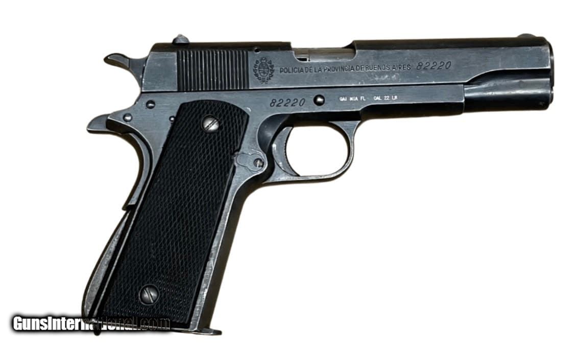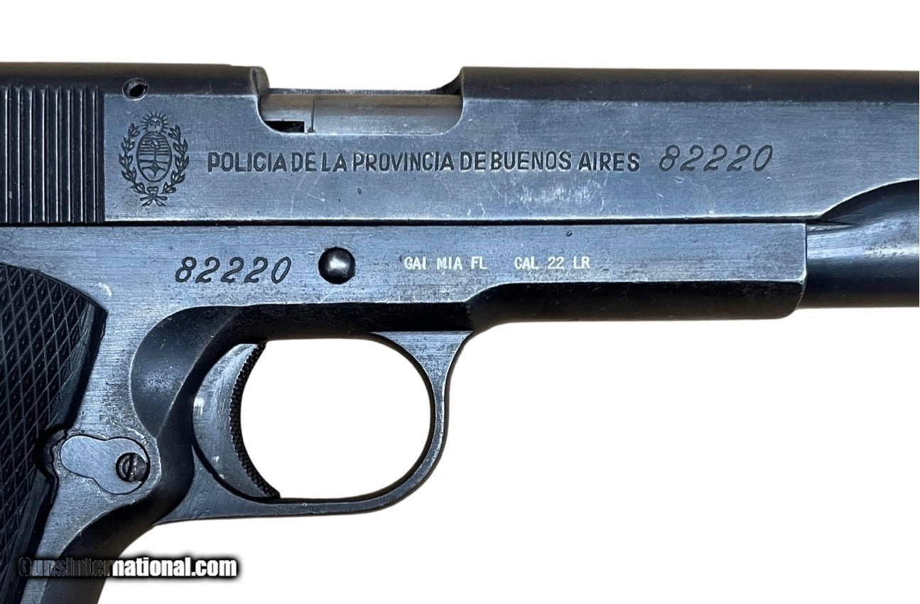 Description: Guns Listing ID: 424577 Colt 1911 Police Trainer in good condition with some wear and tare (See pictures for reference) 22LR 5\" barrel includes 1-10-Round Magazine. Has POLICIA DE LA PROVINCIA DE BUENOS AIRES on the Right side of the slide and D.G.F.M-(F.M.A.P.) on the Left side of the slide. SOLD Manufacturer: COLT Model: 1911 Police Trainer Caliber Info: 22 LR Condition: Used - Non-Certified Barrels: 5 BARREL Finish: BLACK |
