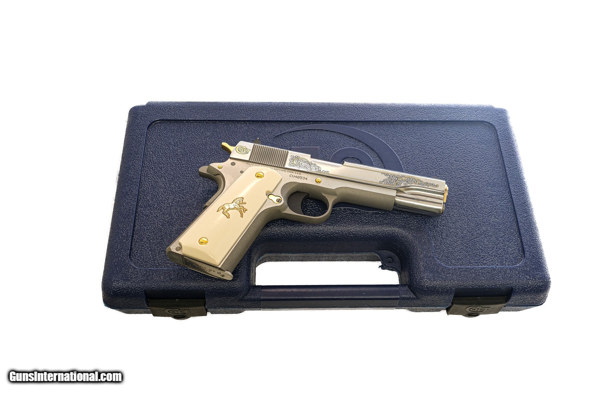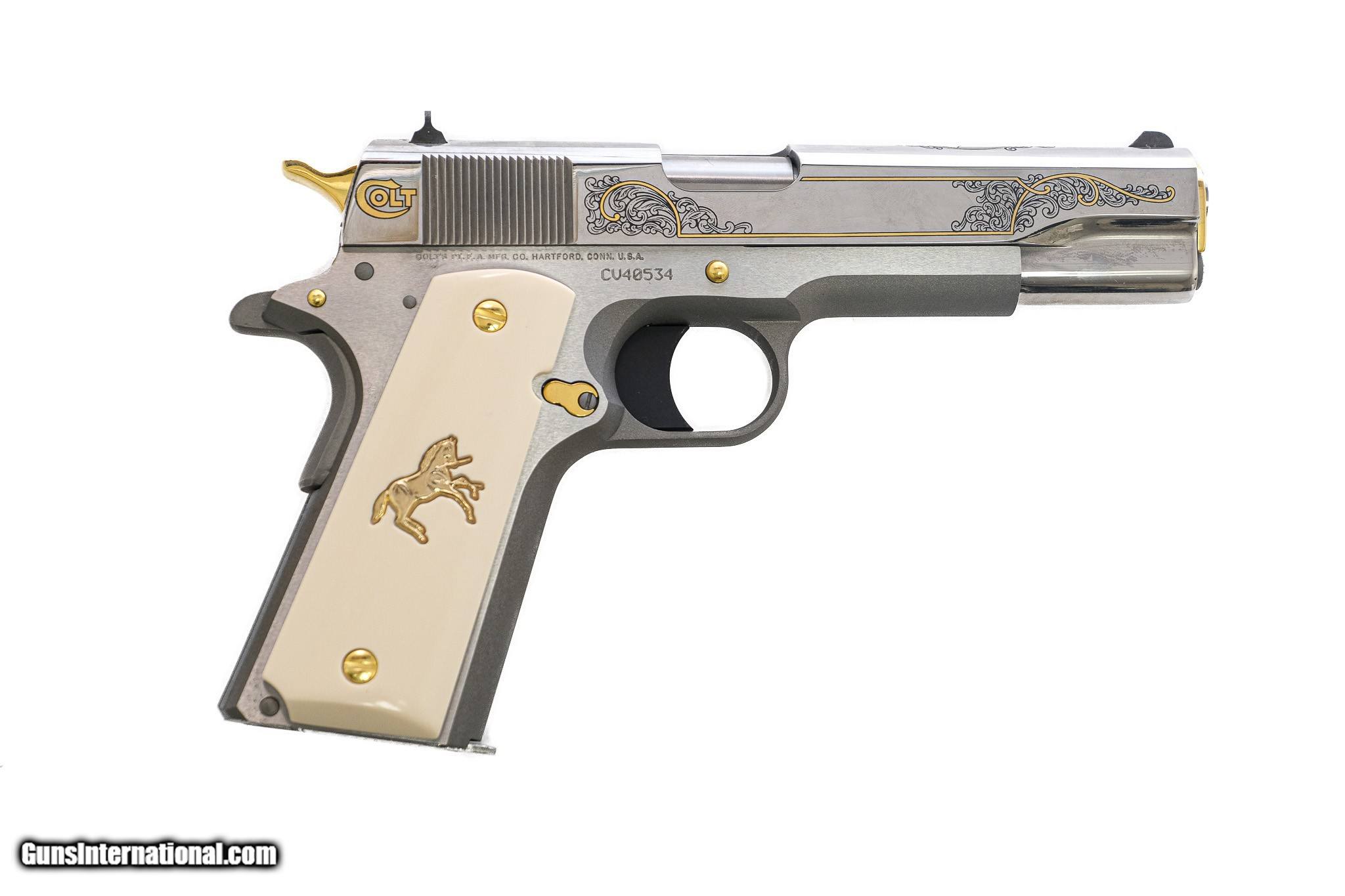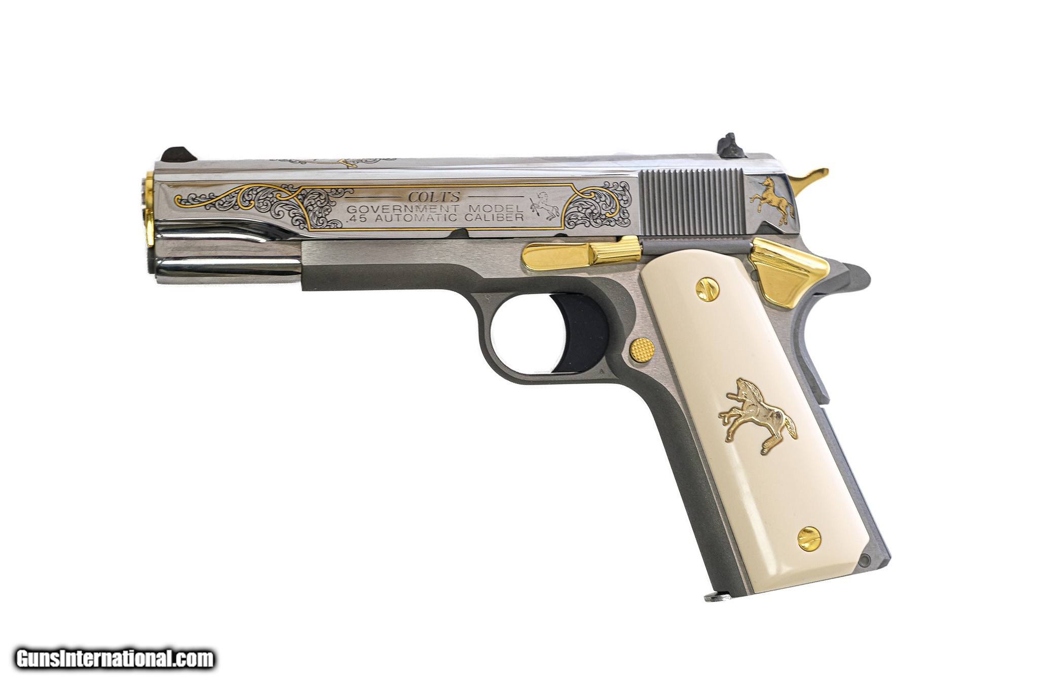 Description: Colt - 1911 Premier Government Model, .45 ACP. 5" Barrel. Matte finish with shiny nickel finish slide, gold line work and scroll engraving with gold inlayed rampant Collts, rare Lew Horton exclusive, gold hardware, gold rampant Colt on faux ivory grips, 100% new and unfired in factory box with accessories, available for immediate delivery. Inv: 76609 $3,250.00 SOLD |