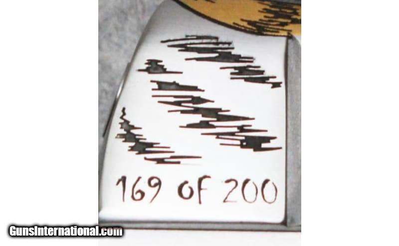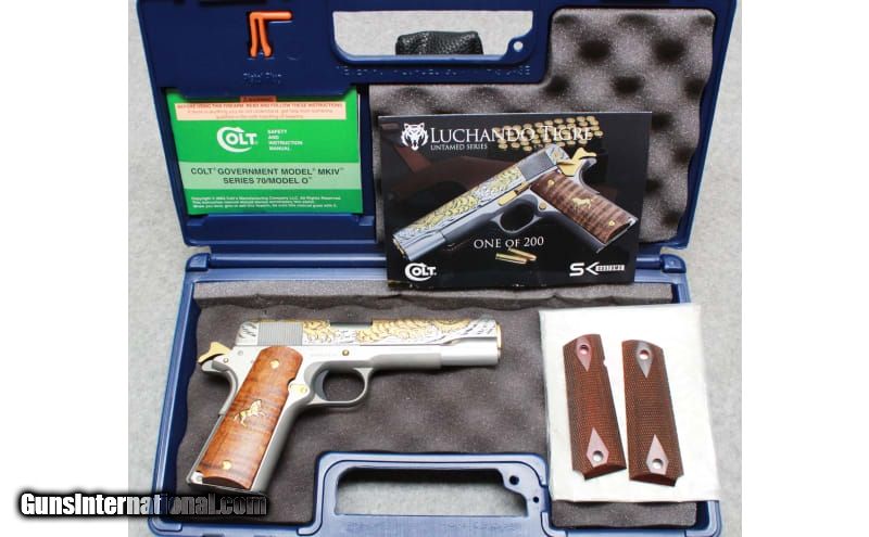 Description: SK Customs "Luchando Tigre." 38 Super Government Model represents the third edition of the Untamed series. "Luchando Tigre" comes from the native Atsatsilisti rain ritual in the Mexican state of Guerrero. Limited-edition product run of only 200 Colts, each feature a semi-polished stainless finish on the slide and frame flats. The tiger is covered in 24K gold and black-filled stripes with selective silver-plated eyes, teeth and claws. Grip panels of tiger Maple with 24 Gold Colt Stallions. New in Factory Box with manual and extra grip panels. .38 Super SOLD Metal Condition: NIB Wood Condition: NIB Bore Condition: Bright And Clear Barrels: 5 Inch Weight: 2 lbs 4 oz Sights: Fixed G.I. Sights Item Location: Allen, TX |