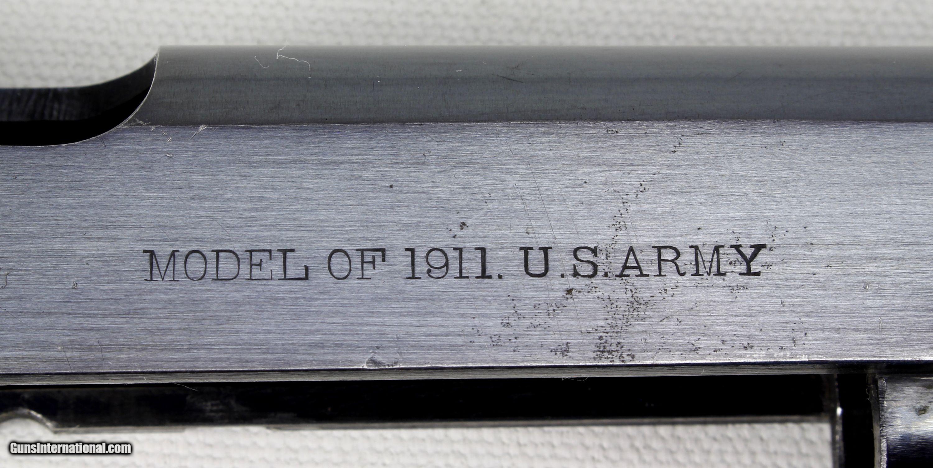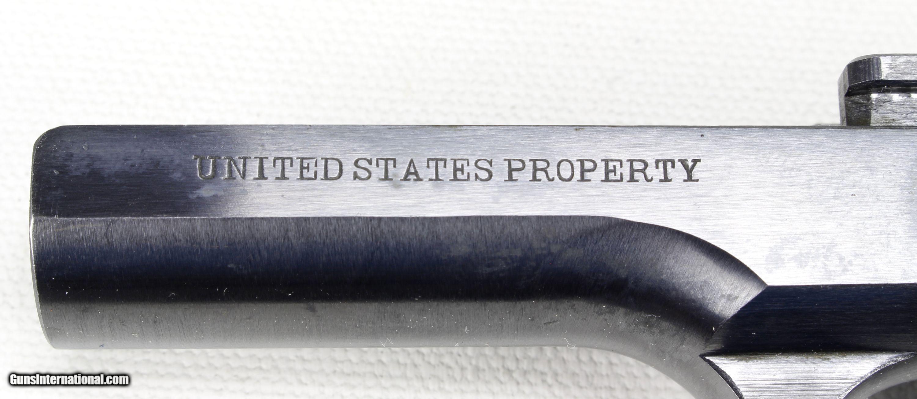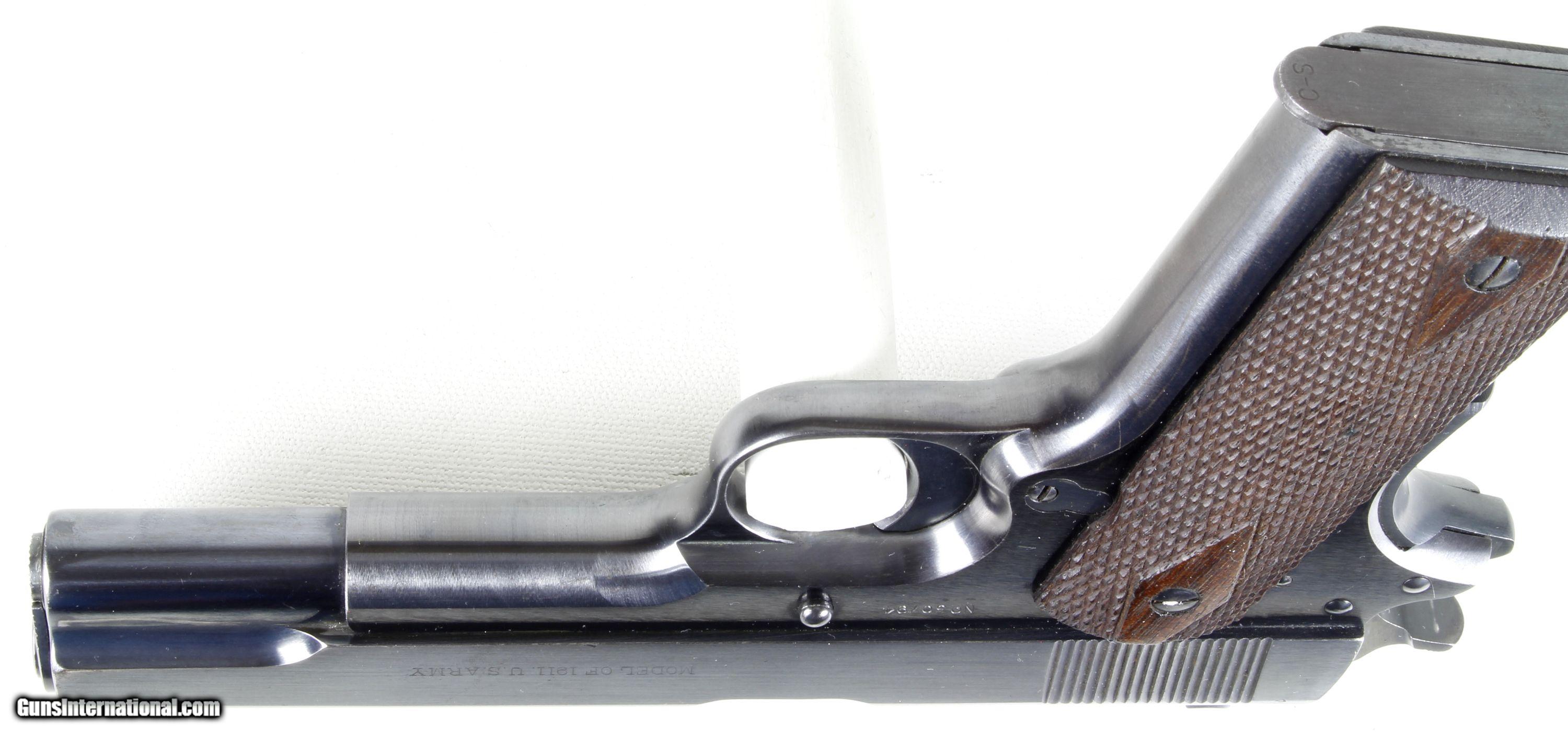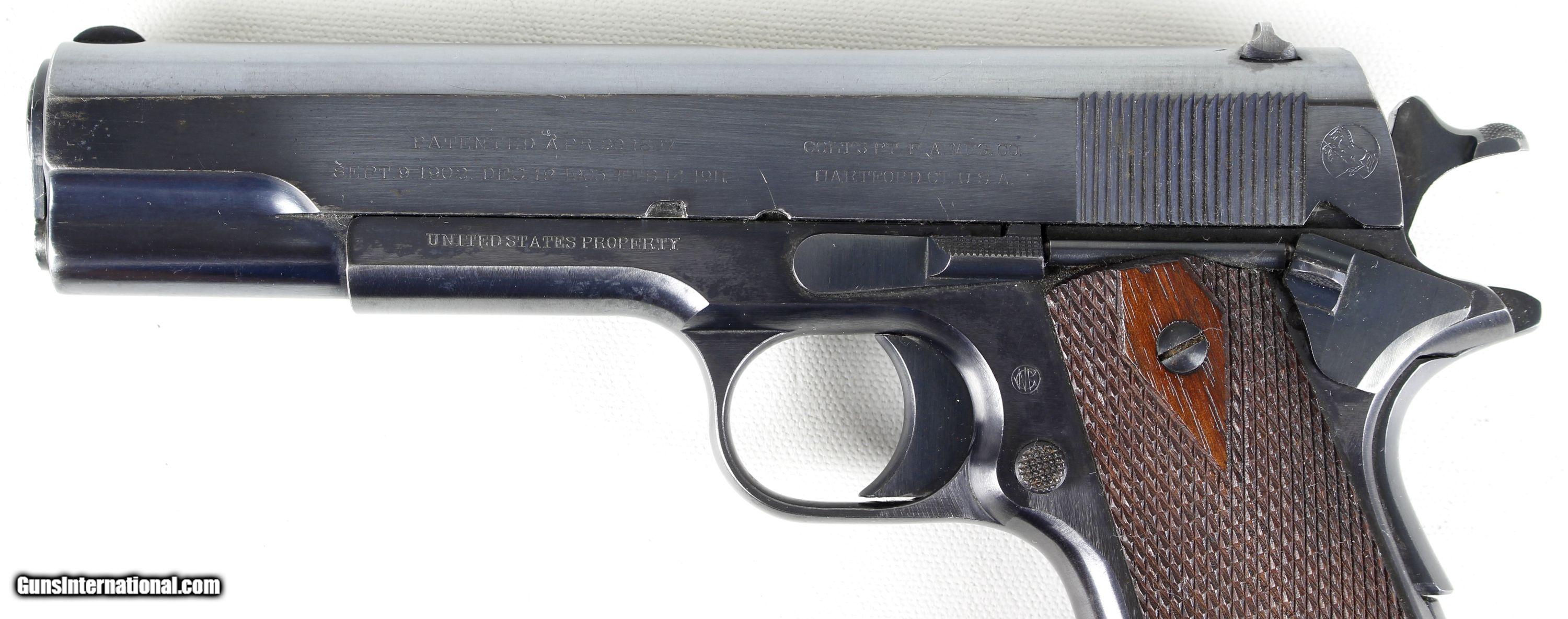 Description: COLT, Model of 1911, 45ACP, UNITED STATES PROPERTY on LEFT SIDE OF FRAME, MODEL OF 1911, U.S. ARMY on Right Side of Slide. Royal Blue. This gun is Original in every Detail, except Mag. Magazine is a WW2-era mag mfr'd by Scovill. Grips Appear Original. Excellent Bore, Mechanically Excellent. This is the Finest Condition Early 1911 we have seen. SN#50794, MFG: 1913. There is some question as to whether the slide on this pistol has been replaced with an earlier slide due to the circled rampant colt on the left rear. We are unable to definitively determine if this is the case. The water is muddied because Colt had a tendency to never throw anything away and always ran a percentage of over-run parts to take care of any rejections. It is known that there were a number of Navy contract Colts with circled rampant colts in 1913 in the serial number range of 38XXX-43XXX. Because of this we can't disprove this slide could have come from Colt this way either. The finish on the slide is original and matches the condition of the rest of the gun. Ships to Lower 48, W/Insurance: $65.00 SOLD Manufacturer: COLT Model: 1911 Serial Number: 50794 Caliber Info: 45ACP Bore: EXCELLENT Condition: EXCELLENT Metal Condition: EXCELLENT |