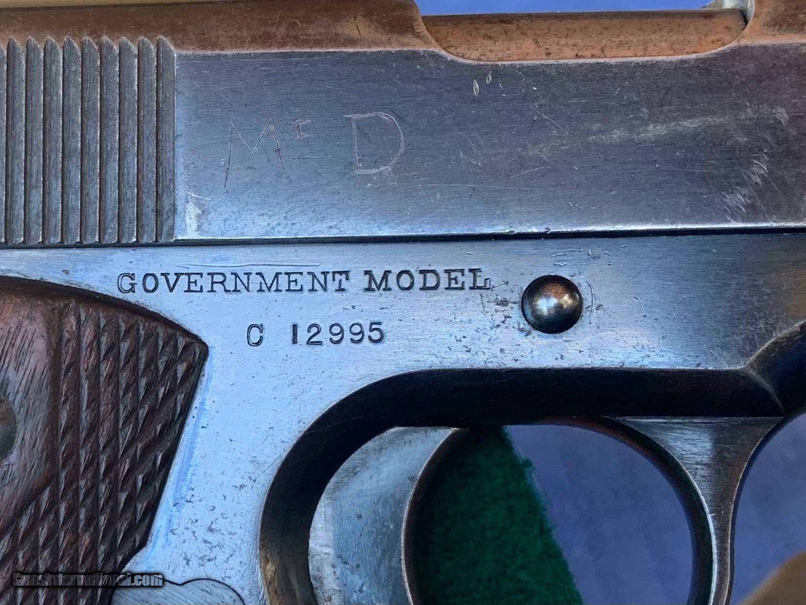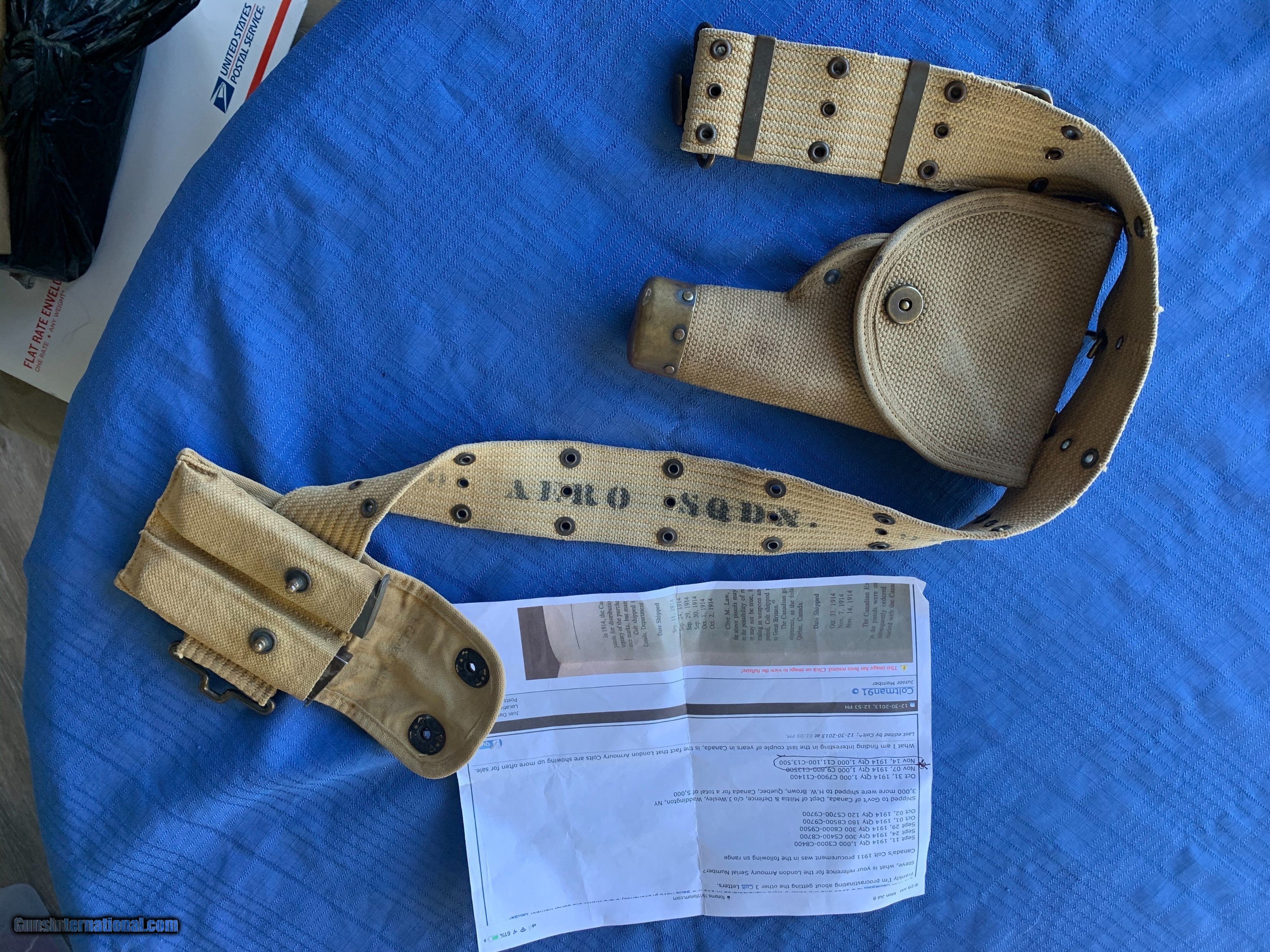 Description: Colt 1991 45 auto . Serial number C12995 . Shipped in 1914 to the Canadian Military ! Comes with original holster and rig . Documented by Serial number . Crisp Example of a used gun that was carried in this holster during WW1 . Looks to be mostly holster wear. All parts are correct. Bore and mechanics are Excellent Plus Condition. Gun locks up tight ! Most of the original finish still remaining. With scuff marks and handling marks . Also has 2 intitals on right side of frame . Overall a excellent example of a early 1914 Colt 1911. Please review my photos and email me with any questions ? 3 day inspection as allways ? Thank you for looking Little Jo SOLD Curio/Relic: Yes Handgun Caliber: .45 ACP (.45 Auto) Manufacturer: Colt Model: 1911 Serial Number: C12995 |