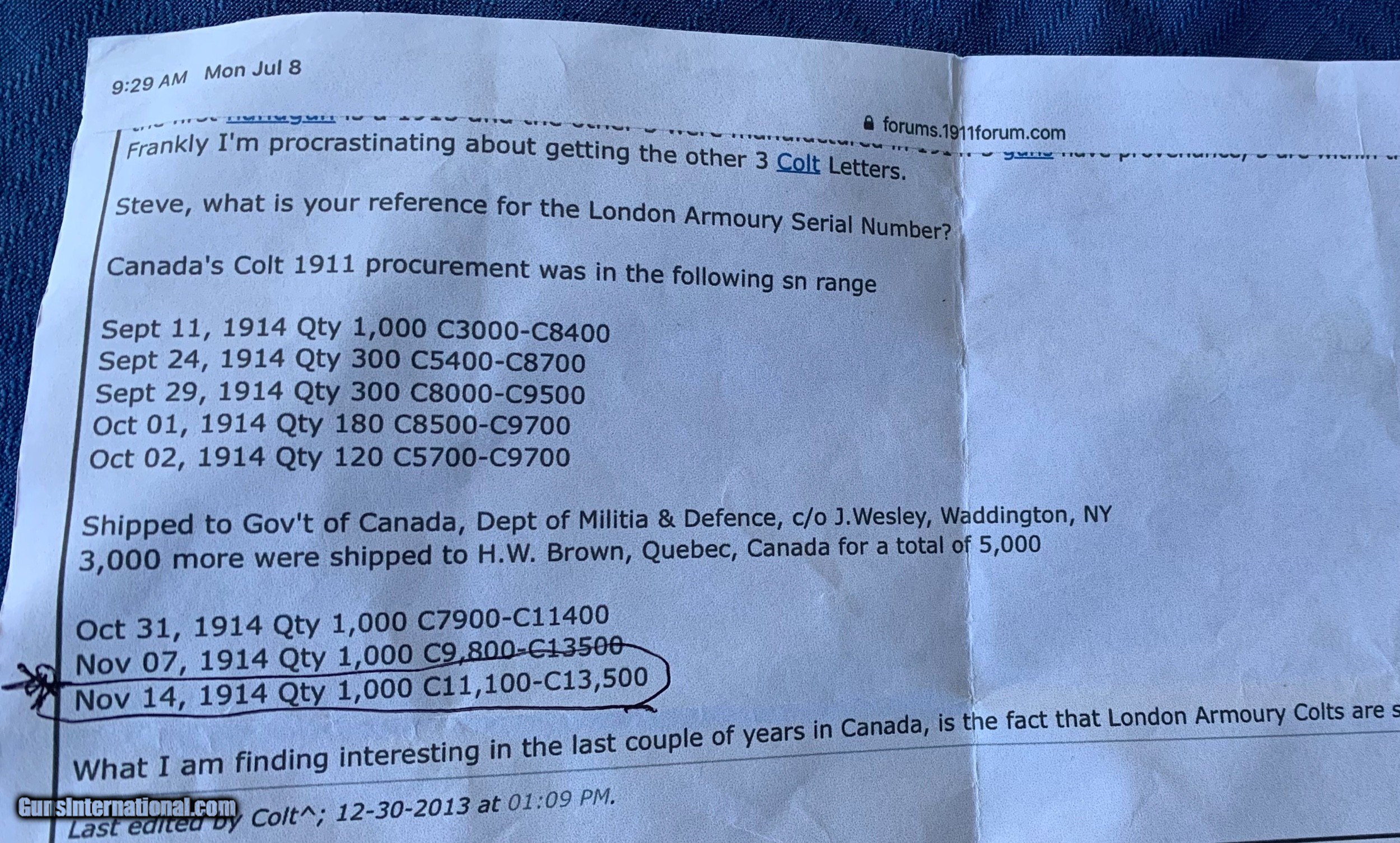 Colt 1911 Serial number C12995- shipped 1914