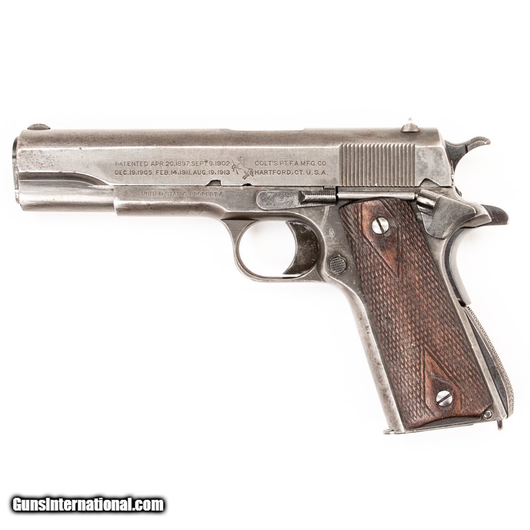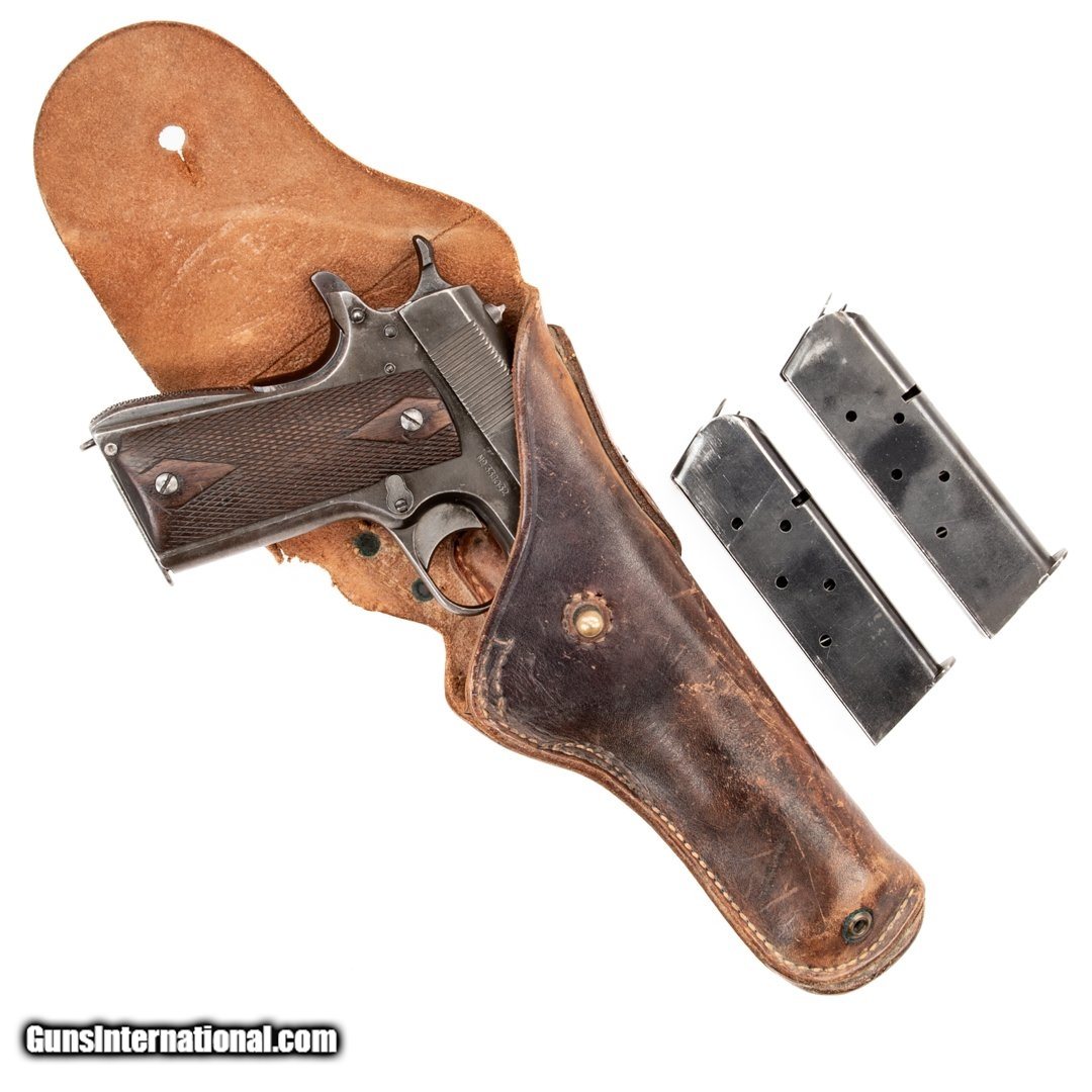 Description: Guns Listing ID: 1220435 This Colt 1911 features three 7-round magazines, owner‚‚s manual, a leather military style holster, wooden grips and stamped on the side reads, \"United States Property\". Get the best bang for your buck when you get a Certified Used Firearm . When you see the Certified Used stamp on any of our firearms, you can be confident that you’re getting exactly what you want – a gun only in very good to excellent condition and held to the highest quality standard. All Certified Used Guns come with a ‘no questions asked’ return policy . PLUS, ALL CERTIFIED USED GUNS SHIP FREE SOLD Manufacturer: COLT Model: 1911 U.S. ARMY Caliber Info: .45 ACP Condition: Used - Non-Certified Barrels: 5 BARREL Finish: BLACK |
