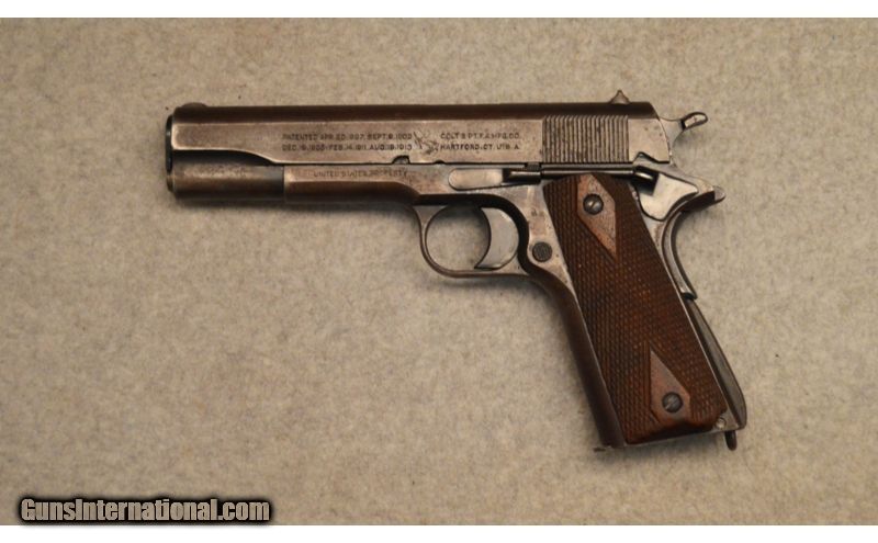 Description: Colt US Army 1911 Semi-Automatic Pistol (made in 1918), .45 Auto with 5" barrel, blue finish, checkered diamond wood grips, standard rear sight and front post sight, and grip safety. It has some pitting inside the barrel but the rifling is strong. SOLD Manufacturer: 1918 Caliber Info: .45 Auto Metal Condition: Fair Wood Condition: No cracks Bore Condition: Some pitting inside barrel but the rifling is strong Barrels: 5 Triggers: Factory Butt Pad: Factory Colt Weight: 2lbs 6oz Sights: Factory Item Location: Richfield, WI |
