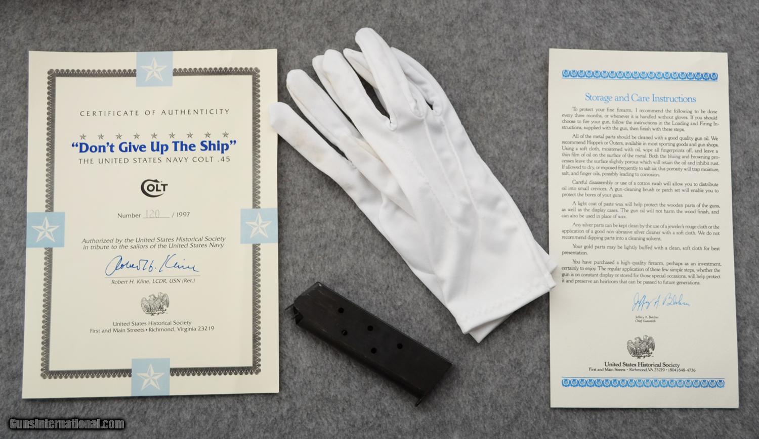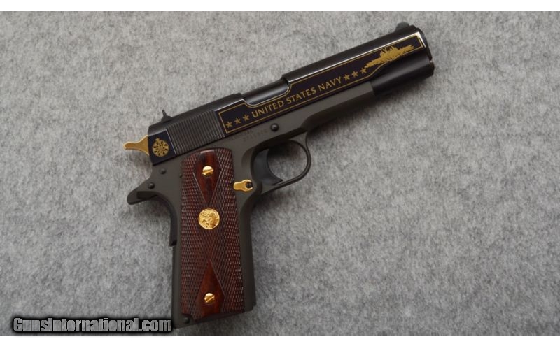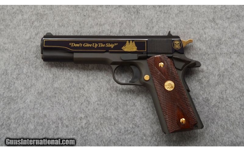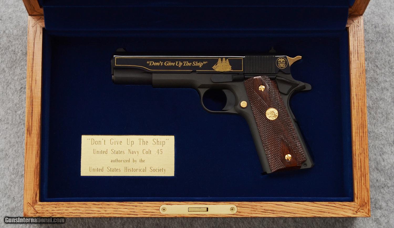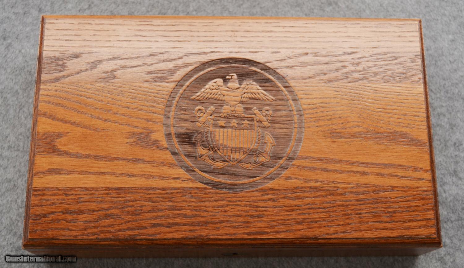 Description: Colt 1911 United States Navy Commemorative .45 Auto. "Don't Give Up The Ship" United States Navy Colt .45, authorized commemorative by the United States Historical Society. As new, unfired condition and includes oak display case, and certificate of authenticity. SOLD Caliber Info: .45 Auto Metal Condition: Pre-owned but in as new condition. Wood Condition: Pre-owned but in as new condition. Bore Condition: Pre-owned but in as new condition. Barrels: 5 Triggers: Single action. Stock: Walnut with gold Colt medallions and screws. Sights: Fixed front drift adjustable rear. Item Location: Boise, ID |