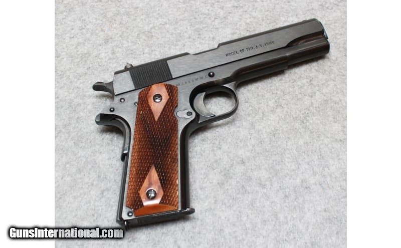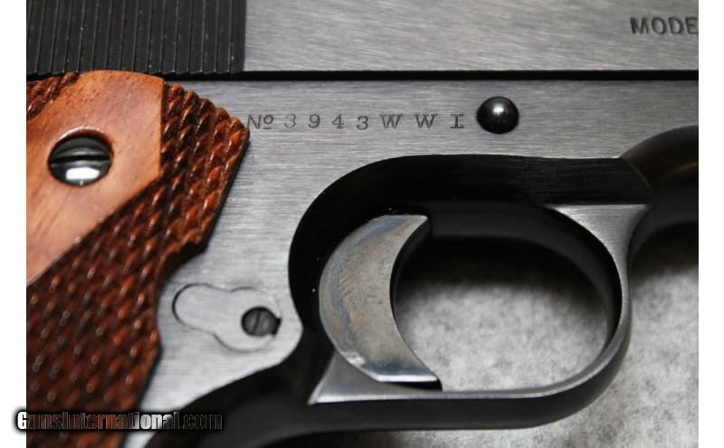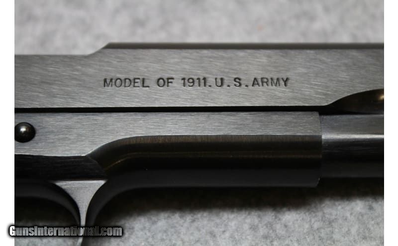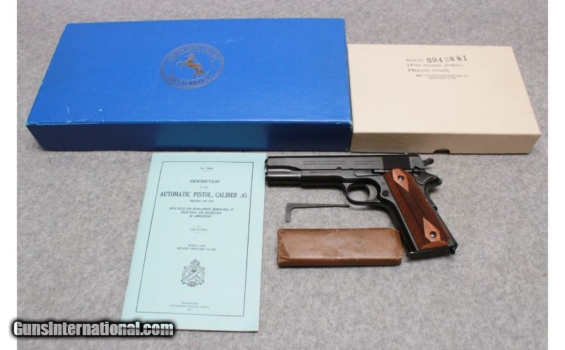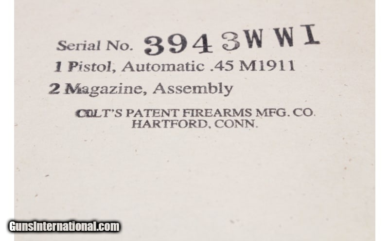 Description: Colt 1911 U.S. Army semiautomatic pistol chambered in .45 auto. Circa 2009. This unfired reproduction of the pistol issued to the doughboys in WW1. Comes with original factory box, 2 magazines, tool, and brown box that it was originally shipped in. .45 Auto SOLD Metal Condition: NIB Wood Condition: NIB Bore Condition: Bright and Clear Barrels: 45 Inch Butt Pad: Double Diamond Wood Weight: 2 lbs 6 oz Sights: Blade Front / Fixed U-Notch Rear Item Location: Allen, TX |