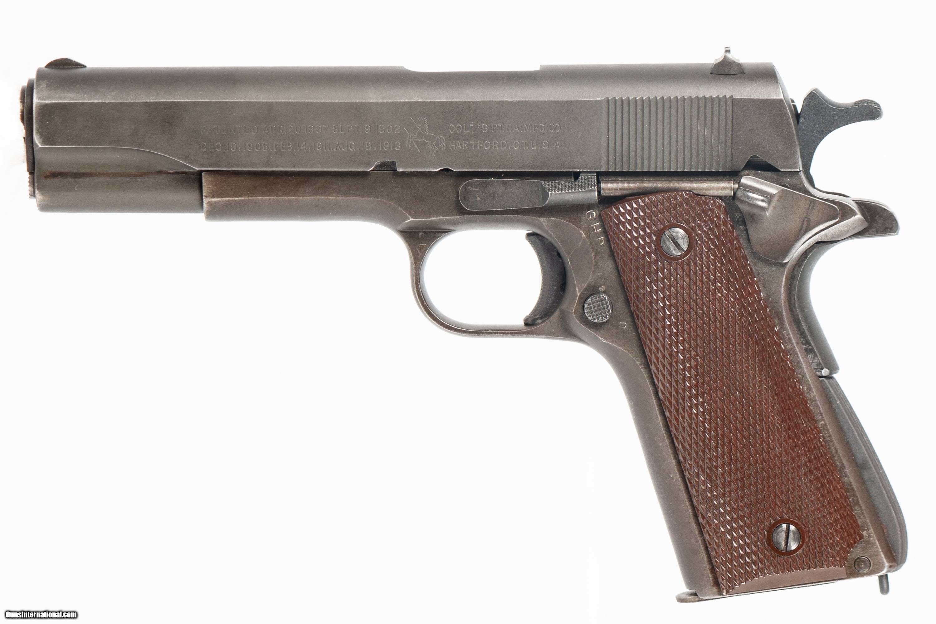 Colt U.S. Property Marked 1911 chambered in 45 ACP with a 5 inch barrel and a bright & shiny bore. the frame has the cross cannon arsenal cartouch on the back left corner on the right side and comes with a period correct holster. This 1944 Colt manufactured firearm would be a magnificent addition to any collection. This firearm is in very good condition and is covered by Dury's Lifetime Warranty.
