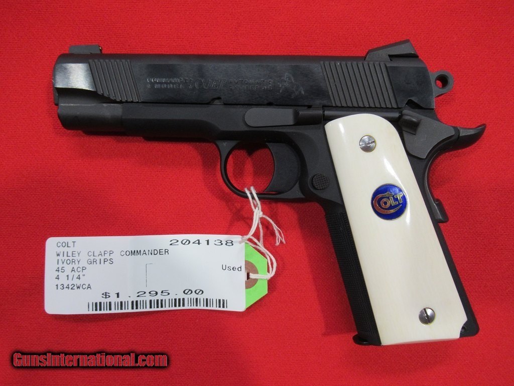 Description: Colt 1911 Willey Clapp Commander 45acp 4.25" -- Colt Wiley Clapp 21st Century Commander Talo Exclusive - 1911 style .45 that features a blue/black anodize finish, 4¼" barrel, lightweight alloy receiver, series 70 style action, beavertail grip safety. This gun has the factory grips and an addtioinal set of ivory grips with Colt emblem. Mint with case and paperwork. SOLD Handgun Caliber: .45 ACP (.45 Auto) |
