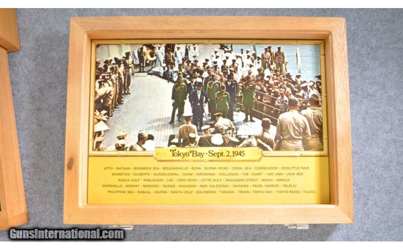 Description: In 1970 Colt produced the WW II series European and Pacific Theater Commemoratives. The Pacific Theater series began with serial no. 0001PTO through 9960PTOalthough not all were shipped according to the Blue Book of Gun Values. This particular edition is numbered 7048PTO and is in unfired condition. SOLD Manufacturer: 1970 Caliber Info: .45 Automatic Colt Pistol Metal Condition: As new Wood Condition: As new Bore Condition: As new / unfired Barrels: 5 Triggers: Single Action Stock: Smooth Walnut with Colt Medallions Weight: 40 oz Sights: Fixed Extras: Presentation case with chrome .45 dummies and plaque inscribed " WORLD WAR II COMMEMORATIVE Asiatic-Pacific Theater December 7, 1941 - September 2, 1945 Item Location: Grand Junction, CO |