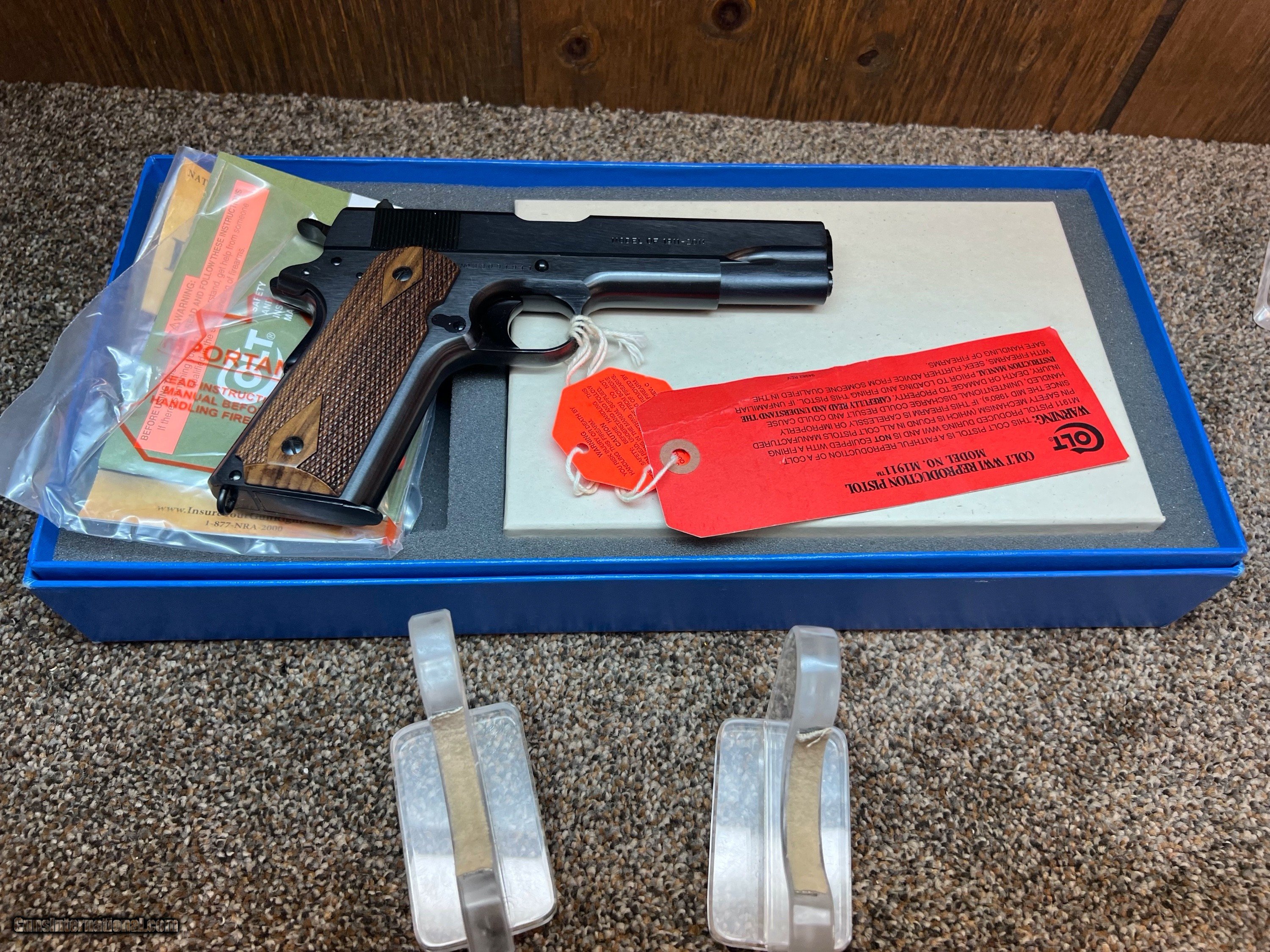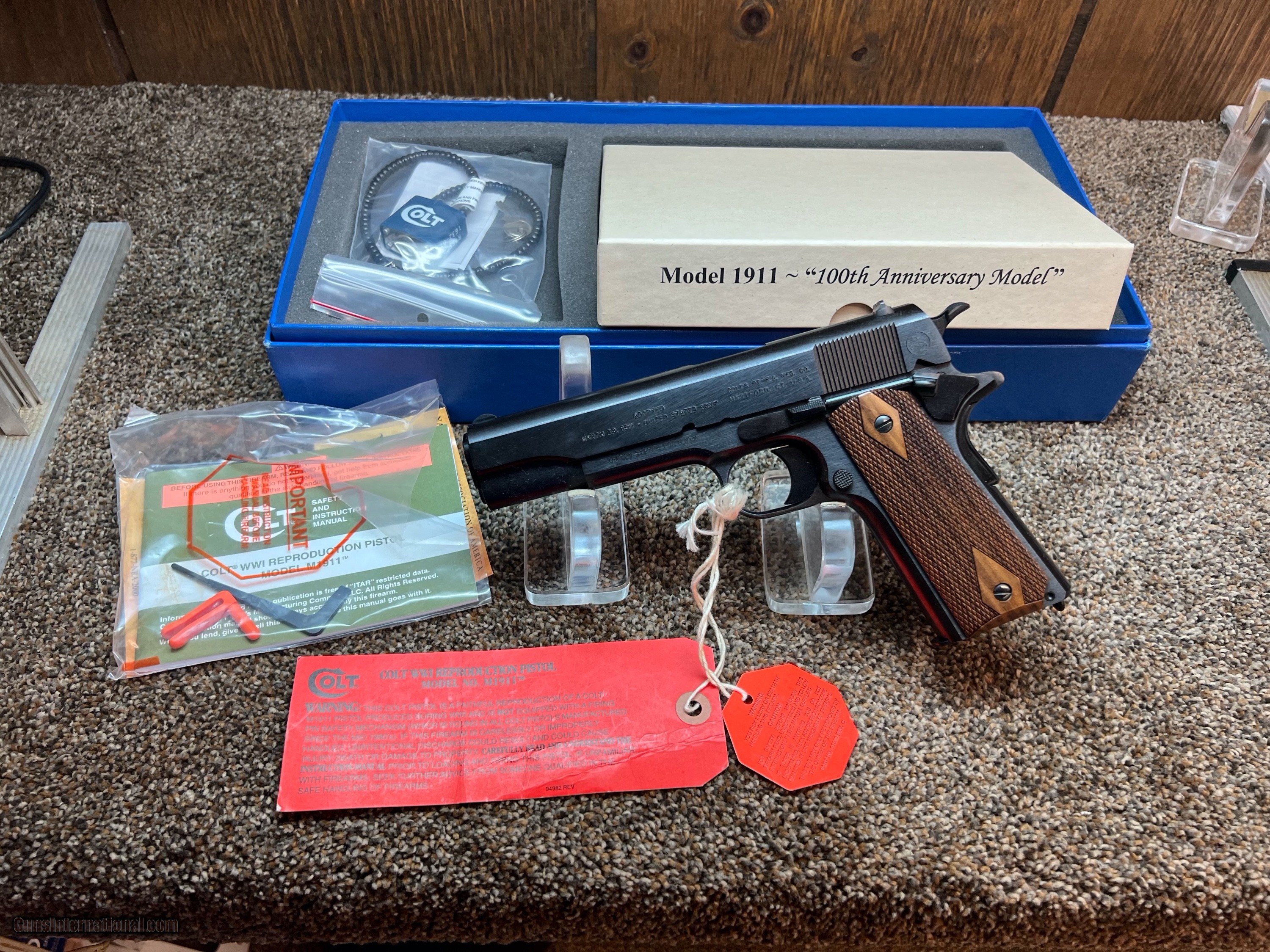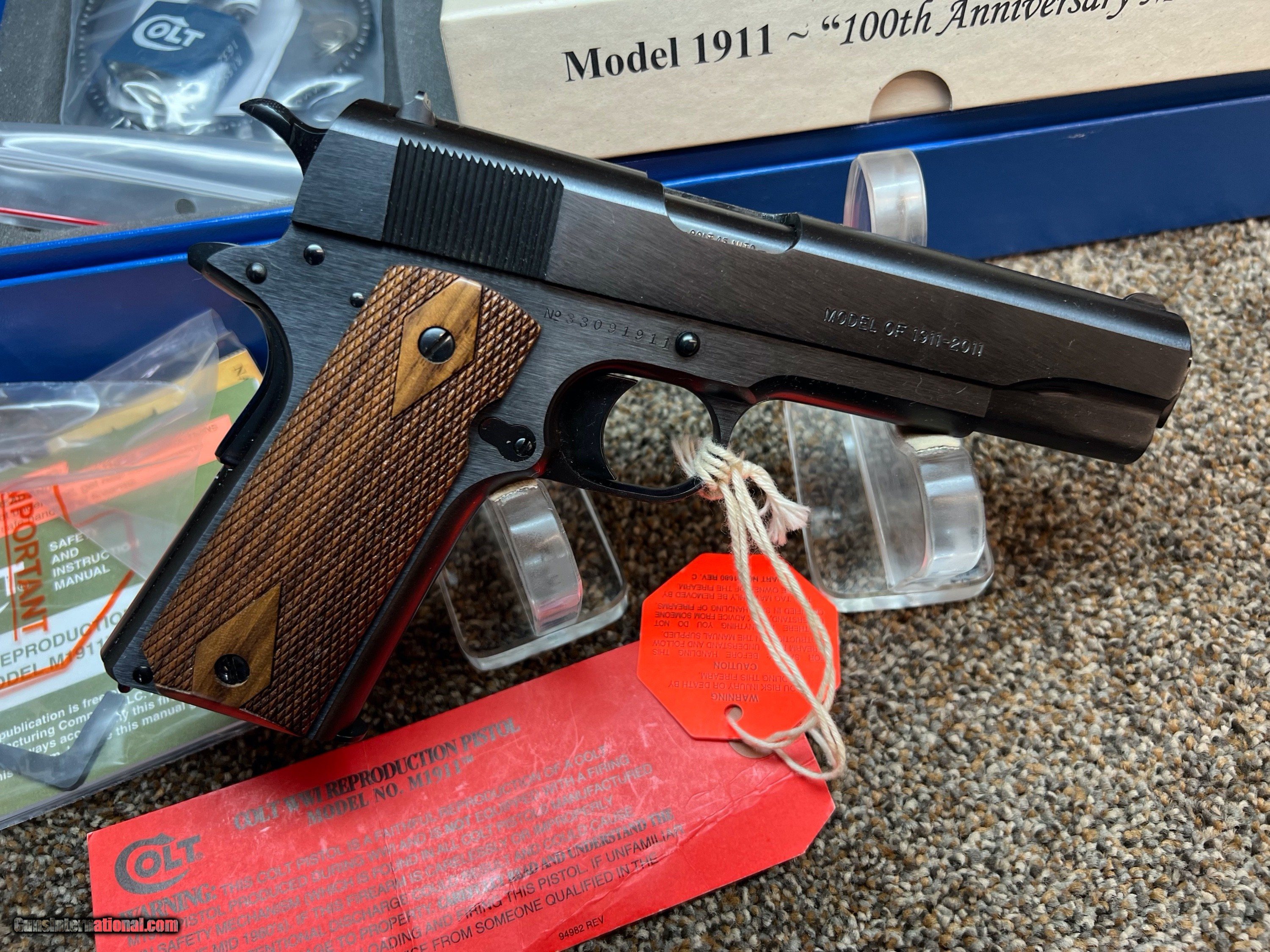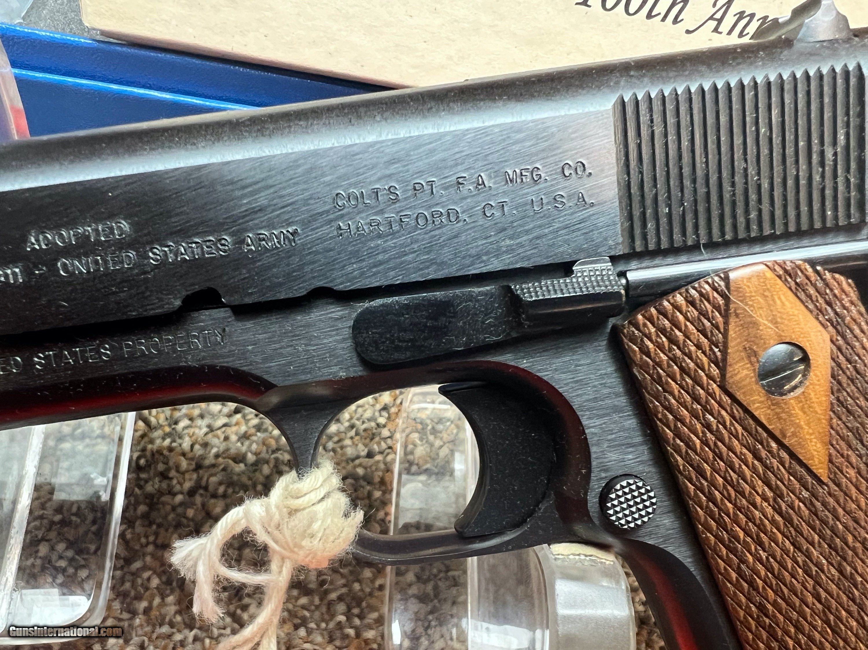 Description: Here's a limited edition Colt 1911 100 Year Anniversary WW1 remake 45 auto, 5" barrel, fixed sights, checkered wood grips, with orig box, extra magazine, paperwork, lock and Colt blue box, no outer white sleeve, made in 2011! 2.99% credit card fee, 50.00 shipping, PA residents add 6% sales tax. SOLD Handgun Caliber: .45 ACP (.45 Auto) |