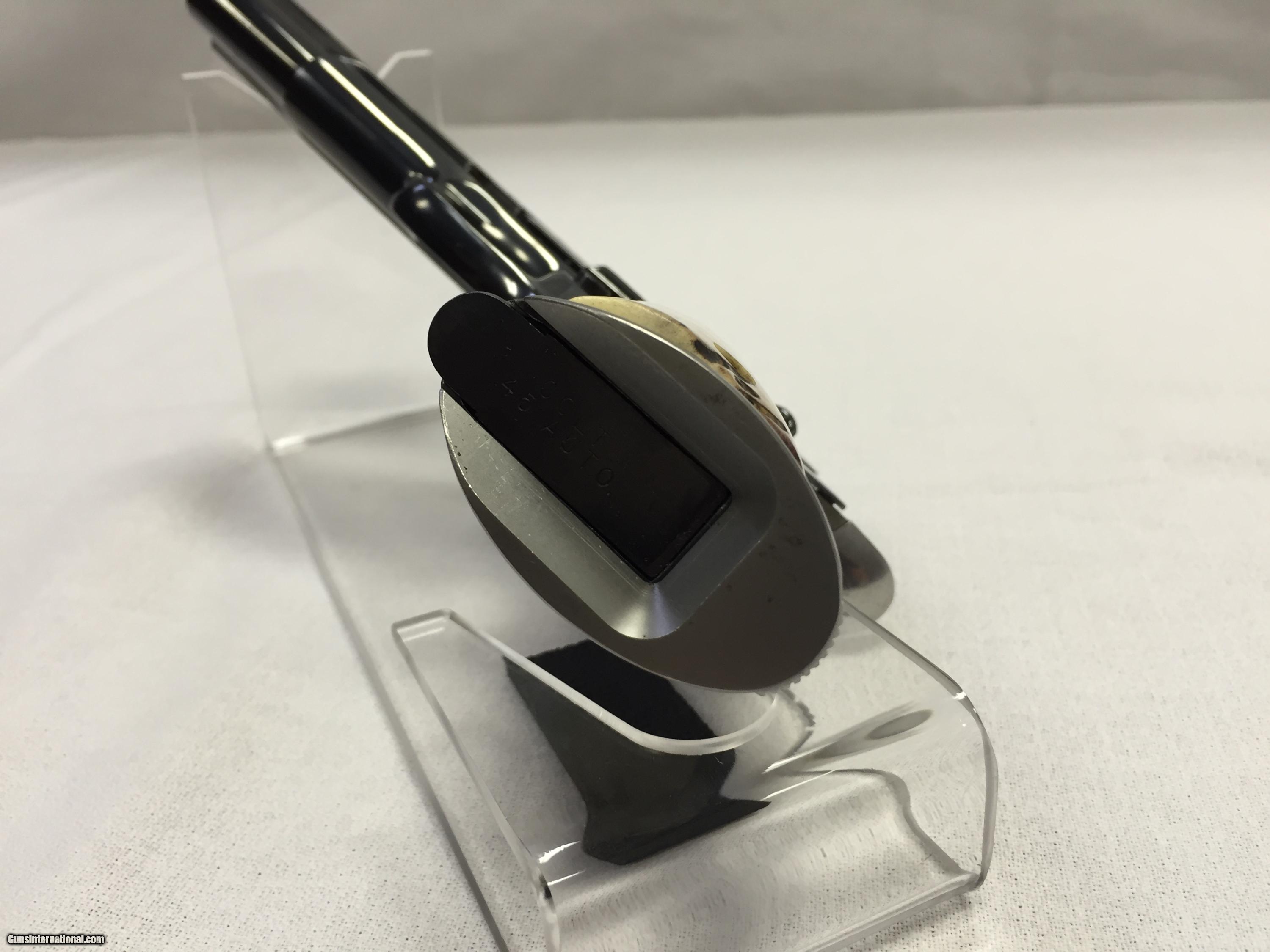 Description: Starting life as a Colt WWI Chateau-Thierry Commemorative, this gun has been customized as a competition pistol. It has been fitted with a Briley barrel, Bo-Mar sights, an Ed Brown barrel bushing, stag grips, full length guide rod, a beavertail grip safety, Commander hammer, and a flat, checkered mainspring housing with extended magazine well. The slide bears a commemorative rollmark on the right side with a battle scene on the left. This pistol shows expected wear on part movement surfaces. There is some rust freckling on the bottom of the magazine well. The bore is bright with sharp rifling. This pistol some mild holster wear as well as has a fair amount of scattered small handling marks. There is a scratch on the left from reinstalling the slide stop. The rear sight is slightly loose in the dovetail. SOLD Manufacturer: Colt Model: 1911 WWI Commemorative Caliber Info: .45 Auto Metal Condition: Some holster and handling wear. Scratch on left side of frame. Freckling on magwell. Wear on part movement surfaces. Wood Condition: No noticeable wear. Bore Condition: Bright with sharp rifling. Barrels: 5 Barrel Type: Briley Action: Semiautomatic Triggers: Single Action - Solid, long reach trigger. Stock: Smooth stag grips with Colt medallions. Finish: Blued Weight: 2 lbs. 14 oz. Sights: Bo-Mar adjustable sights. Rear is slightly loose in dovetail. Manufacture Date: 1967 Chokes: Commemorative rollmarks on slide. |