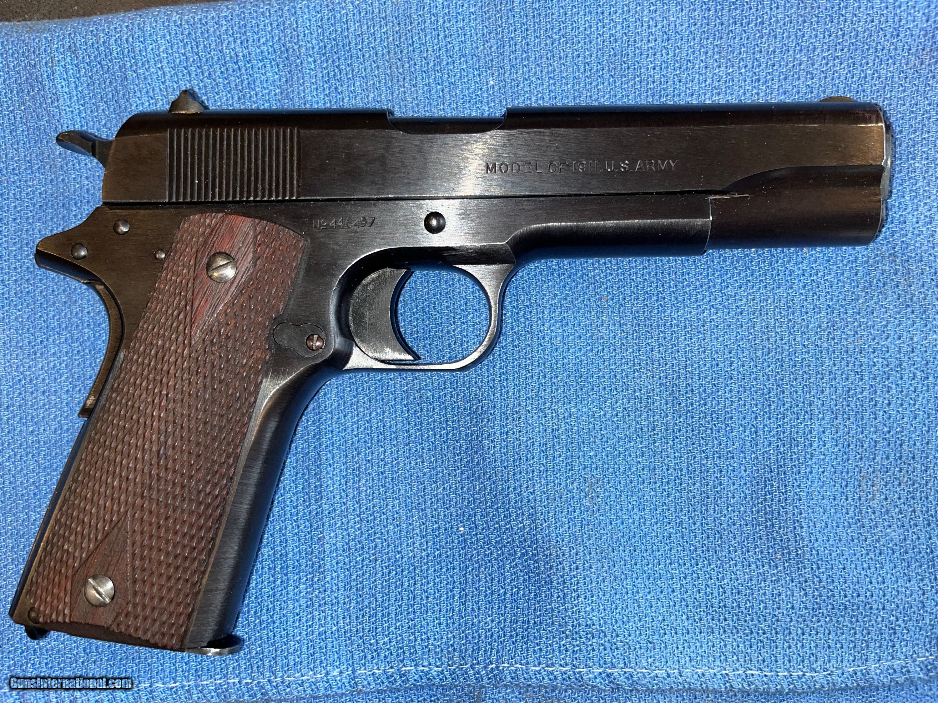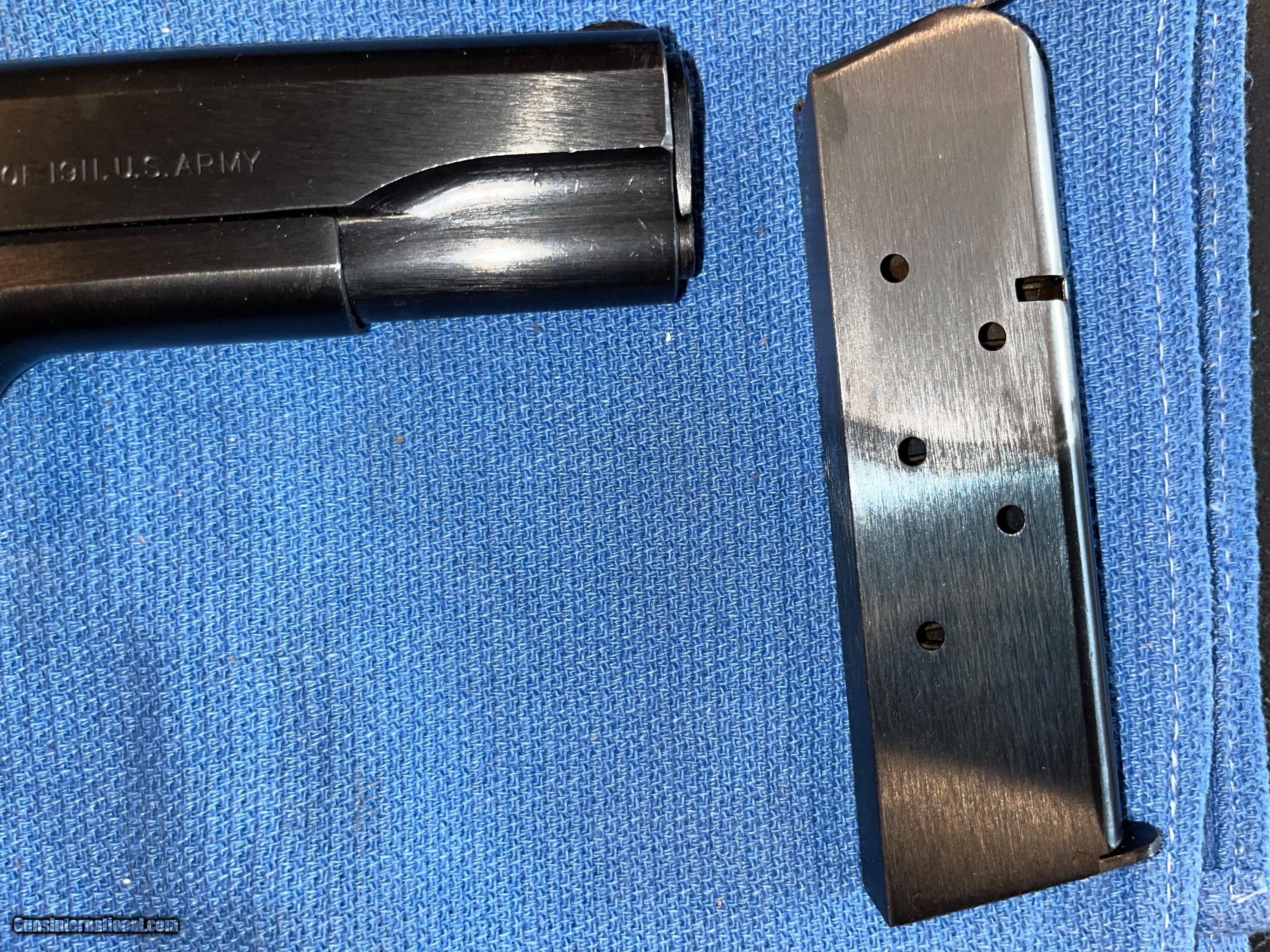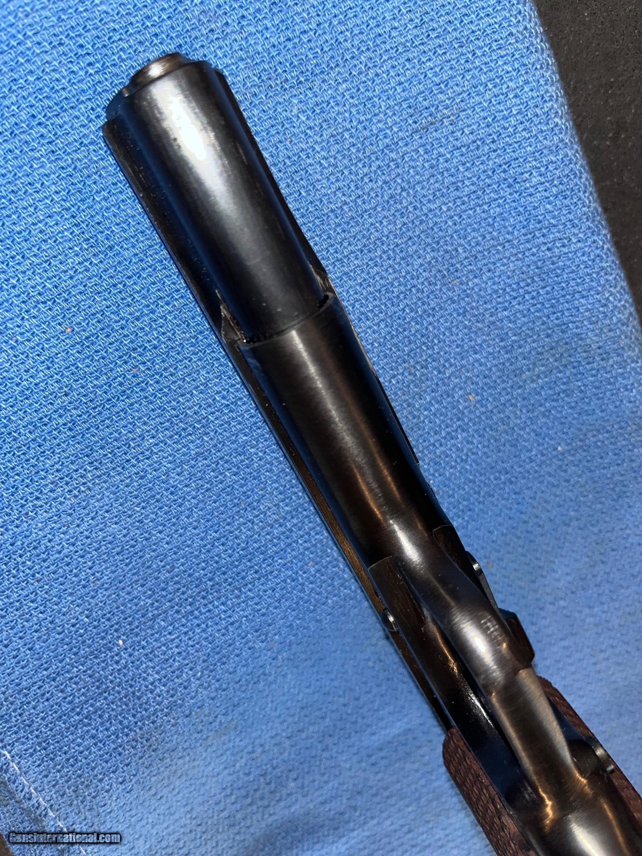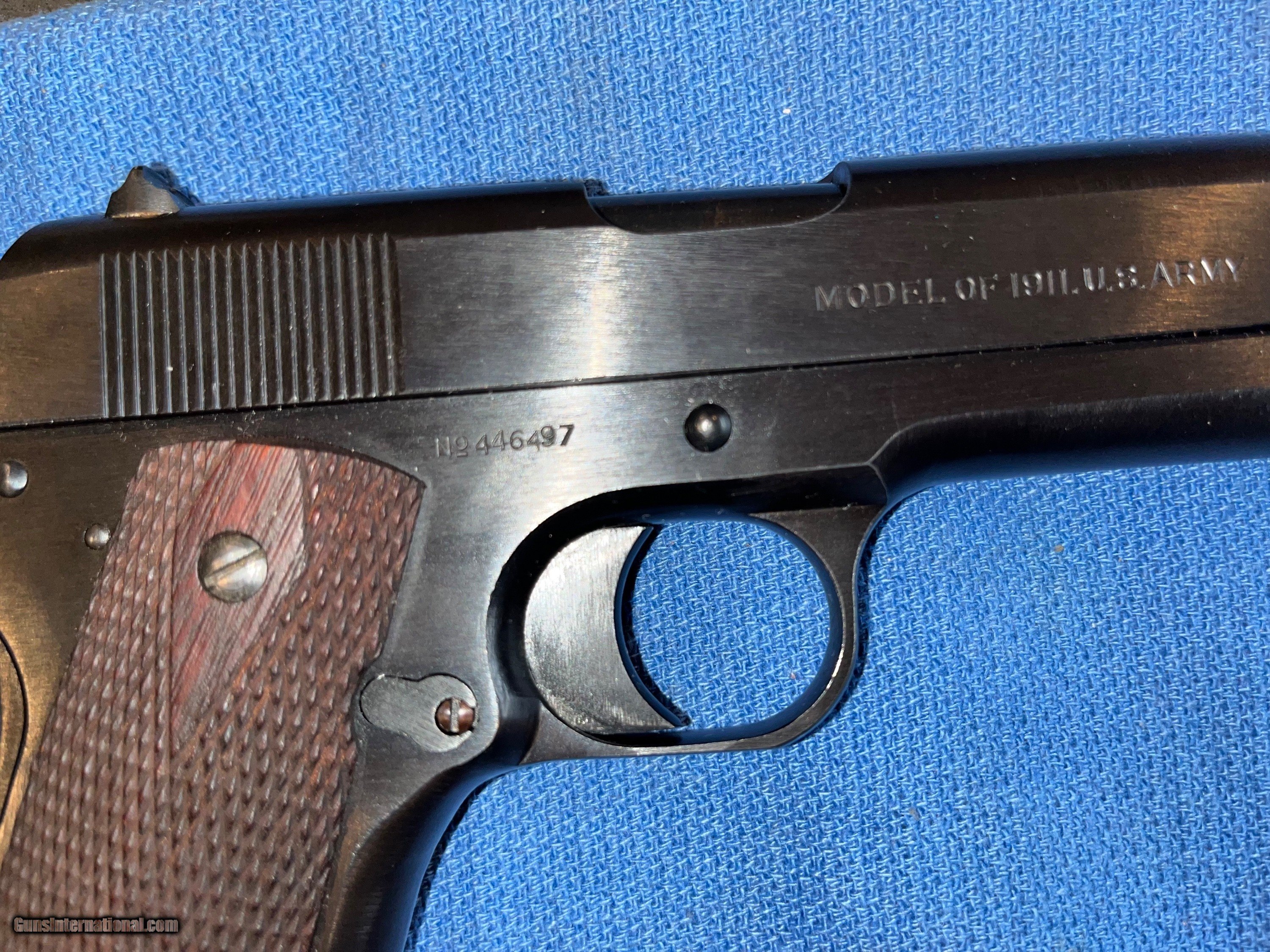 Description: Colt 1911 US Property 45 ACP. Serial number 446497. This pistol was shipped in 1918 and is an exceptional example of a late WW 1 Colt 1911. All original. Correct Barrel. The Grips are in great condition, original and sharp. The magazine is an original two tone. Overall this is a top notch example of a late war Colt. If you have any questions please ask. SOLD |