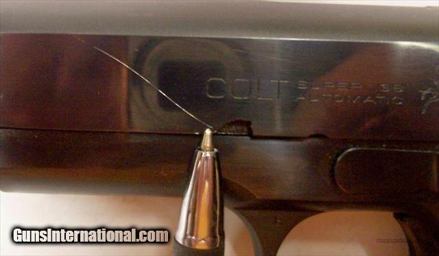 Description: This .38 SUPER Cal. Colt 1911A is in 99% condition except for a light shallow scratch as noted by the pen point.(Could cold blue it). S# 180375 Mfg. 1966 $2500.00. Phone # 732 280 8750 rmgrigolettoyahoo SOLD |