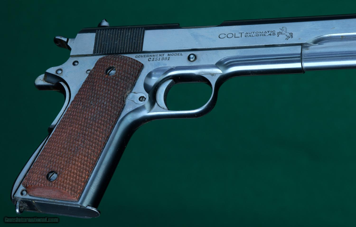 Description: 5" barrel. C-prefix commercial. Full-checkered walnut grips. Checkered trigger, hammer, thumb safety, takedown latch, magazine release and lanyard loop mainspring housing. Slide numbered to frame. Unmarked two-tone magazine. Mfd 1927. Inspector mark 51 on upper right side of triggerguard; final inspector mark W and VP on upper left. 99%+blue. SOLD Curio/Relic: Yes |