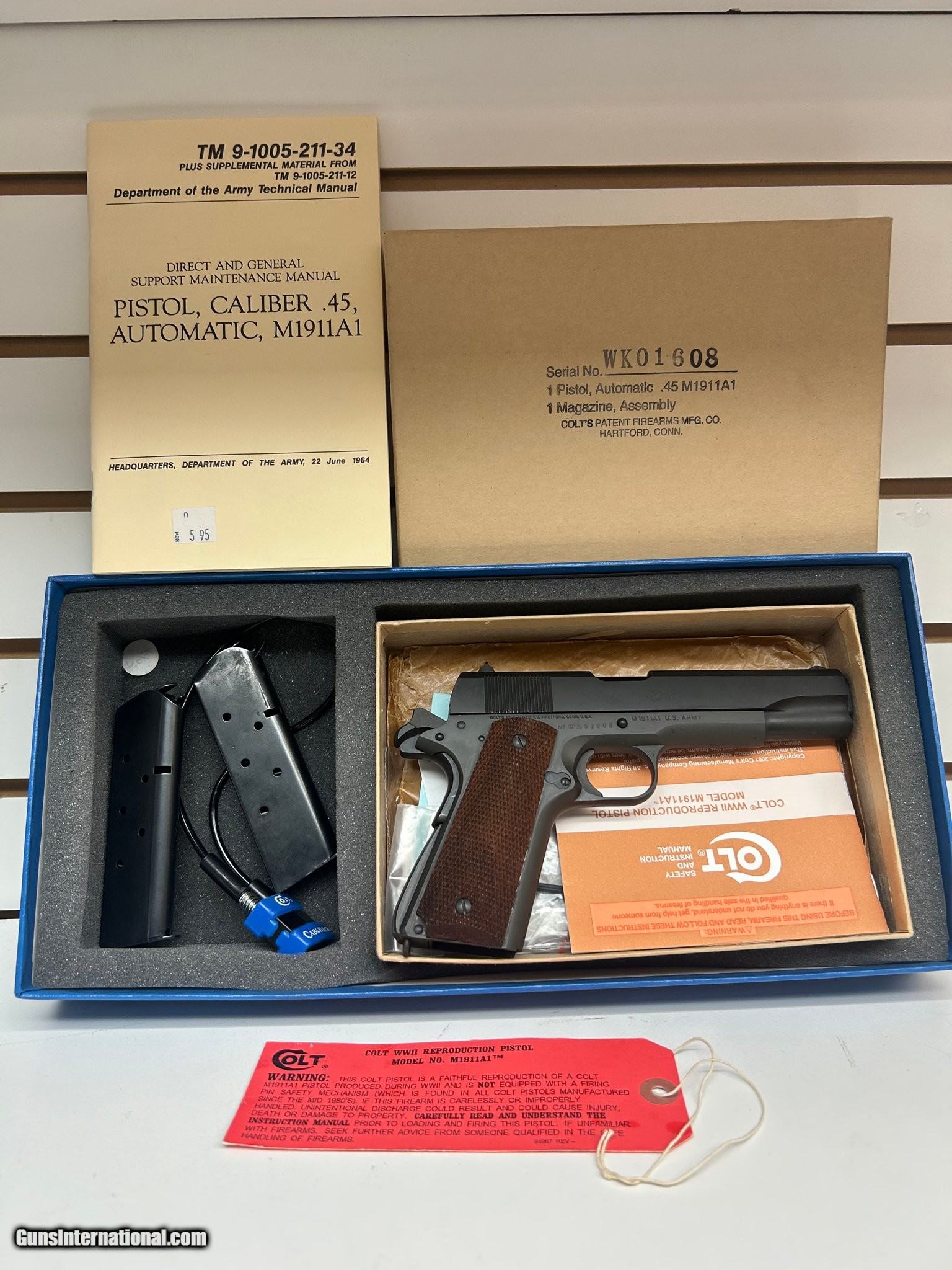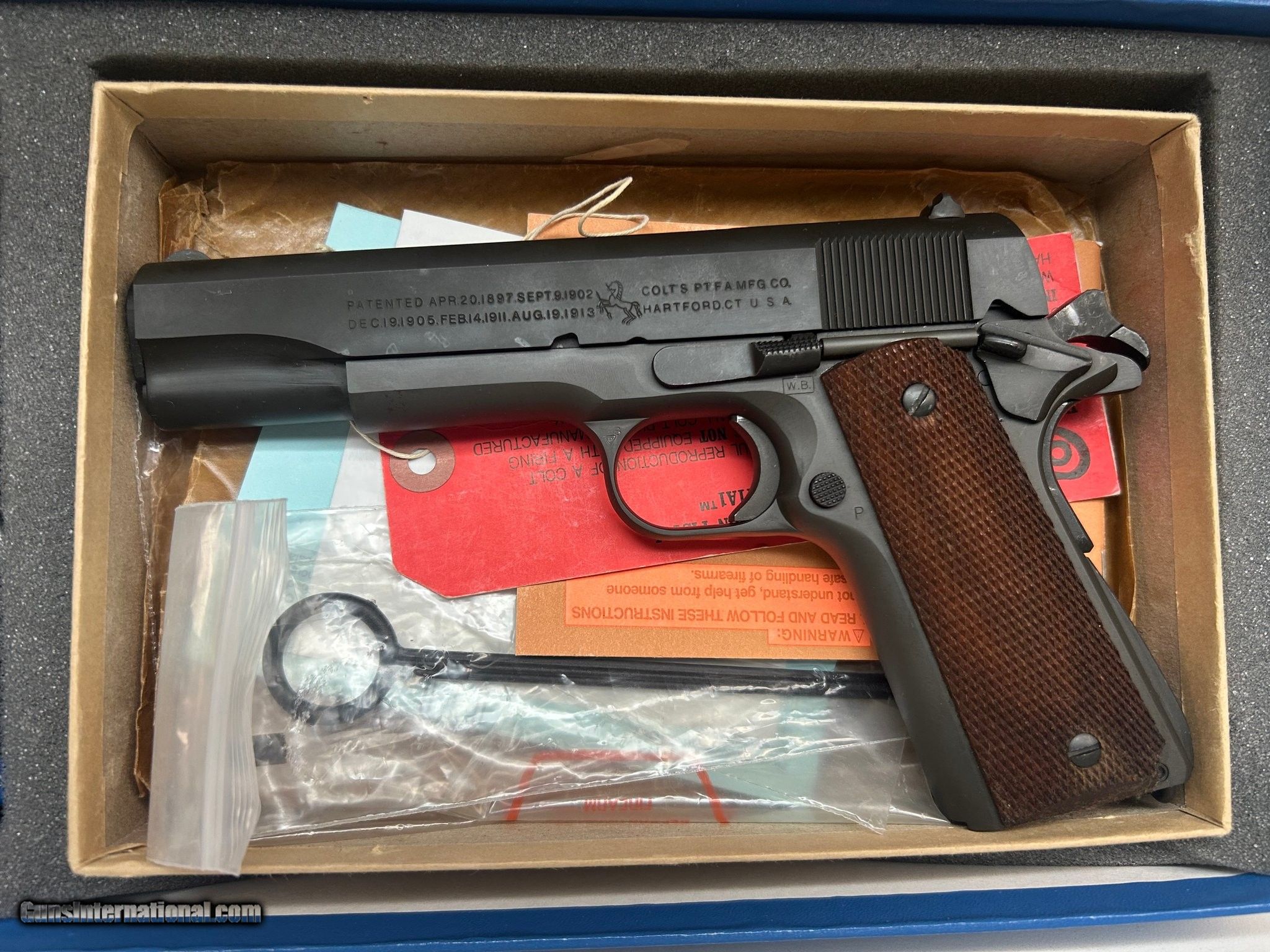 Description: Guns Listing ID: 586696 Model: Colt M1911 (original) / M1911A1 (modified A1). Caliber: .45 ACP (45 Auto). Barrel length: ~5.0 in. Overall length: ~8.5 in. Weight (unloaded): ~38–39 oz (˜2.4 lb). Action: single-action, short-recoil operated. Capacity: 7-round single-stack magazine (military issue). Typical slide marking: “PATENTED APR. 20 1897. SEPT. 9 1902…" (additional patent dates sometimes present). Inspector/acceptance marks: commonly stamped on frame/slide (examples: boxed inspector initials like W.B., arsenal marks, “U.S." cartouches, etc.). Adopted as the U.S. military sidearm in 1911 (M1911) and updated as the M1911A1 in 1924 with ergonomic changes (shorter trigger, arched mainspring housing, longer grip safety, simplified sights). Widely produced during WWI, WWII, Korea, Vietnam — many wartime Colts are parkerized or blued and carry inspector/acceptance stamps. Poor/fair (refinished, non-original parts, heavy wear): ~$800–$1,500 Good (original finish remaining, correct markings, mechanically sound): ~$1,500–$3,500 Very good/excellent (strong original finish, matching numbers, desirable inspector marks or early production): ~$3,500–$6,000+ Exceptional/trophy (early production, documented history, near-mint original): can exceed $8,000 depending on exact rarity and provenance. Serial number & date codes — tells production year/range. Matching numbers — slide/frame/barrel stamped with same serial block. Finish — original bluing, parkerizing, or reblue/refinish. % of finish left. Bore & mechanics — rifling condition, headspace, functionality. Markings — “UNITED STATES PROPERTY", inspector initials (e.g., W.B.), arsenal stamps, patent dates. (2) 8 RND MAGS in original box and papers. Manufacturer: COLT Model: 1911A1 US ARMY Caliber Info: .45 ACP Condition: Used - Non-Certified Barrels: 5" BARREL Action: SEMI AUTOMATIC Finish: black Price: $1,999.99 Contact Seller |