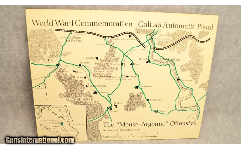 Description: This Colt 1917 World War I Commemorative 1967 .45 auto is in like new condition. It commemorates the Battle of Meuse-Argonne. There are no scratches or marks on this gun. It comes with the display case, informative panel with map and battle history, and original shipping box. This gun would be a fine addition to any collection at a good price. .45 Auto SOLD Barrels: 5 Weight: 2.5 lbs Item Location: Cheektowaga, NY |
