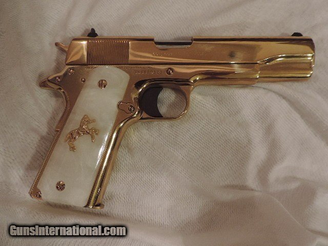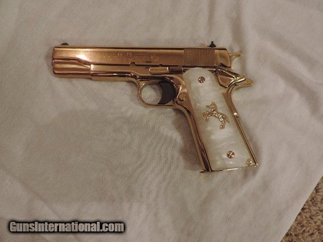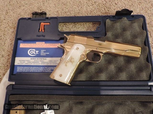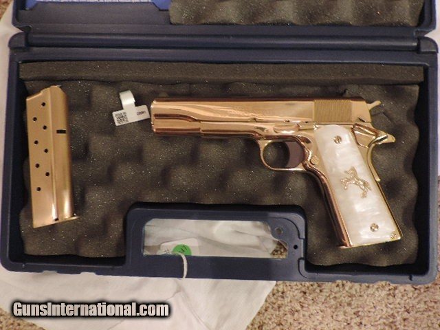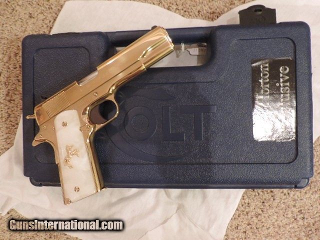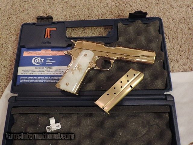 Description: COLT 1911 (CLTO2091G) 38 SUPER VERY RARE LEW HORTON EXCLUSIVE CUSTOM - GOLD PLATED BY BARON CUSTOM PEARLITE GRIPS WITH GOLD RAMPANT HORSE AND GOLD SCREWS. COMES WITH 2 GOLD MAGS. NEW IN BOX. SUBJECT TO PRIOR STORE SALE. SHIP TO FFL ONLY. BUYER RESPONSIBLE TO DETERMINE IF FIREARM IS LEGAL IN HIS/HER STATE. BUYER PAYS $75.00 SHIPPING & INSURANCE TO LOWER 48 STATES. BUYER PAYS 2% CREDIT CARD FEE. ARIZONA RESIDENTS PAY 6.712% SALES TAX. SOLD Manufacturer: COLT Model: O2091G Serial Number: 38SS1XXXX Caliber Info: 38 SUPER Condition: New in Box |