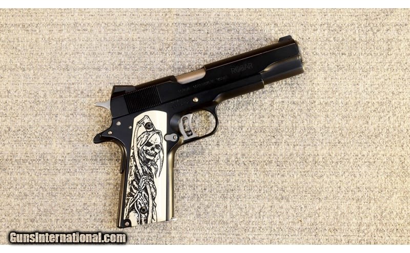 Description: This is a pre-owned Colt Combat Government in .45 ACP with match bushing, sights and Roguard finish installed by Robar plus extended safety and slide release .45 ACP SOLD Metal Condition: Very good with a few small scratches Wood Condition: Very good with a few small scratches Bore Condition: Clean with bright lands Barrels: 5 Triggers: SAO Butt Pad: Faux ivory with grim reaper Weight: 2 Lbs. 8 Oz. Sights: Trijicon 3-dot with Novak Lo Mount rear Item Location: Glendale, AZ |