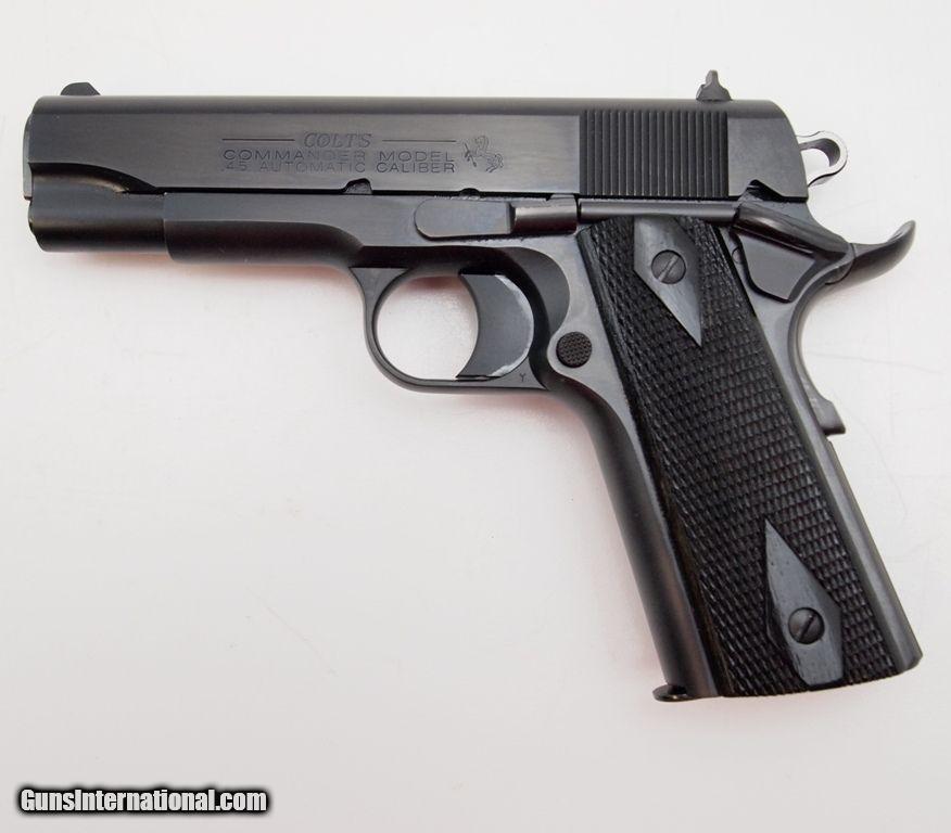 Description: Colt Commander Wbox .45 ACP, 4" bbl, bright shiny bore, good rifling, three white dot sights, black finish, and black checkered grips. Add 3% for Credit Card Shipping $25.00 SOLD |