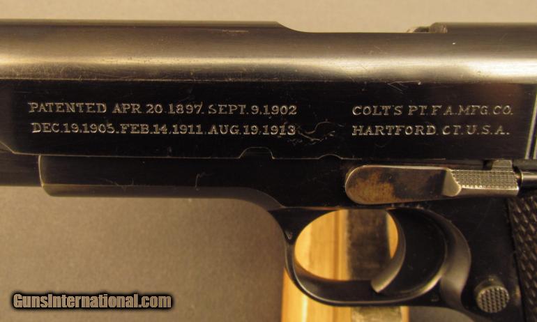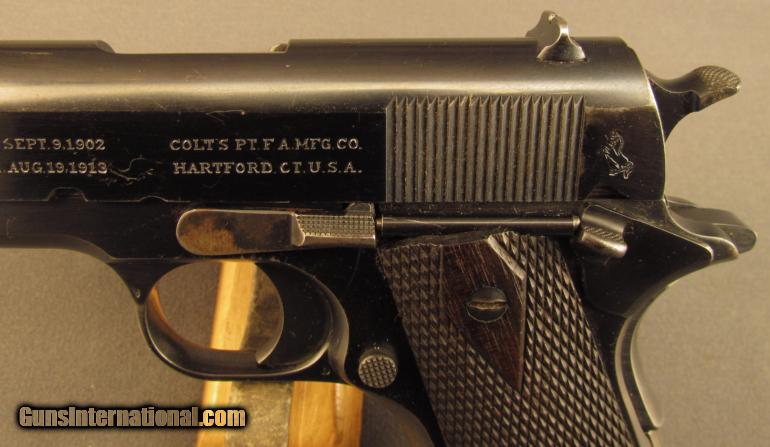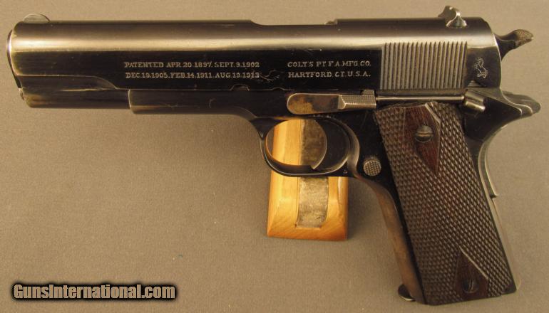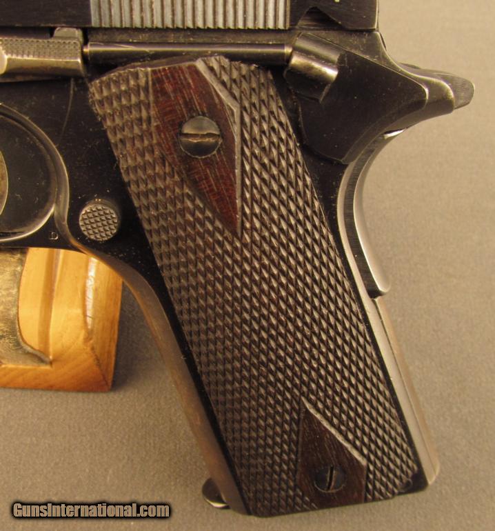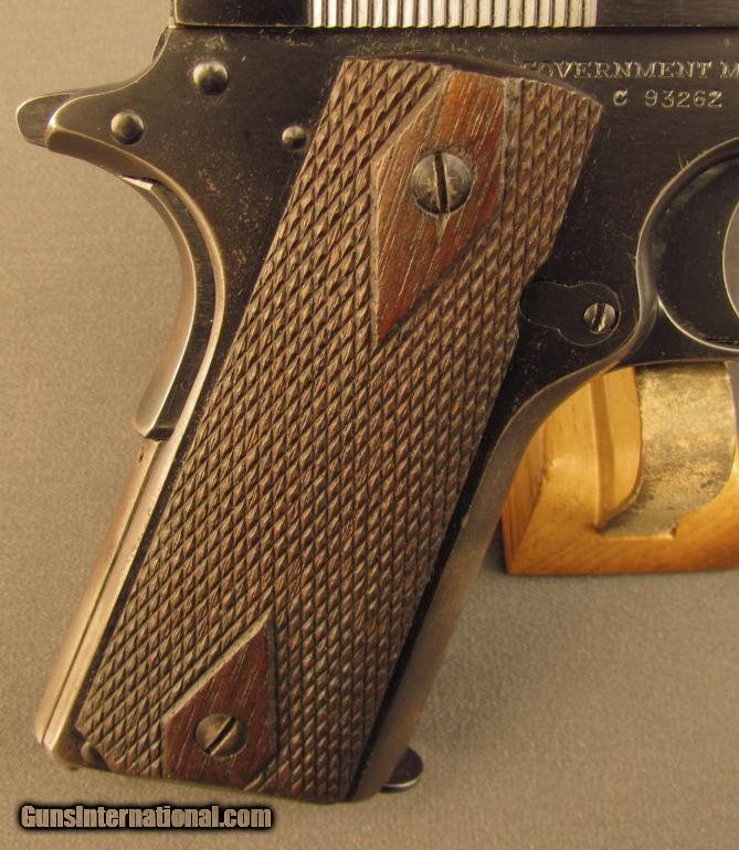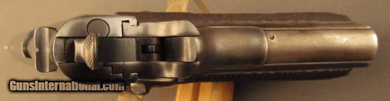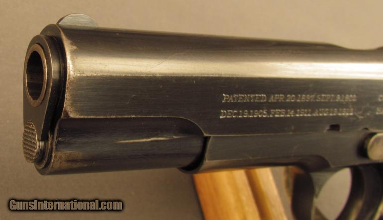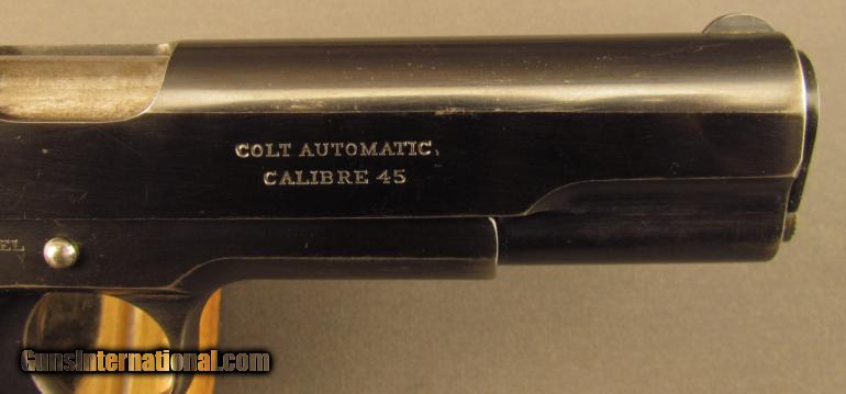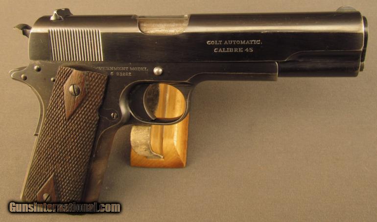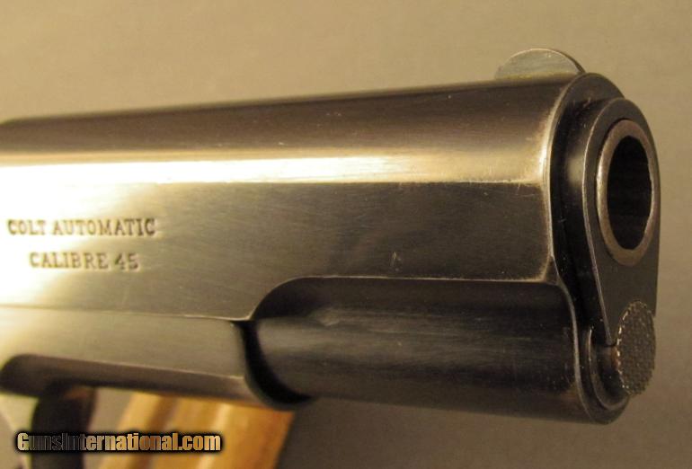 Description: Serial #C93262, .45 ACP, 5" barrel with an about good bore that has light-moderate pitting within the grooves. This is a 1917 manufactured pistol with that has a World War II era barrel but otherwise has correct component parts and retains 95% plus of the original blue finish which has silvered slightly along the exposed edges and projections. There is some further mild freckling along the top radius of the slide and some mild scratch marks on the left side of the frame around the slide latch which has a smooth mottled brown patina at the base. Likewise, there is a pale gray/brown patina forming on the flat mainspring housing, lightest towards the lanyard loop. The walnut double-diamond grips are in fine condition and have light wear on either side with some flattening of the points, mostly at the butt, and a few small handling marks here and there. A single two-tone magazine is included and the pistol rates fine condition overall; this is a lovely pistol with lots of original finish remaining and only needs a correct barrel to be complete and original. FFL or C&R SOLD Curio/Relic: Yes Manufacturer: Colt Model: 1911 Serial Number: C93262 Caliber Info: .45 ACP Gauge Info: .45 ACP |