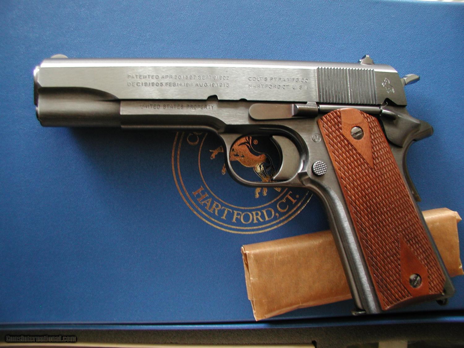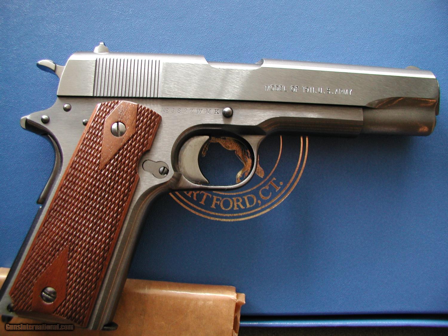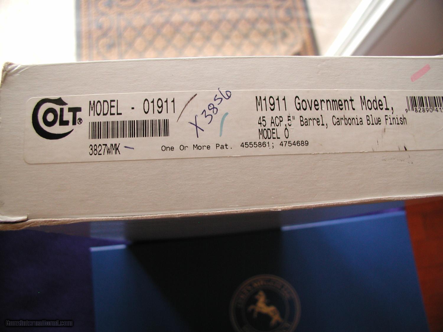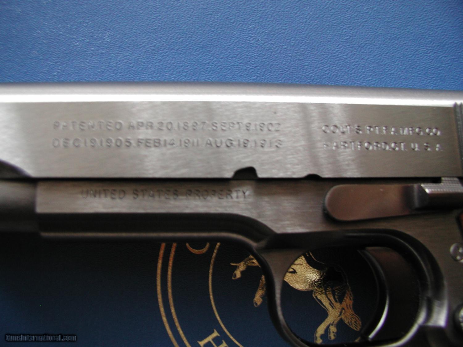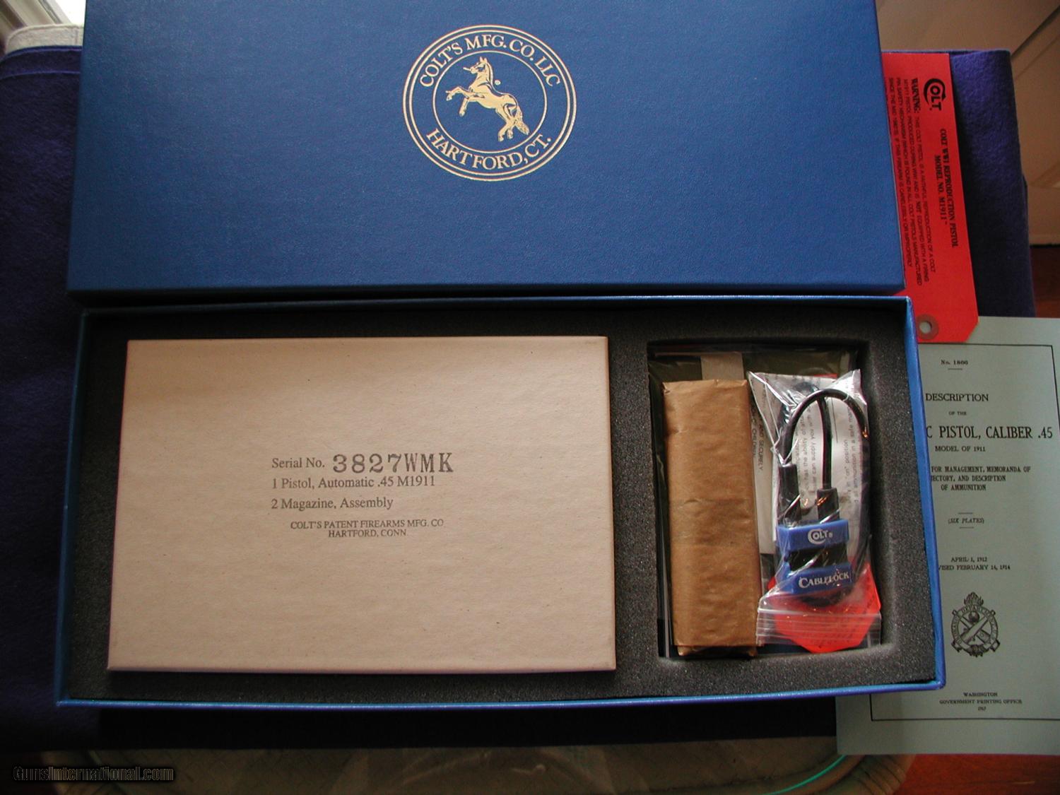 Description: *SOLD, PENDING ARRIVAL OF FUNDS* This Colt's 1911 WWI Reproduction pistol was manufactured at the Colt Custom Shop in approximately 2003. About 4000 pistols were made with production split between the less expensive black oxide guns and the historically correct Carbonia Blue units. This pistol retains 100% New In Box condition. It's markings and stamps are completely accurate and it is shipped in a unique reproduction of the original government shipping box, along with a repro manual and two magazines. This is packed into a Custom Shop box and then into the correct shipping sleeve. As with all original 1911's, this pistol features a five inch barrel, flat mainspring housing, lanyard loop and short trigger. More pictures are available upon request. Please remit funds by Postal Money Order and include $35.00 shipping/insurance to continental U.S., along with a signed copy of the license of the FFL you would like it shipped to. NO TRADES, PLEASE! ALL EMAILING/CORRESPONDENCE WILL BE THROUGH G/I'S SYSTEM. YOU MUST CONTACT ME TO CONFIRM YOUR INTENT TO PURCHASE AND THE MANNER OF PAYMENT. RETURNS ARE ACCEPTABLE ONLY IF THE FIREARM IS MISREPRESENTED. SHIPPING COST IS NOT REFUNDABLE. SOLD |