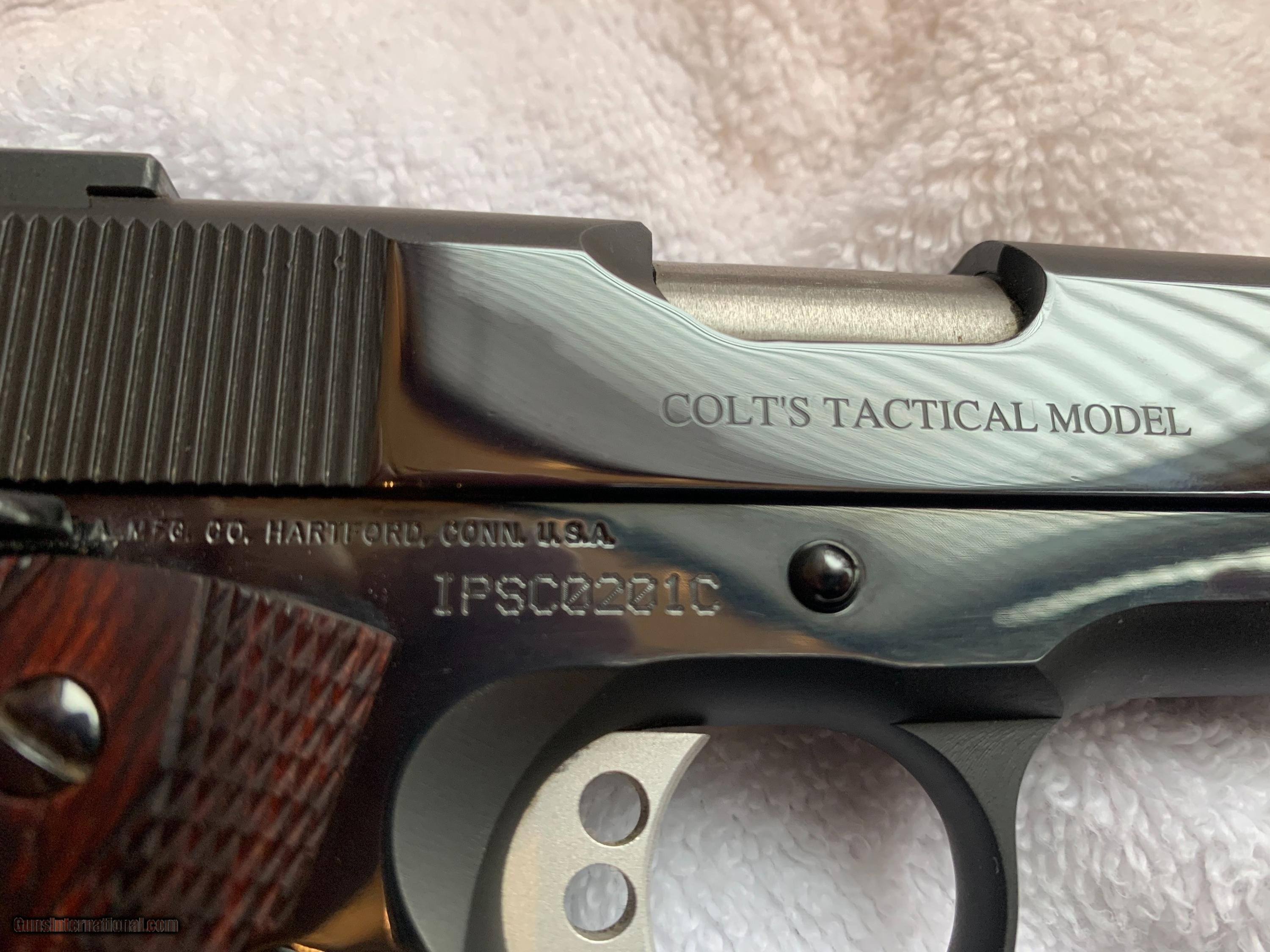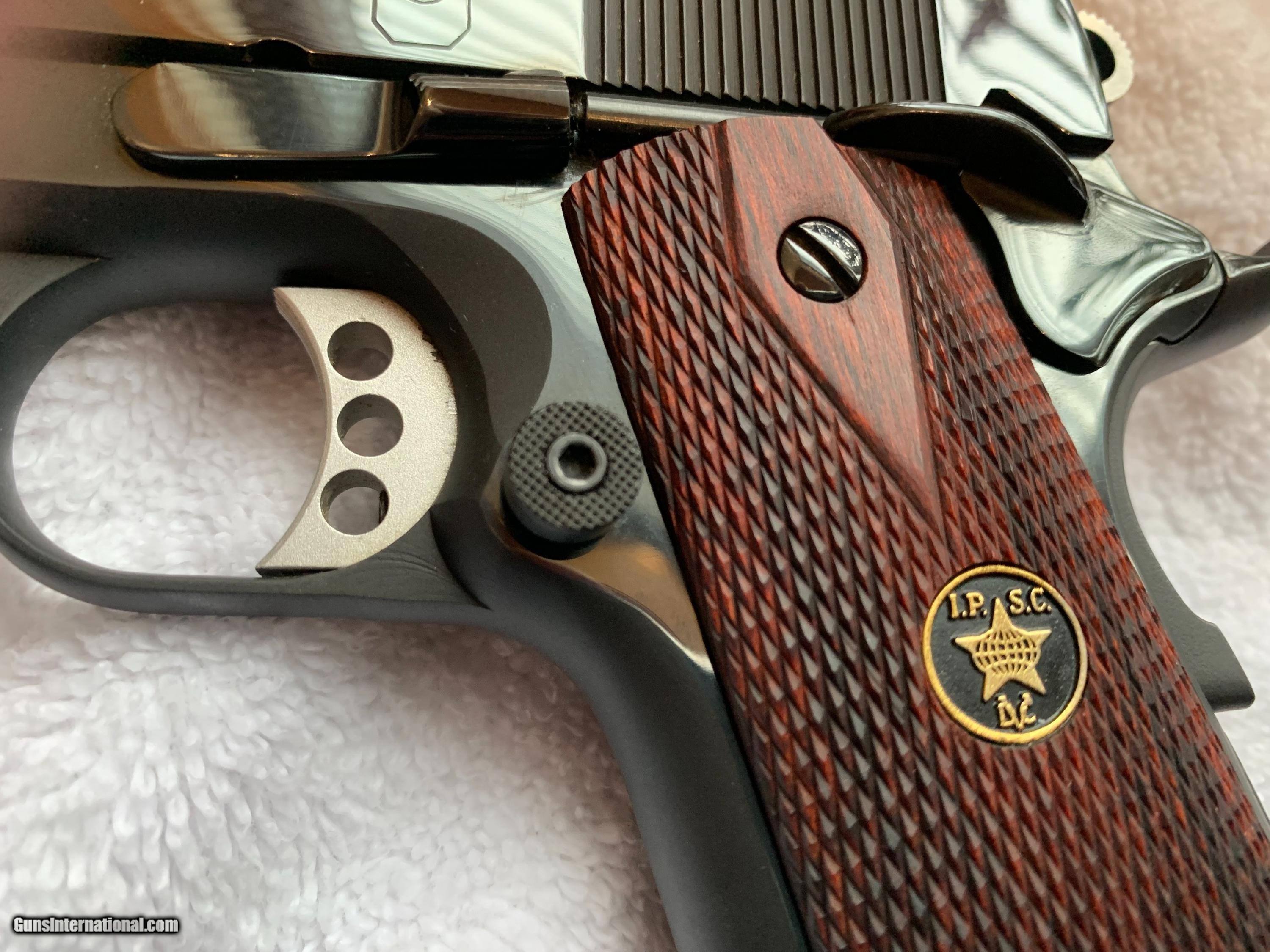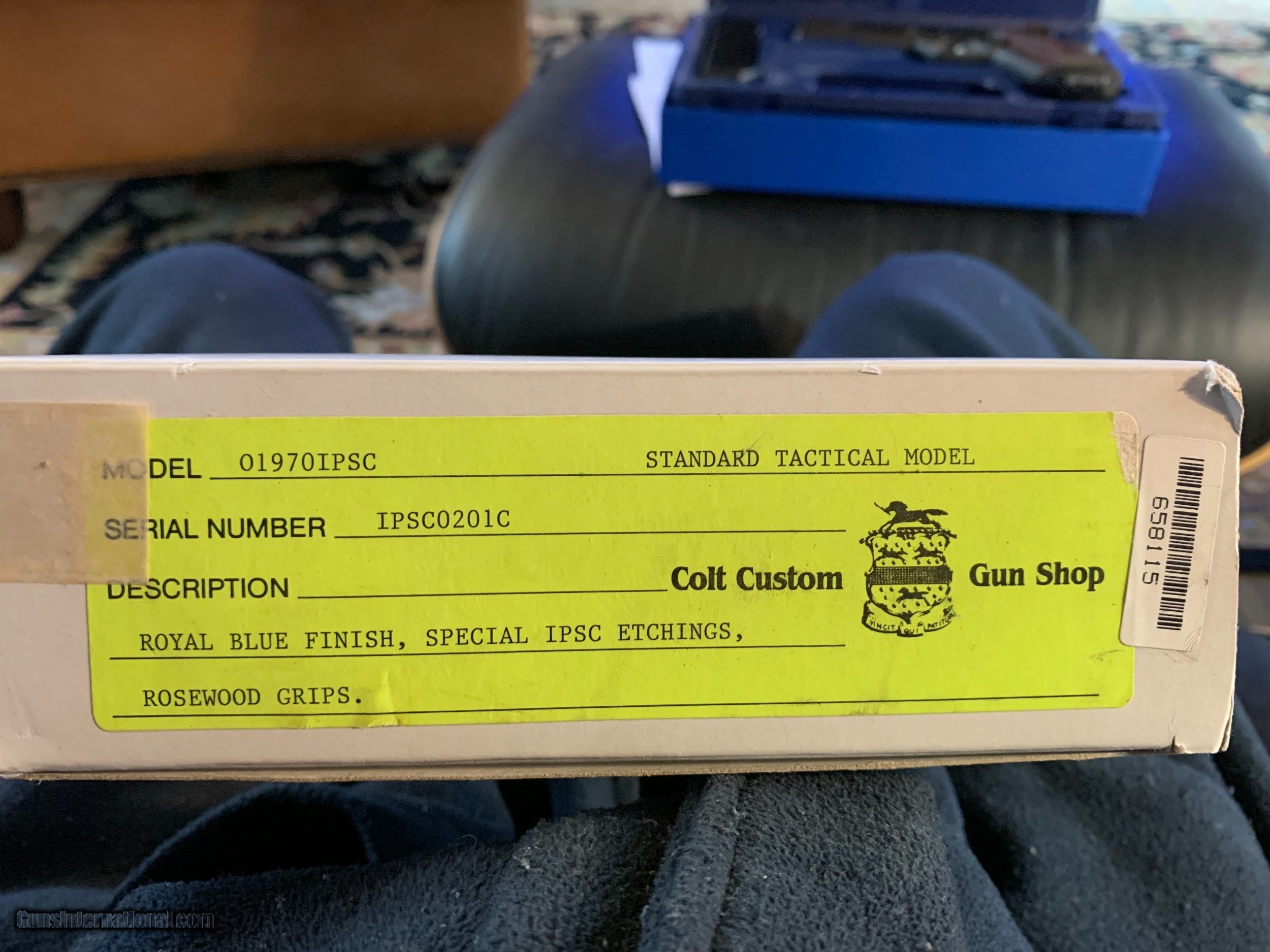 Description: SALE PENDING receipt of funds--Colt Custom Shop IPSC 20th Anniversary Model 45 ACP. Limited run of only 1500. Highly polished slide, frame and controls. Left side of slide roll marked with IPSC Anniiversary info. Right side says "Colt Tactical Model". Heinie front and rear sights. Extended ambi safety. S&A grip safety beautifully blended into frame. Checkered flat mainspring housing. Rosewood checkered grips with IPSC medallions. Two Colt magazines with bumper pads. All original in 99% like new condition with box and all papers. Thanks for looking. Payment by U S Postal money order. SOLD Rifle Caliber: .45 ACP Handgun Caliber: .45 ACP (.45 Auto) |